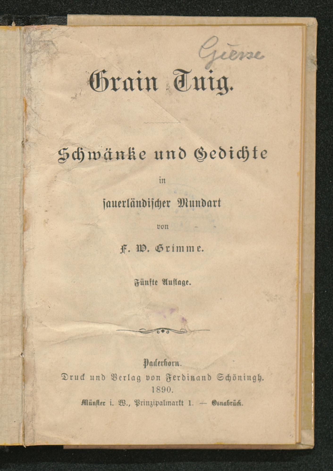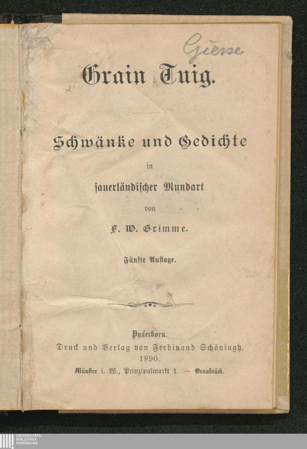 Grain Tuig : Schwänke und Gedichte in sauerländischer Mundart / von F. W. Grimme