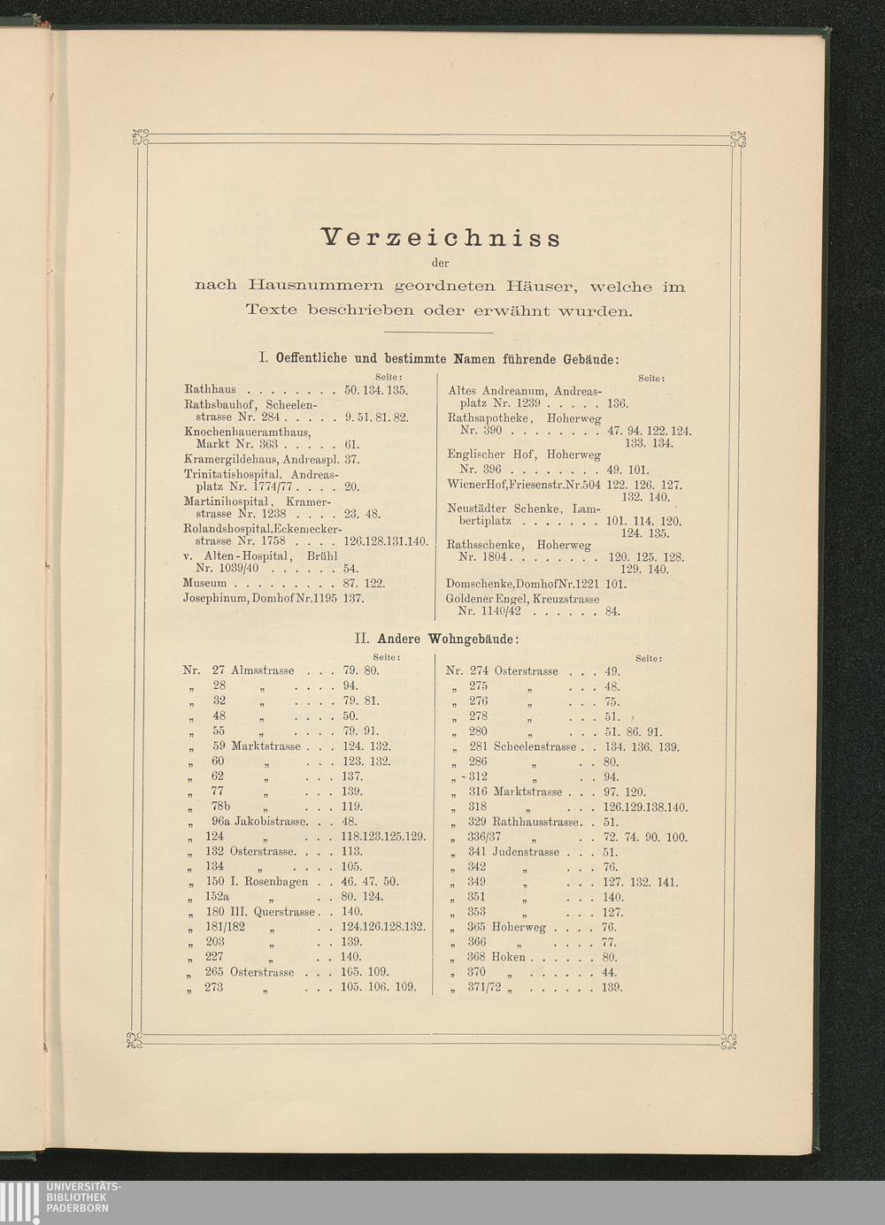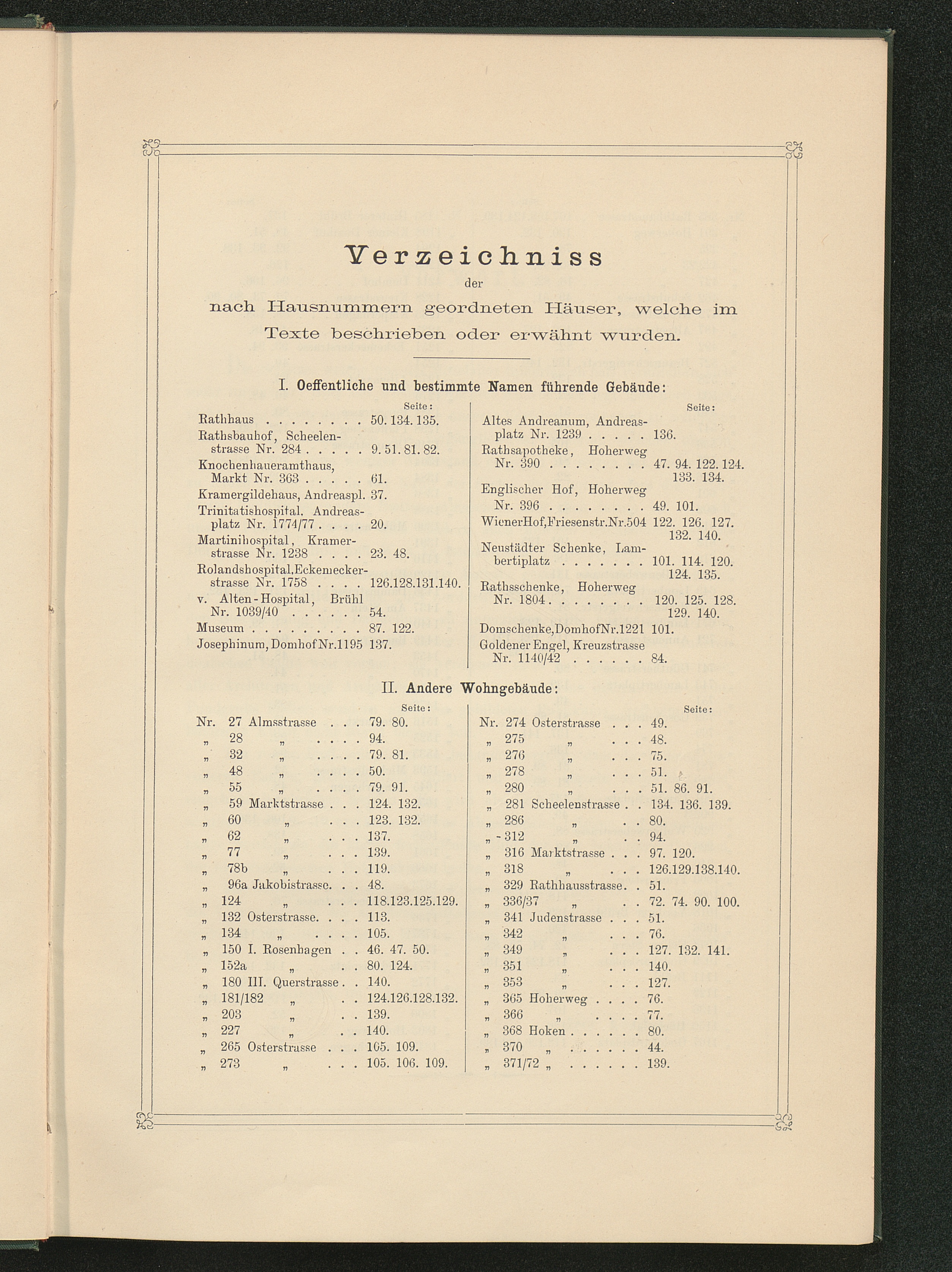 Verzeichniss der nach Hausnummern geordneten Häuser, welche im Texte beschrieben oder erwähnt wurden.