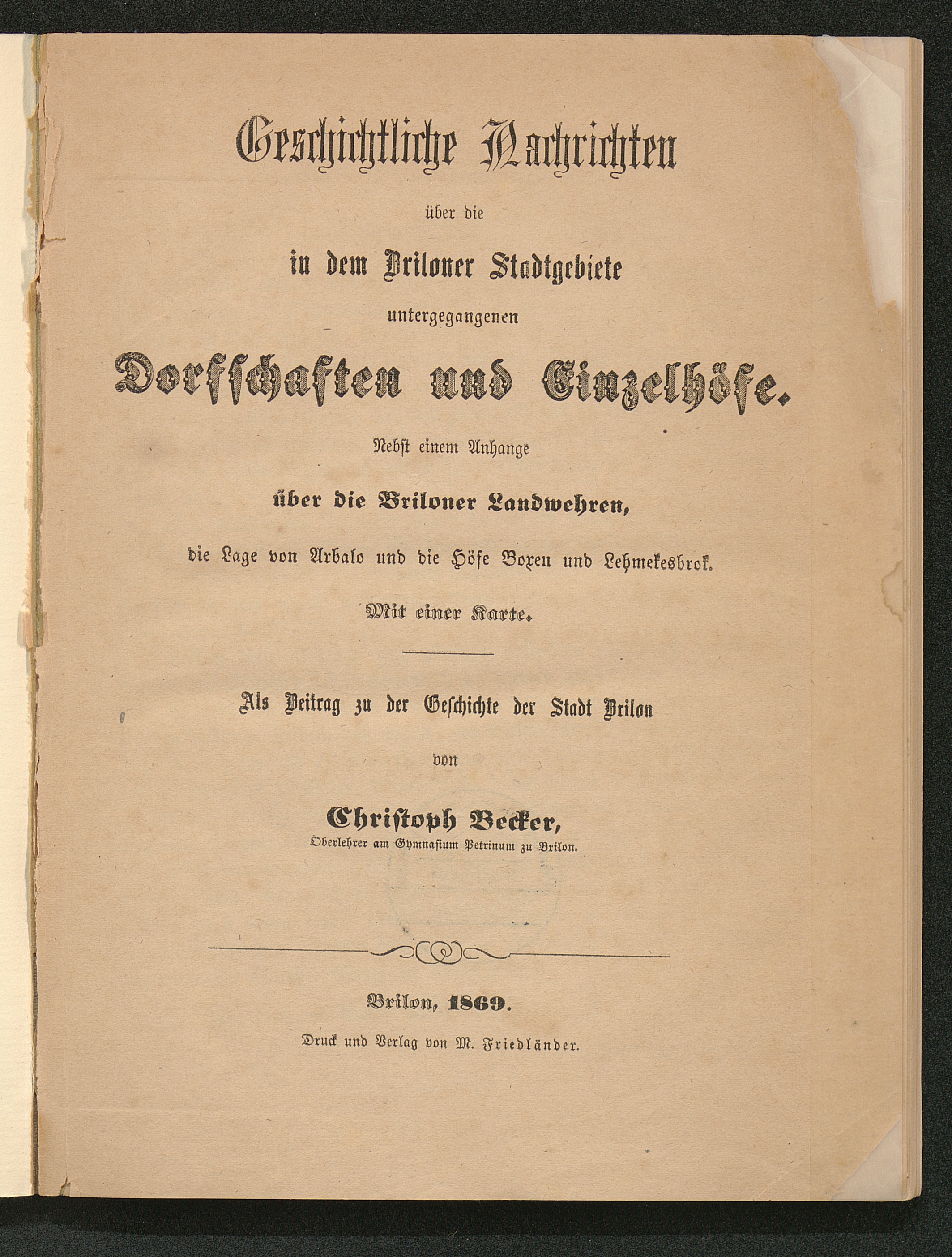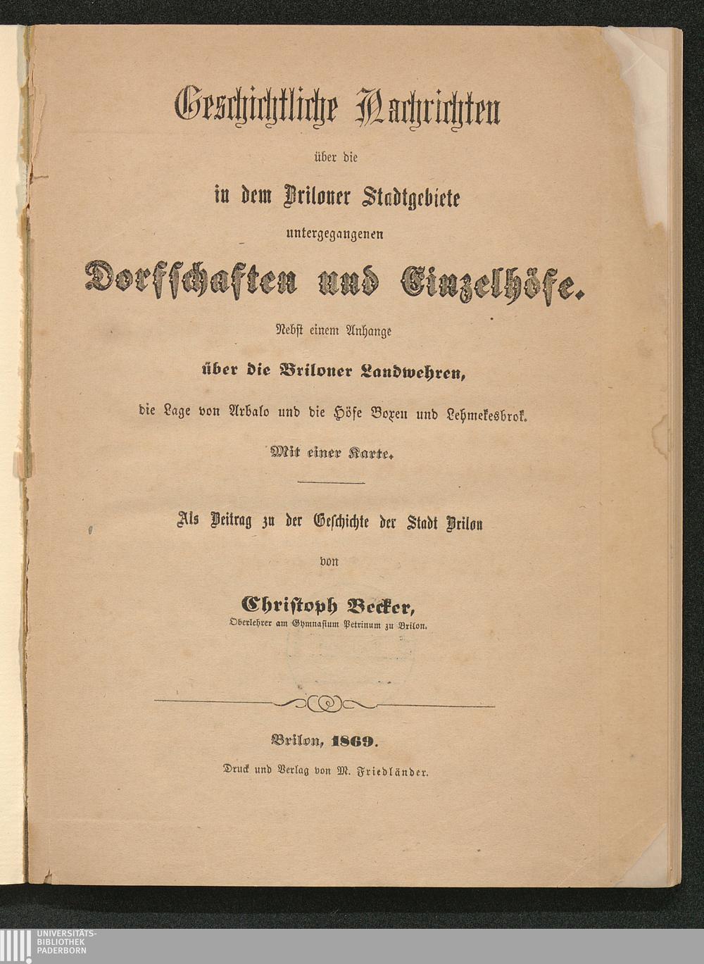 Geschichtliche Nachrichten über die in dem Briloner Stadtgebiete untergegangenen Dorfschaften und Einzelhöfe : nebst einem Anhange über die Briloner Landwehren, die Lage von Arbalo und die Höfe Boxen und Lehmekesbrok ; als Beitrag zur Geschichte der Stadt Brilon / von Christoph Becker