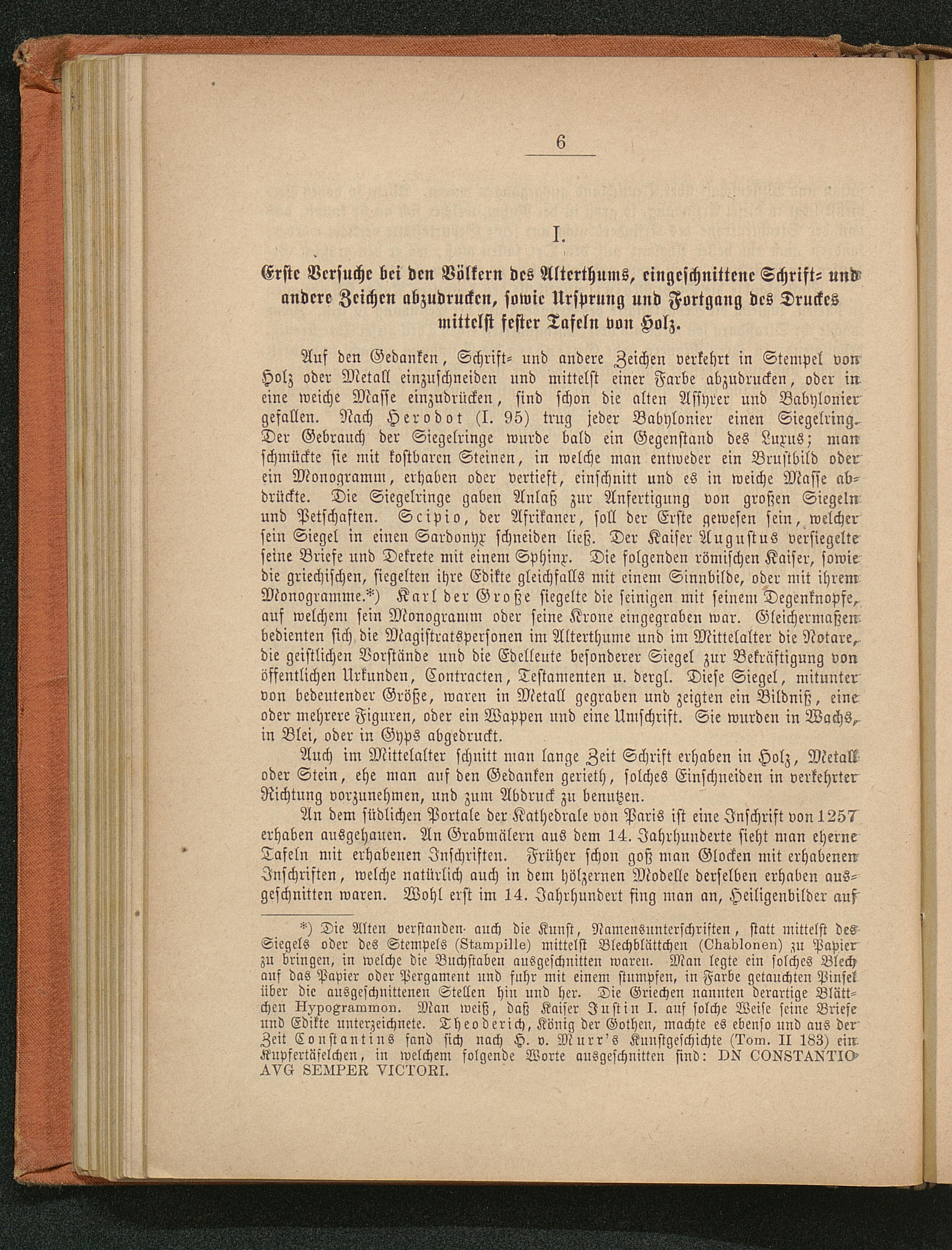 I. Erste Versuche bei den Völkern des Alterthums, eingeschnittene Schrift- und andere Zeichen abzudrucken, sowie Ursprung und Fortgang des Druckes mittelst fester Tafeln von Holz.
