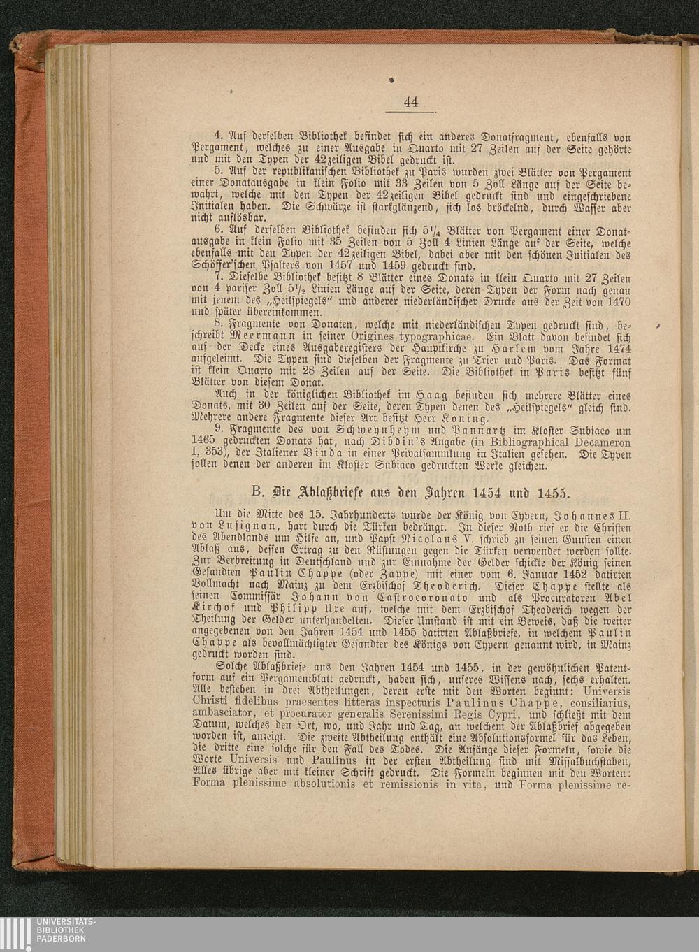 D. Die undatirte lateinische, 42zeilige Bibel, welche im Jahre 1455 im Drucke vollendet wurde.