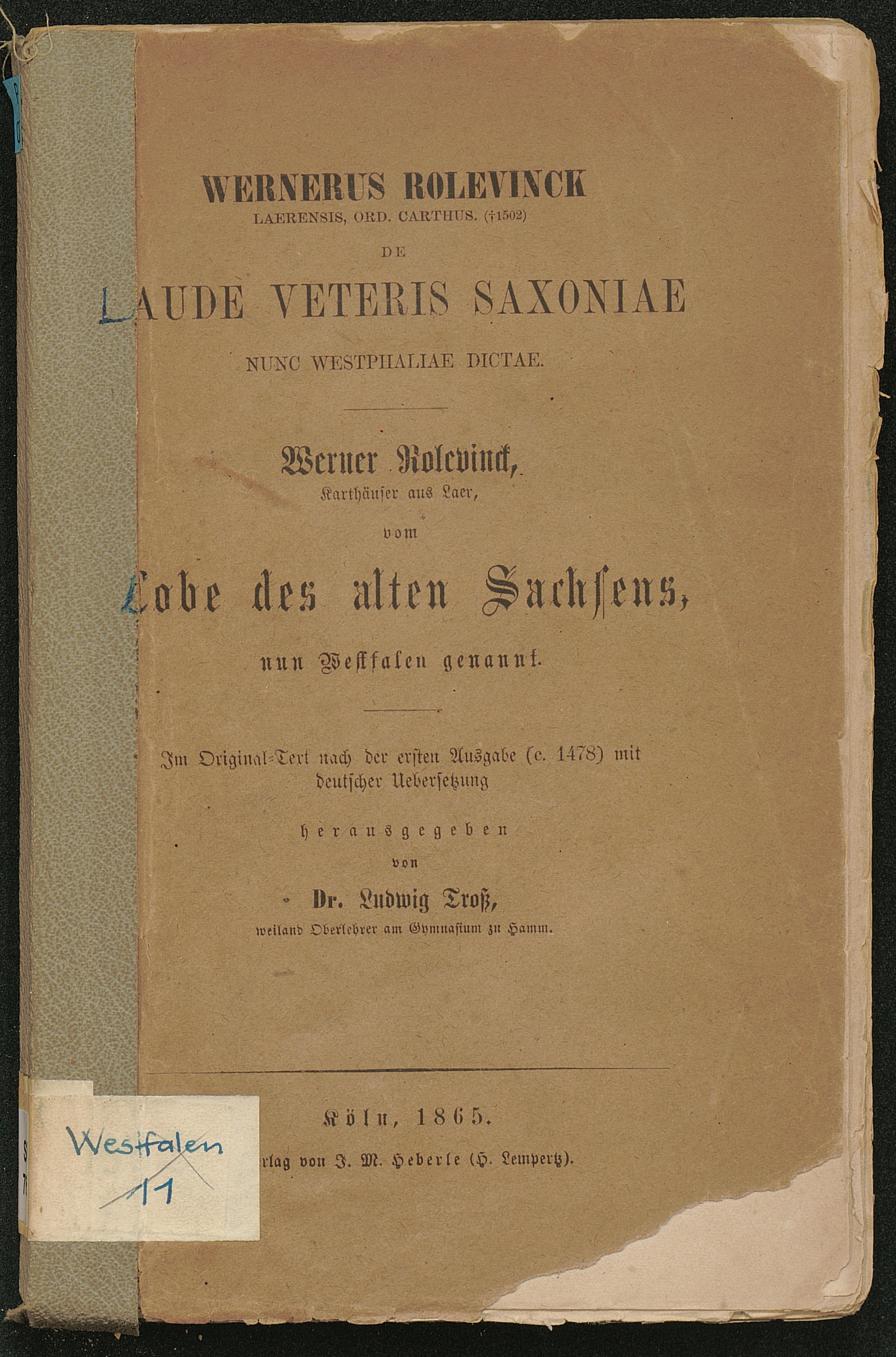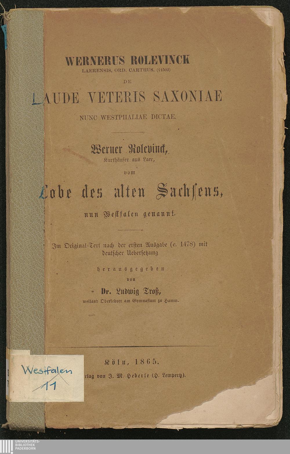 Vom Lobe des alten Sachsens, nun Westfalen genannt / Werner Rolevinck. Im Orig.-Text nach d. 1. Ausg. (c. 1478) mit dt. Übers. hrsg. von Ludwig Troß