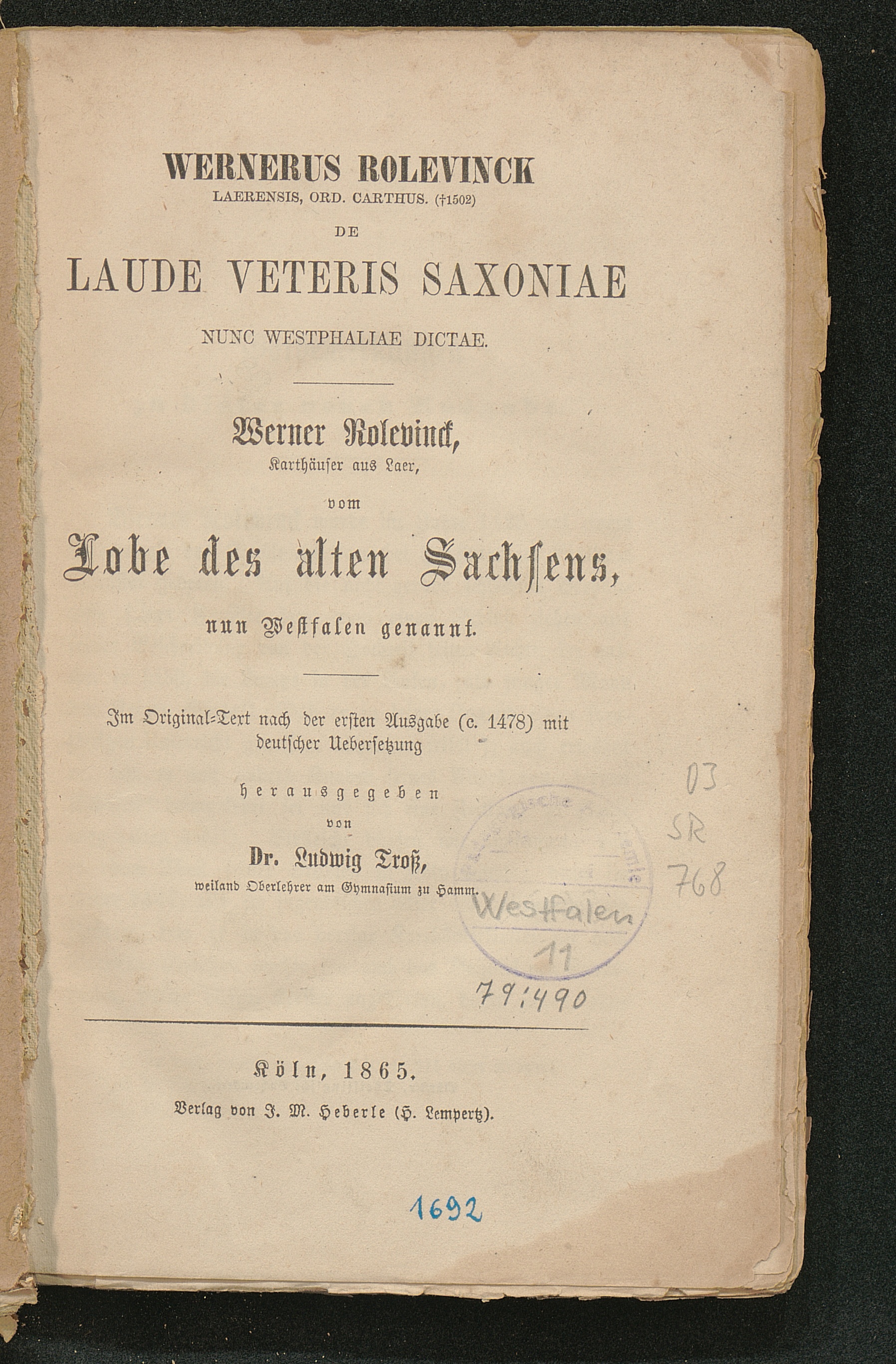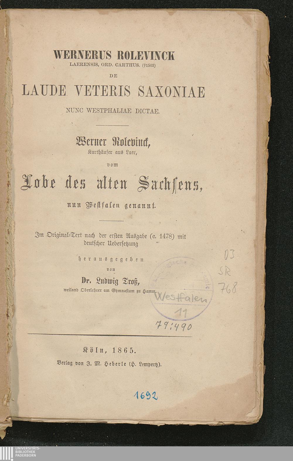 Vom Lobe des alten Sachsens, nun Westfalen genannt / Werner Rolevinck. Im Orig.-Text nach d. 1. Ausg. (c. 1478) mit dt. Übers. hrsg. von Ludwig Troß