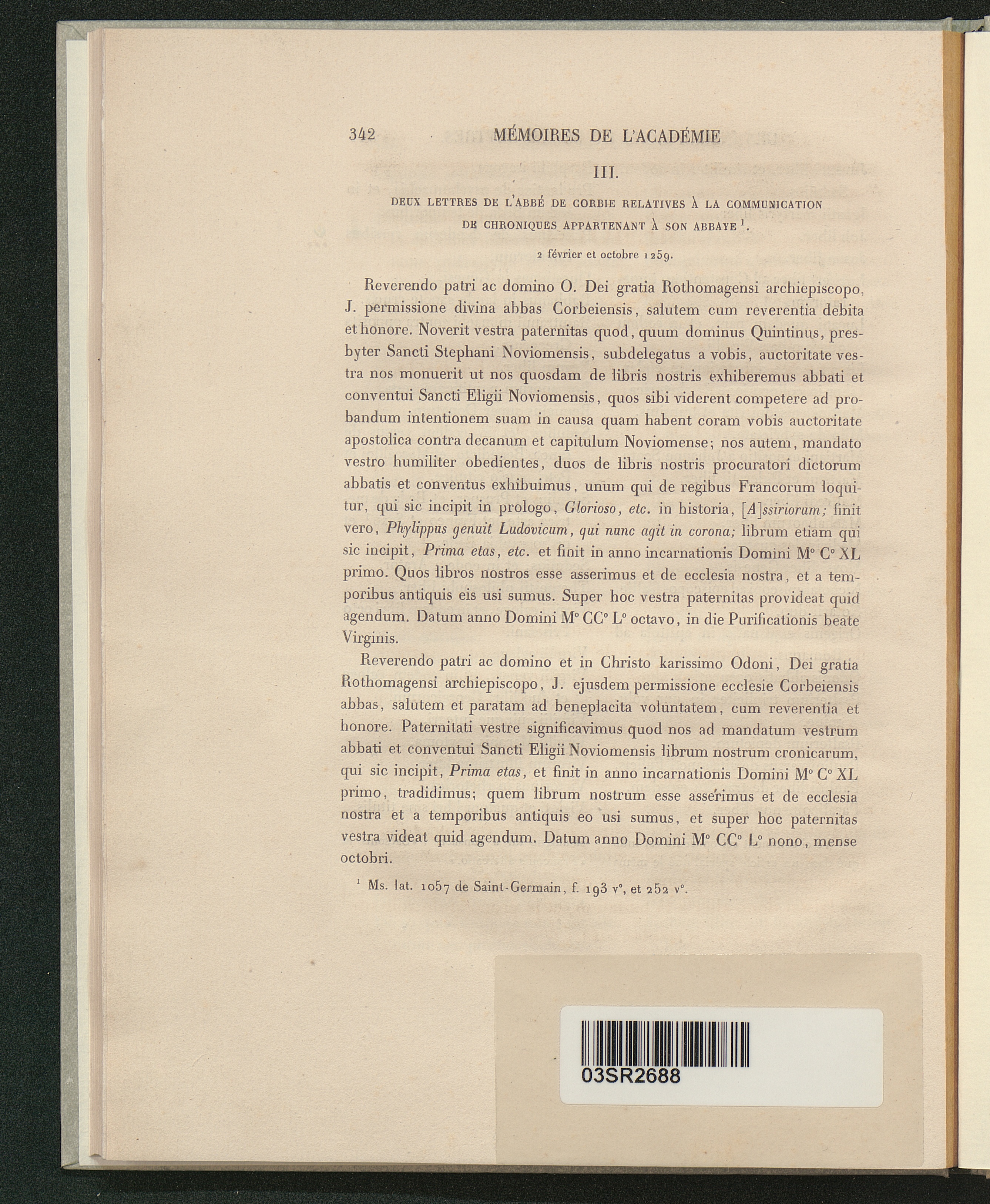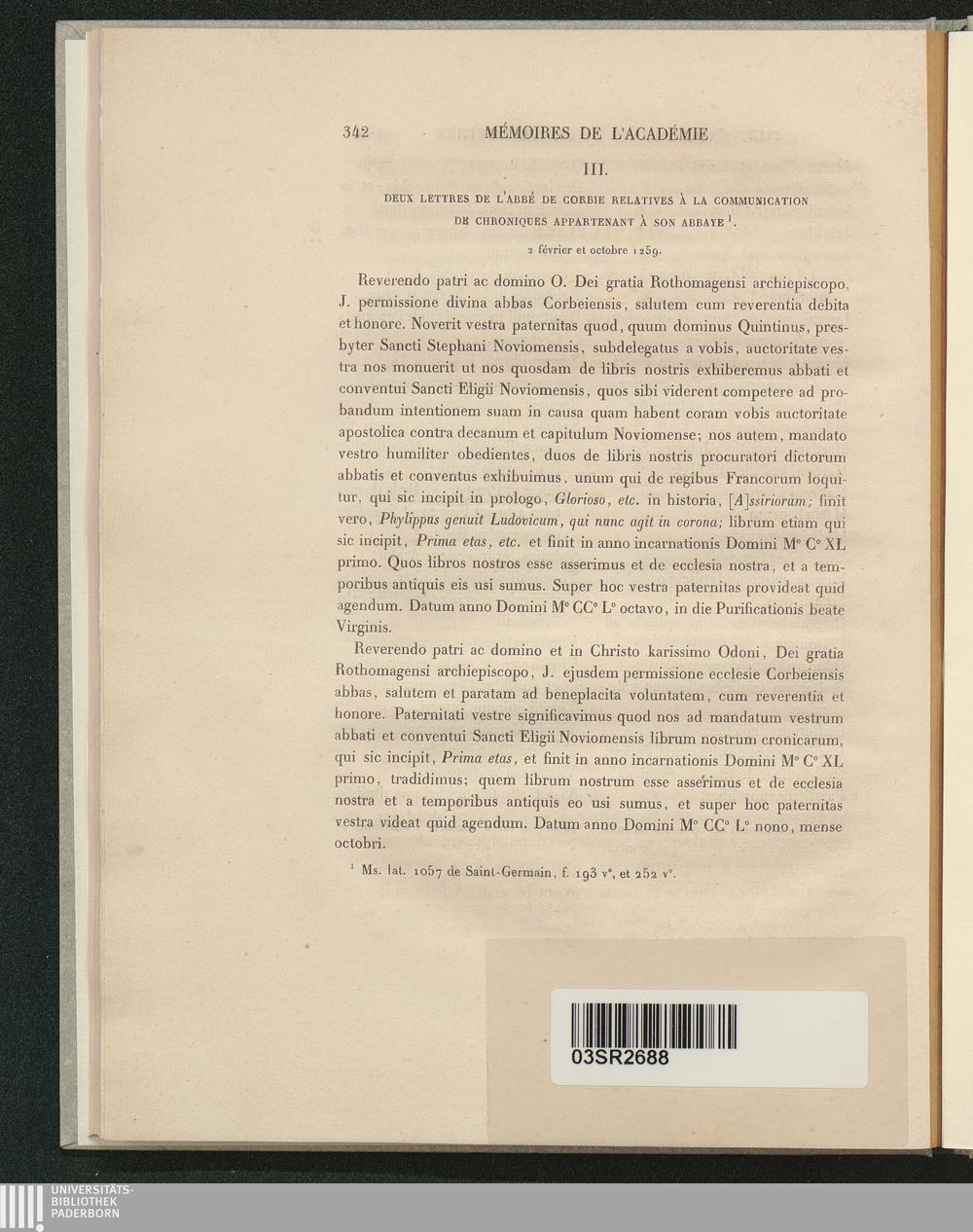 III. Deux lettres de l'abbé de Corbie relatives à la communication de chroniques[...]