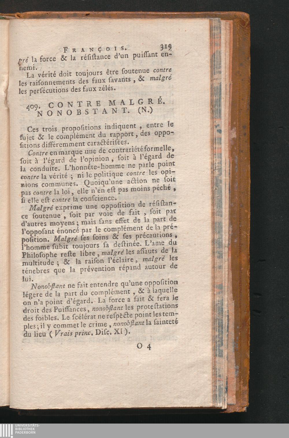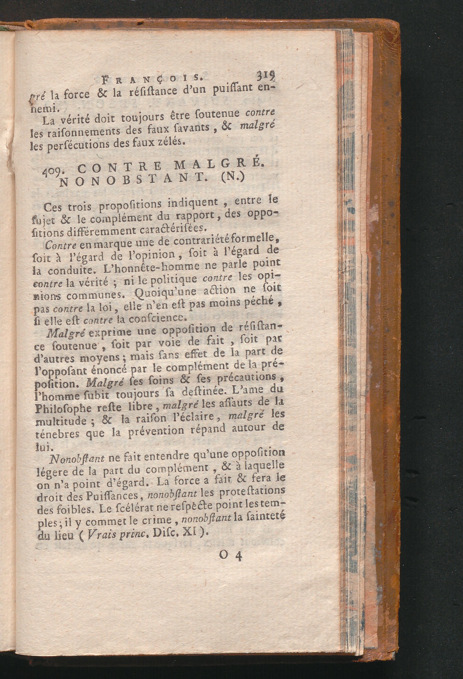 409. Contre Malgré. Nonobstant. (N.)