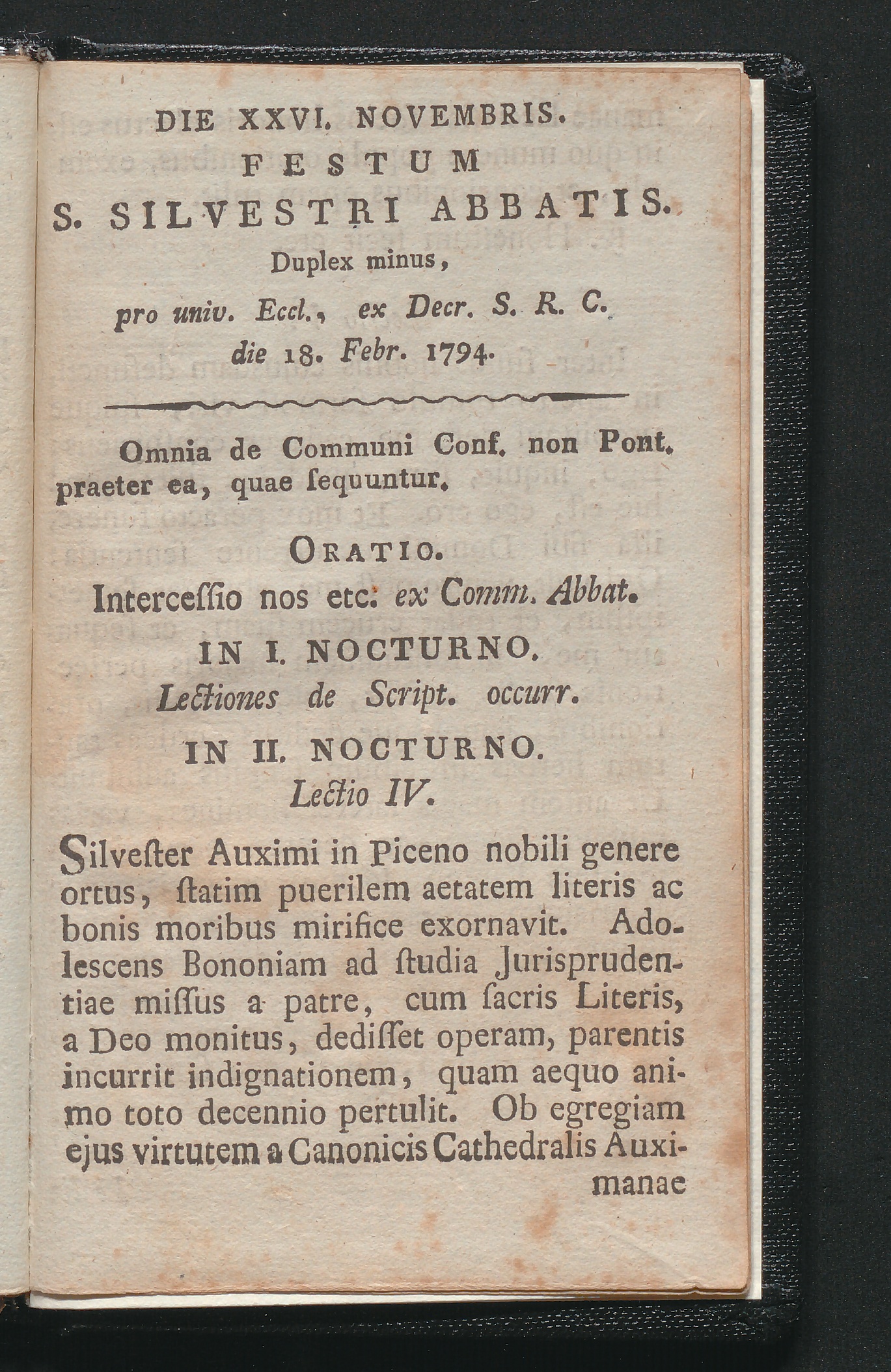 Die XXVI. Novembris. Festum S. Silvestri Abbatis. : Duplex minus, pro univ. Eccl., ex Decr. S.R.C. die 18. Febr. 1794