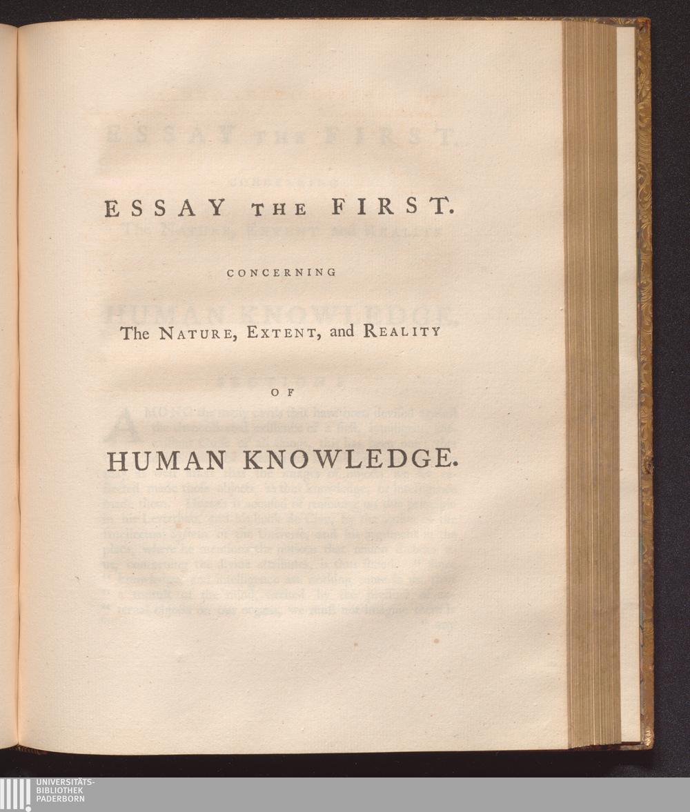 Essay I. Conserning the nature, extent, and reality of human knowledge.
