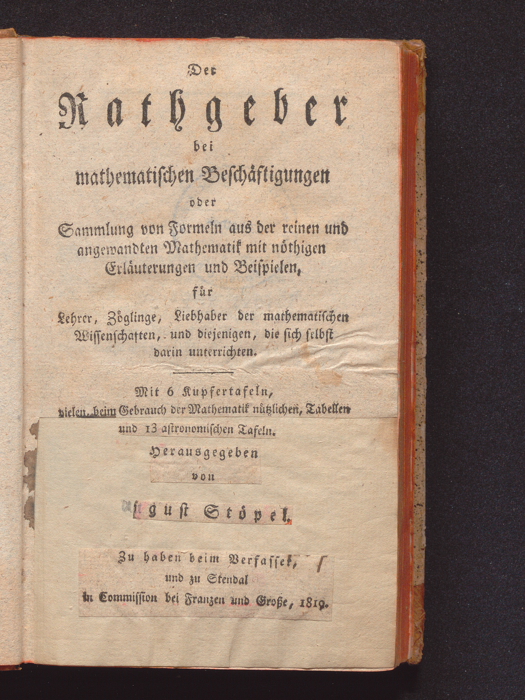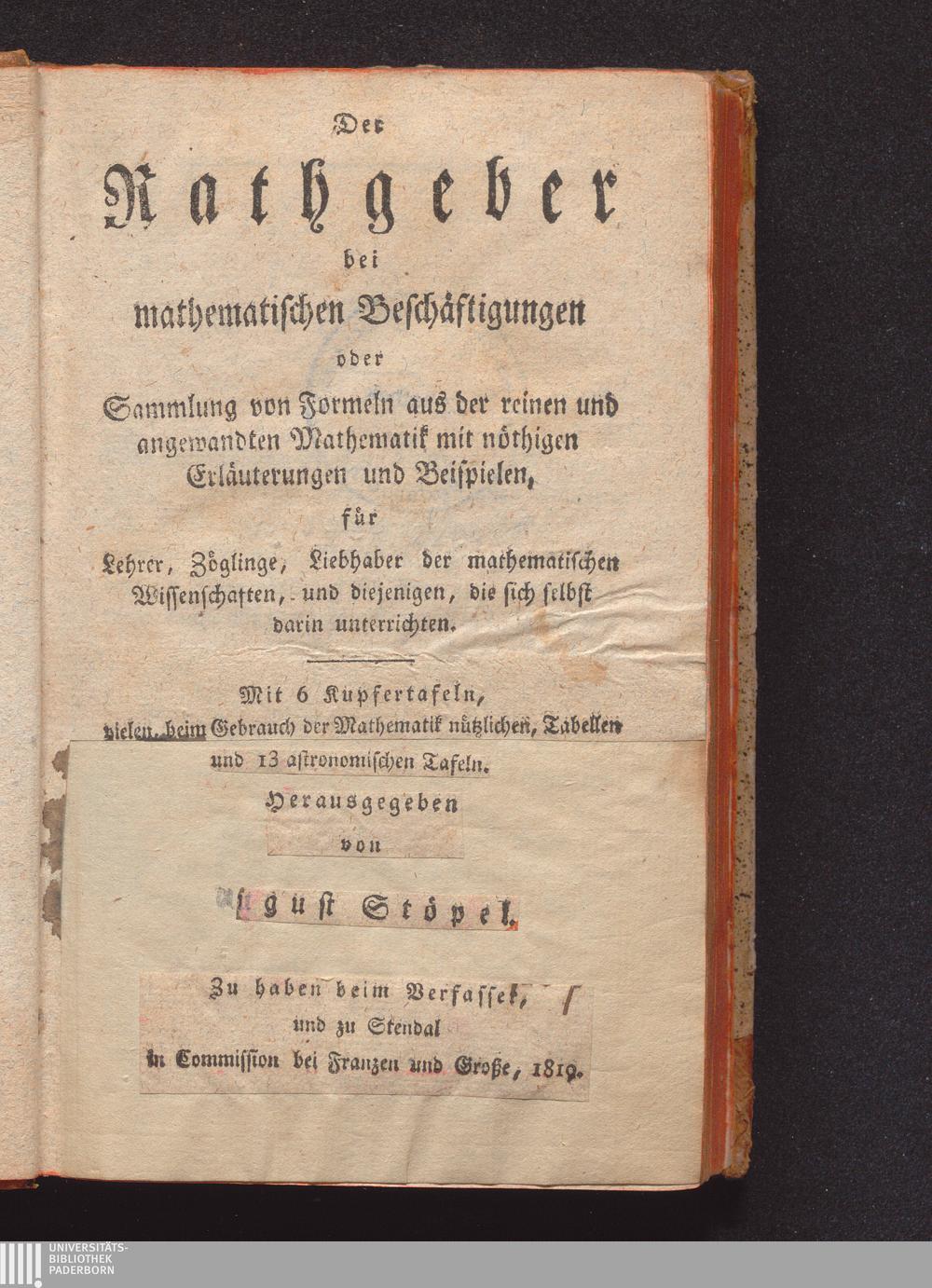 Der Rathgeber bei mathematischen Beschäftigungen : oder Sammlung von Formeln aus der reinen und angewandten Mathematik mit nöthigen Erläuterungen und Beispielen, für Lehrer, Zöglinge, Liebhaber der mathematischen Wissenschaften, und diejenigen, die sich selbst darin unterrichten ; Mit 6 Kupfertafeln, vielen, beim Gebrauch der Mathematik nützlichen, Tabellen und 13 astronomischen Tafeln / Herausgegeben von August Stöpel