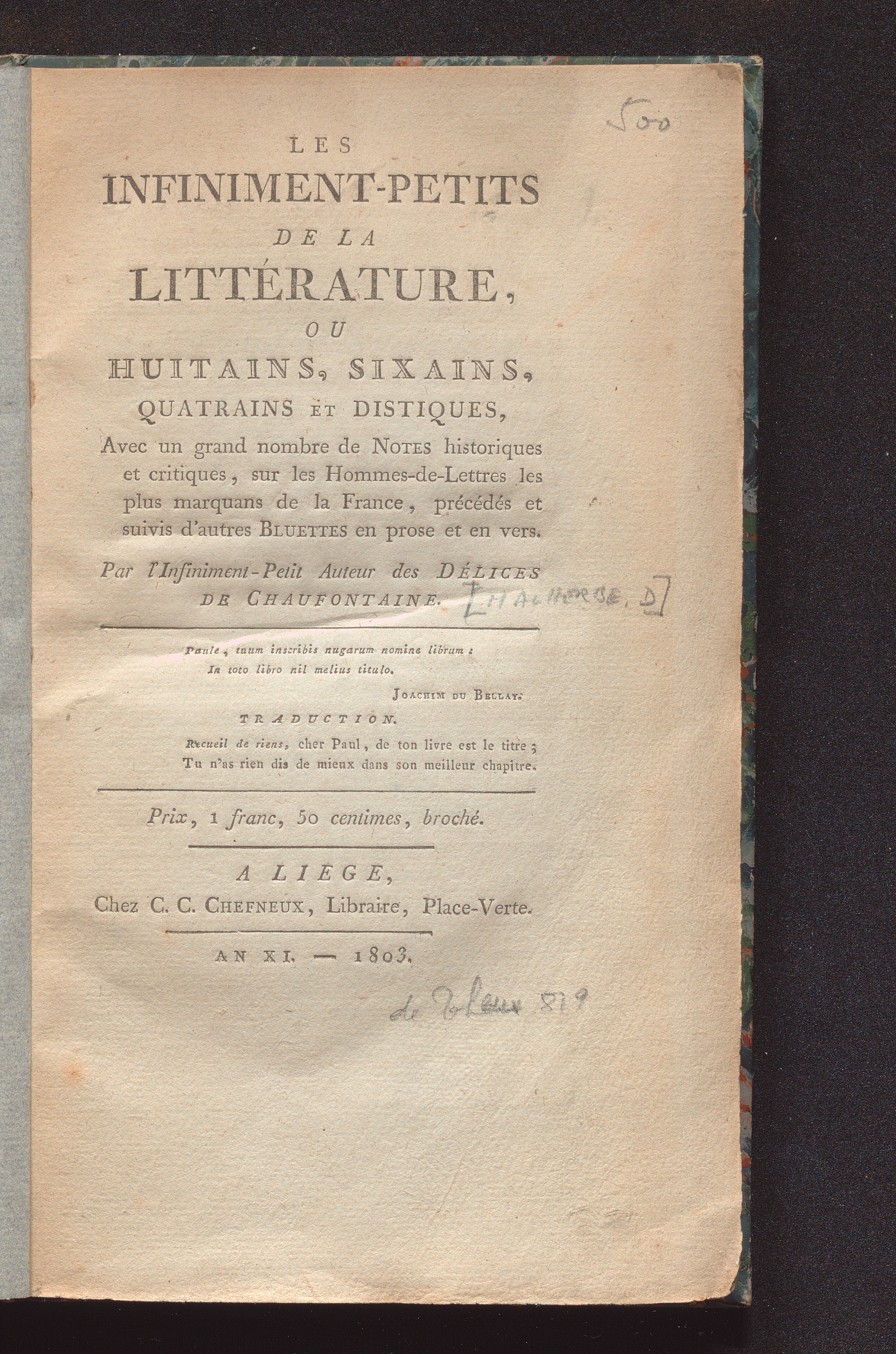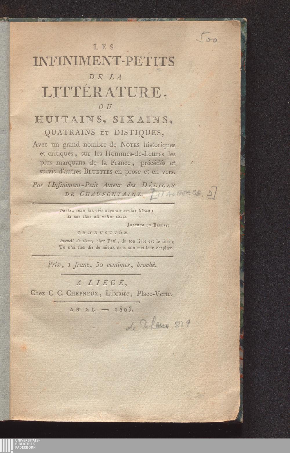 Les infiniment-petits de la littérature, ou huitains, sixains, quatrains et distiques : avec un grand nombre de notes historiques et critiques, sur les hommes-de-lettres les plus marquans de la France, précédés et suivis d'autres bluettes en prose et en vers / par l'ininiment-petit auteur des Délices de Chaufontaine