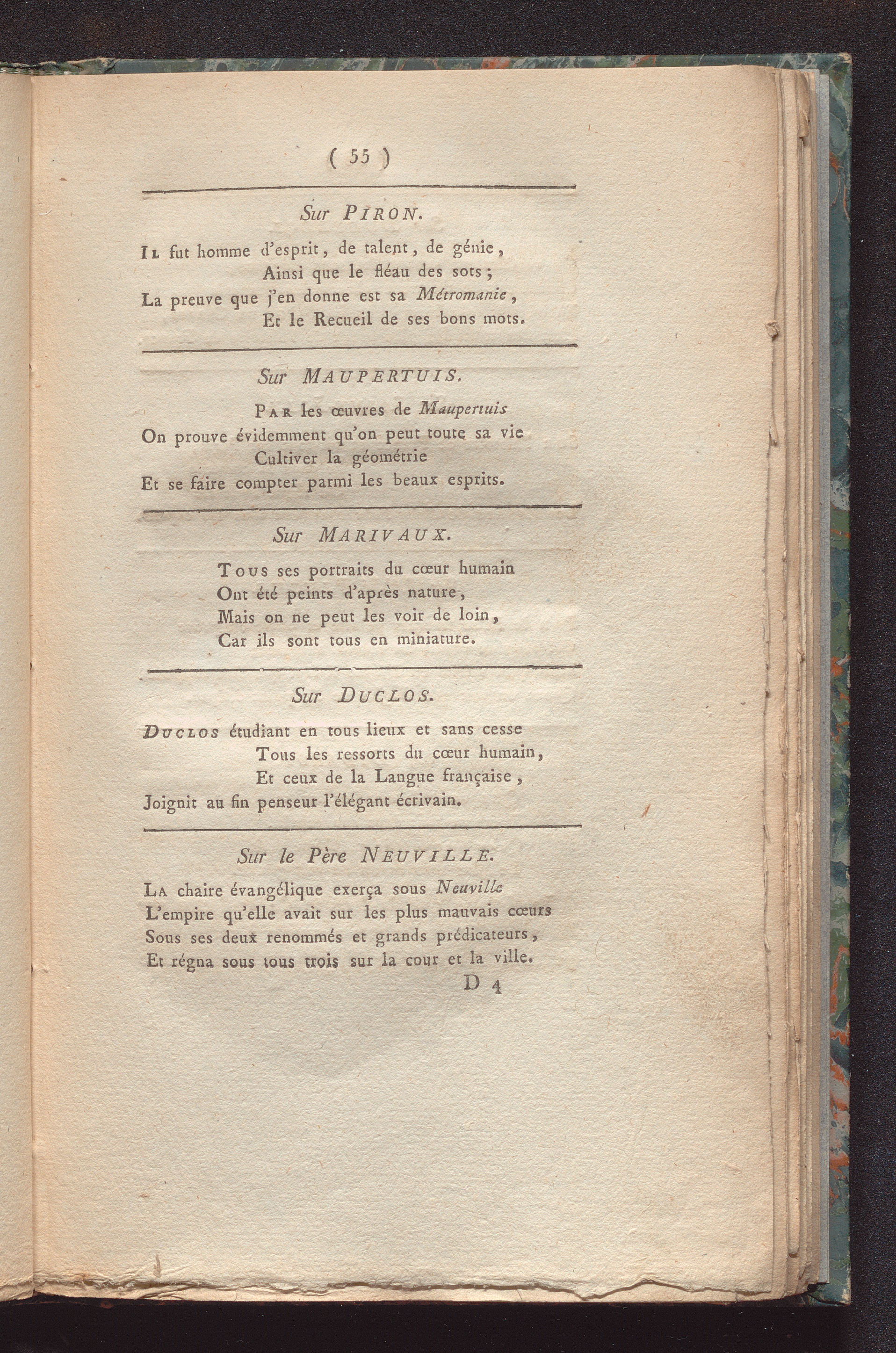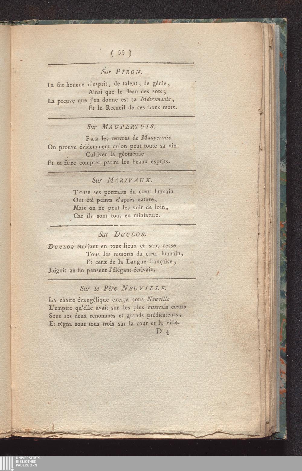Les infiniment-petits de la littérature, ou huitains, sixains, quatrains et distiques : avec un grand nombre de notes historiques et critiques, sur les hommes-de-lettres les plus marquans de la France, précédés et suivis d'autres bluettes en prose et en vers / par l'ininiment-petit auteur des Délices de Chaufontaine
