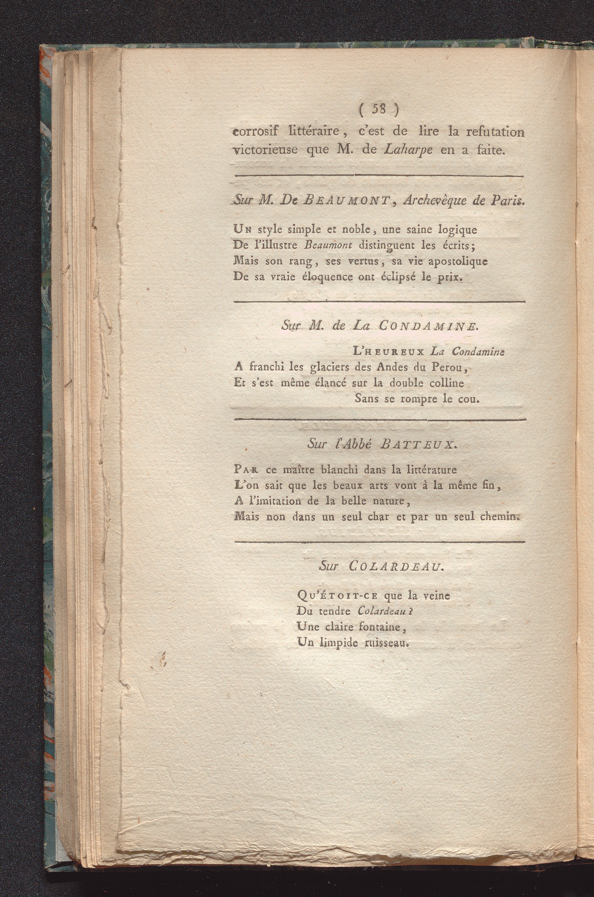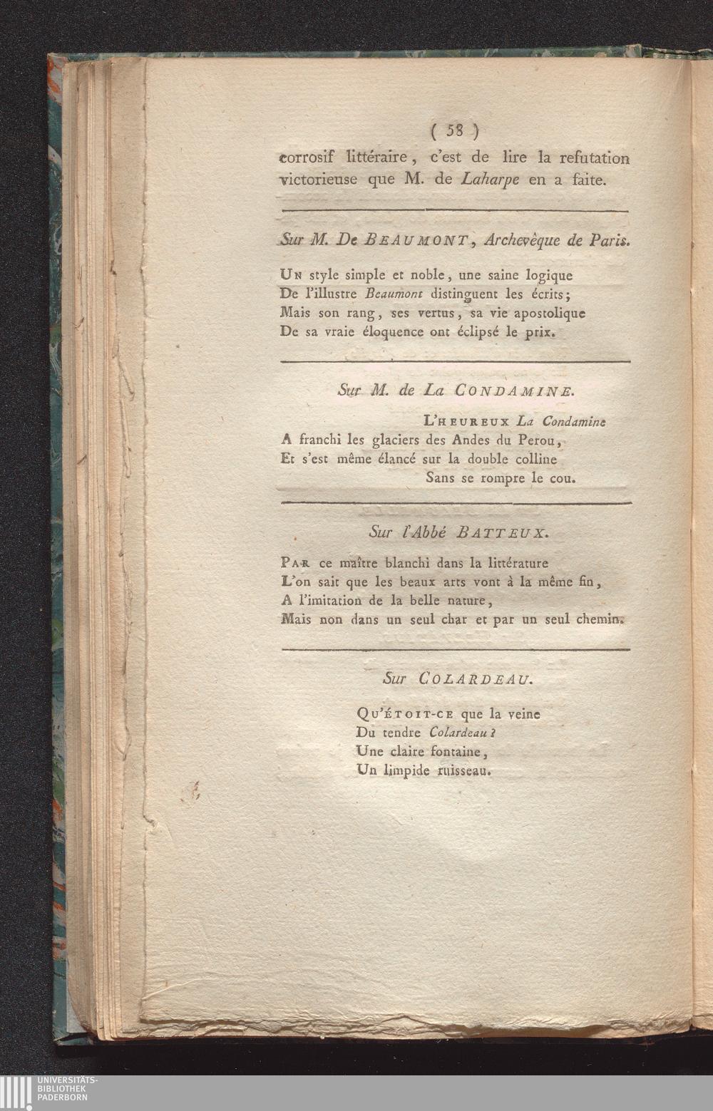 Les infiniment-petits de la littérature, ou huitains, sixains, quatrains et distiques : avec un grand nombre de notes historiques et critiques, sur les hommes-de-lettres les plus marquans de la France, précédés et suivis d'autres bluettes en prose et en vers / par l'ininiment-petit auteur des Délices de Chaufontaine