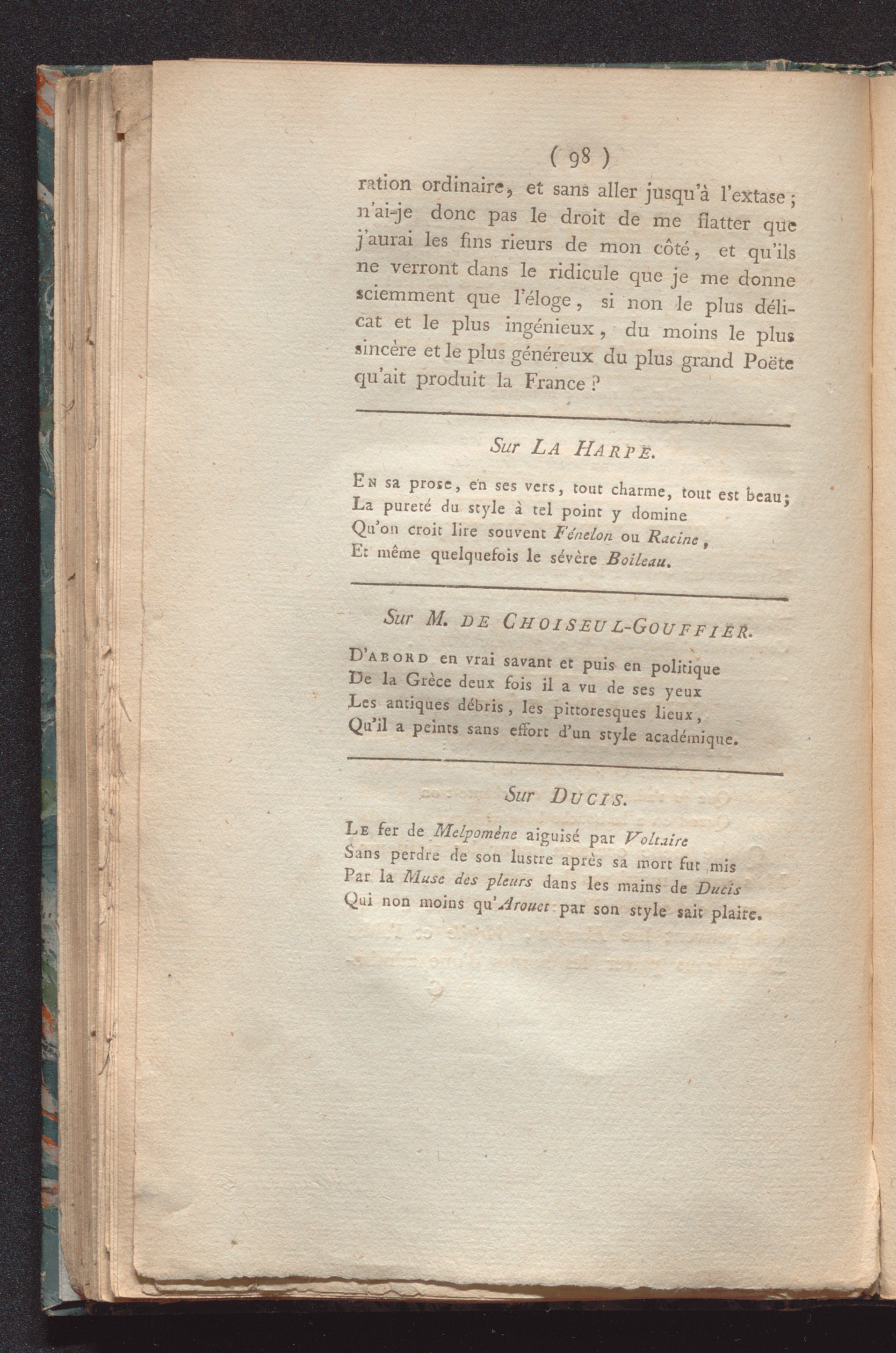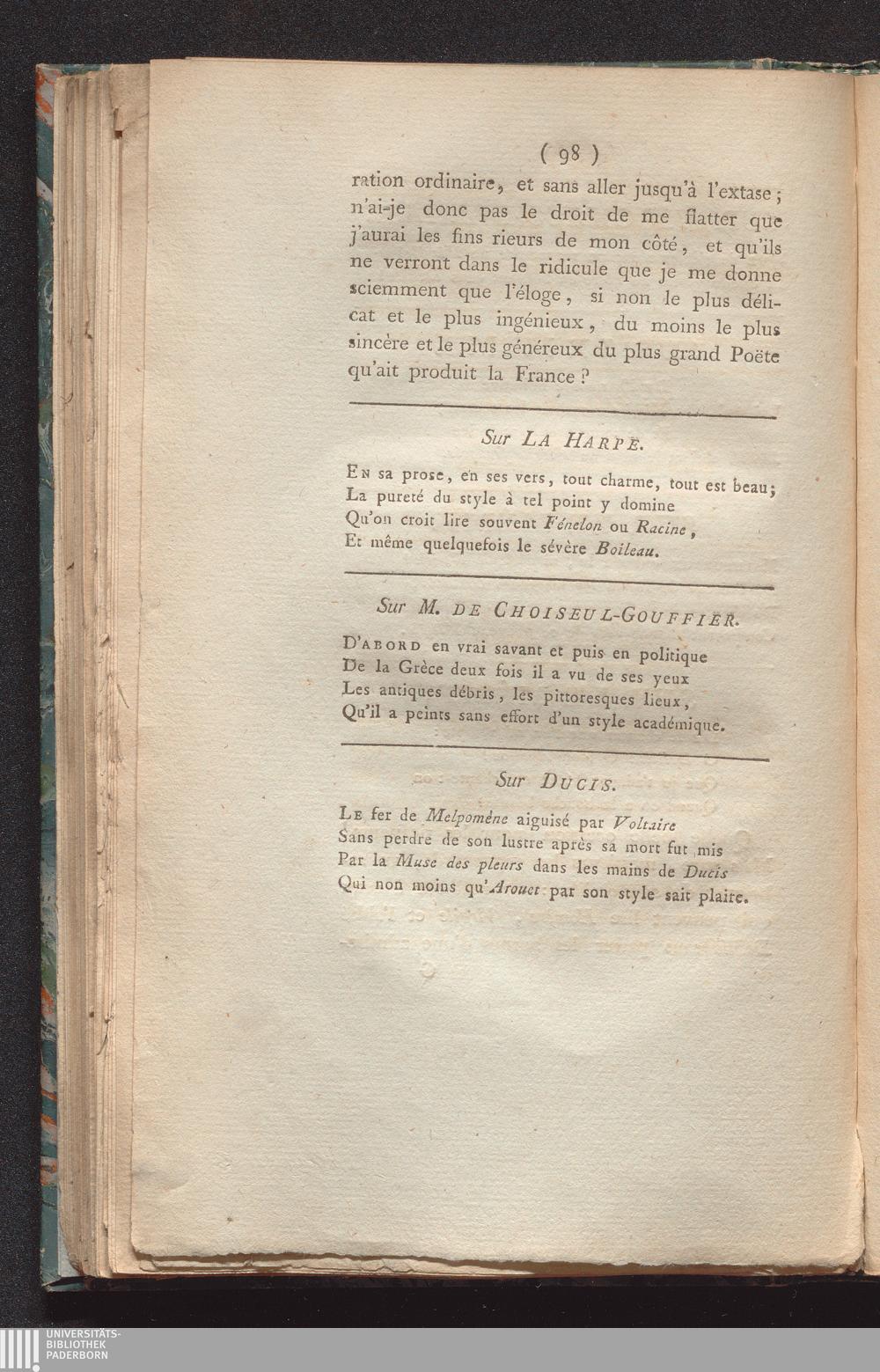 Les infiniment-petits de la littérature, ou huitains, sixains, quatrains et distiques : avec un grand nombre de notes historiques et critiques, sur les hommes-de-lettres les plus marquans de la France, précédés et suivis d'autres bluettes en prose et en vers / par l'ininiment-petit auteur des Délices de Chaufontaine