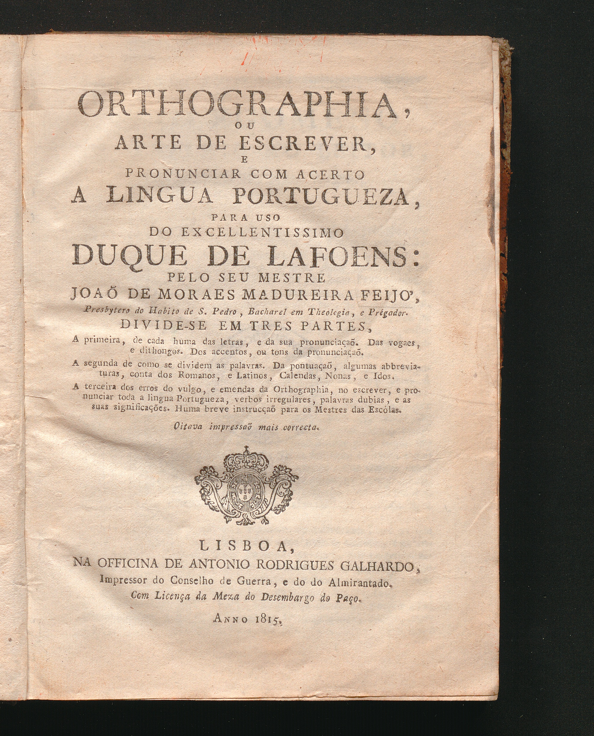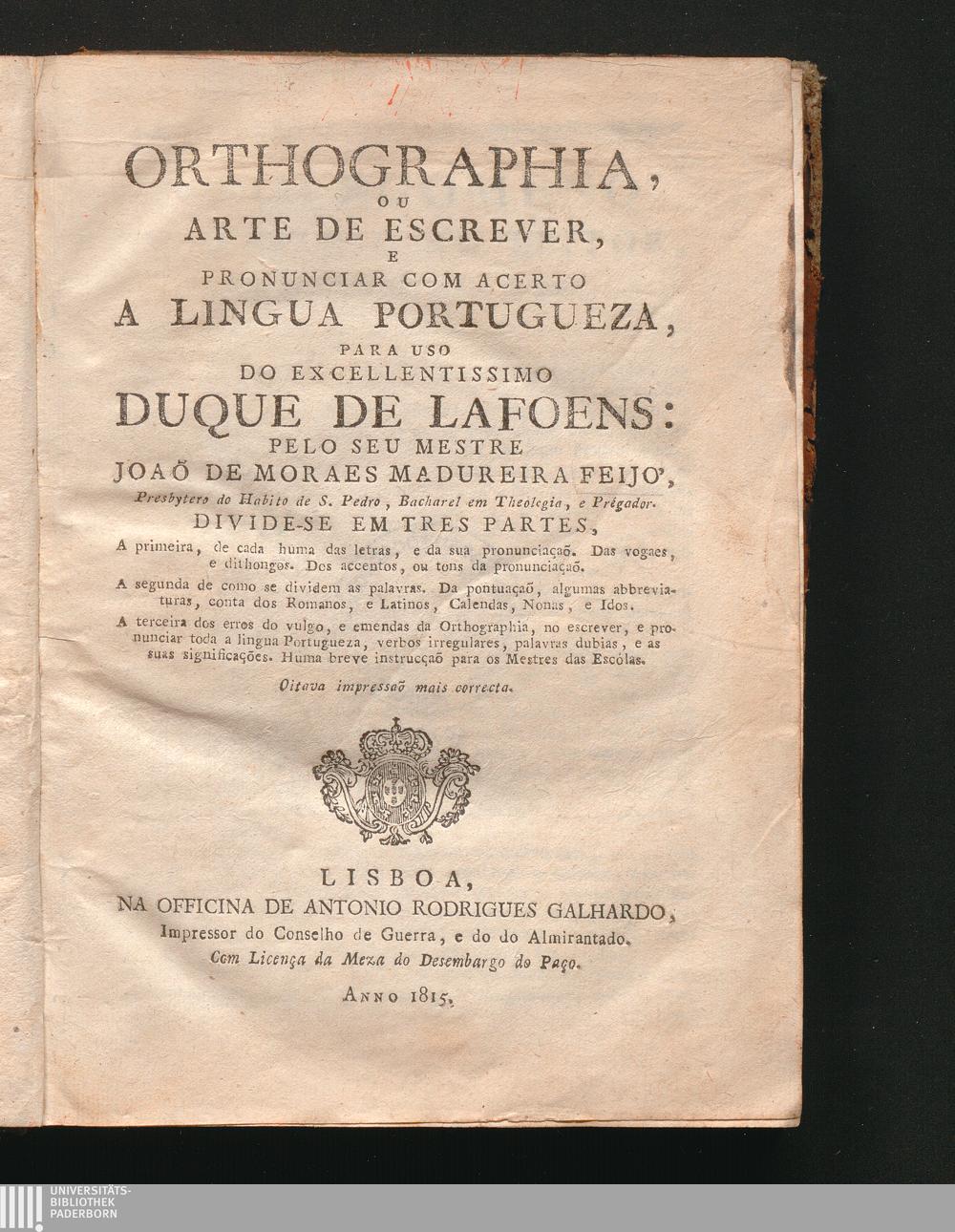 Orthographia, Ou Arte De Escrever, E Pronunciar Com Acerto A Lingua Portugueza : Divide-Se Em Tres Partes, A primeira, de cada huma das letras, e da sua pronunciacaõ. Das vogaes, e dithongos. Des accentos, ou tons da pronunciacaõ. A segunda de como se dividem as palavras. Da pontuacaõ, algumas abbreviaturas, conta dos Romanos, e Latinos, Calendas, Nonas, e Idos. A terceira dos erros do vulgo, e emendas da Orthographia, no escrever, e pronunciar toda a lingua Portugueza, verbos irregulares, palavras dubias, e as suas significações. Huma breve instrucçaõ para os Mestres das Escólas / Pelo Seu Mestre Joaõ De Moraes Madureira Feijo, Presbytero do Habito de S. Pedro, Bacharet em Theologia, e Prégador