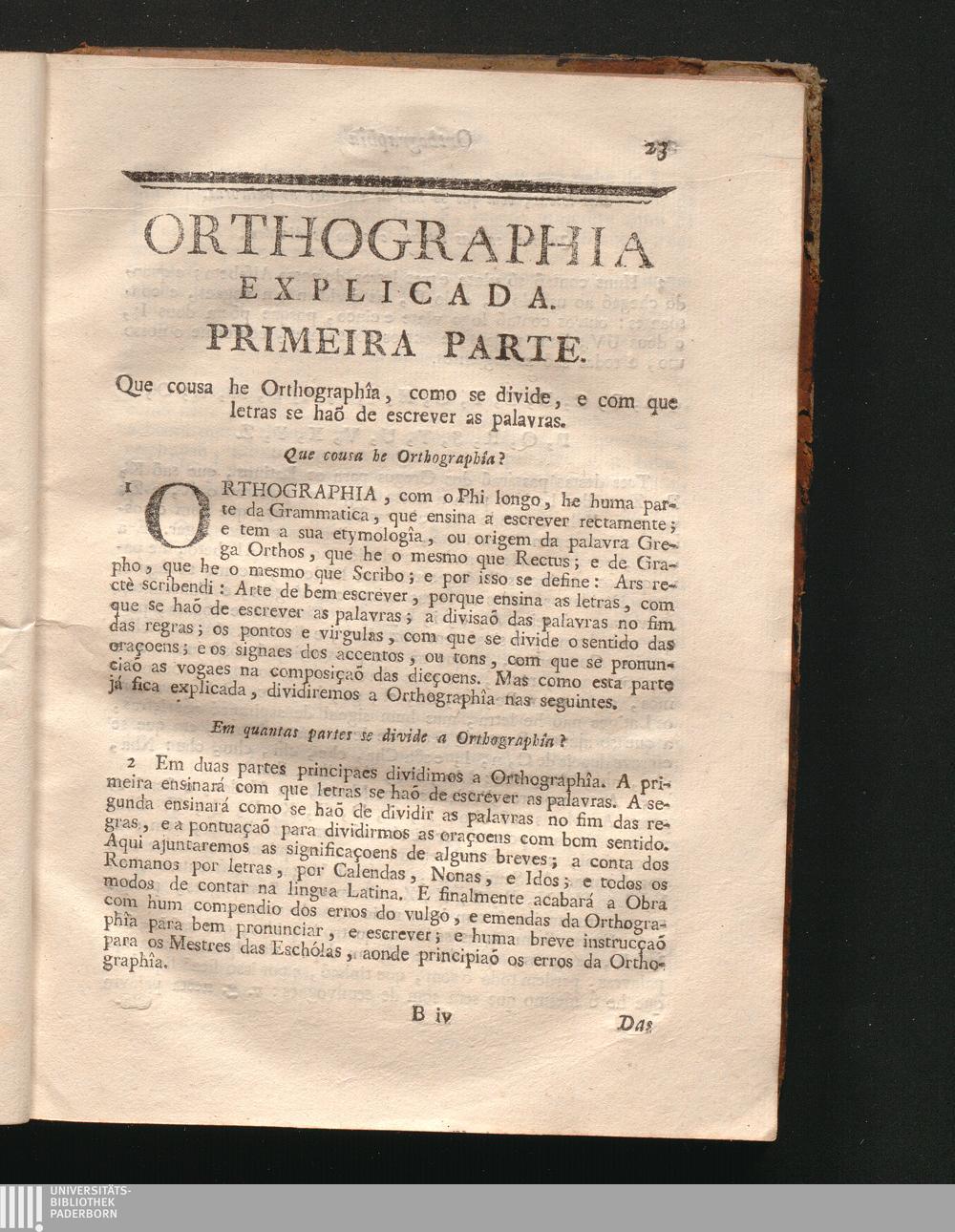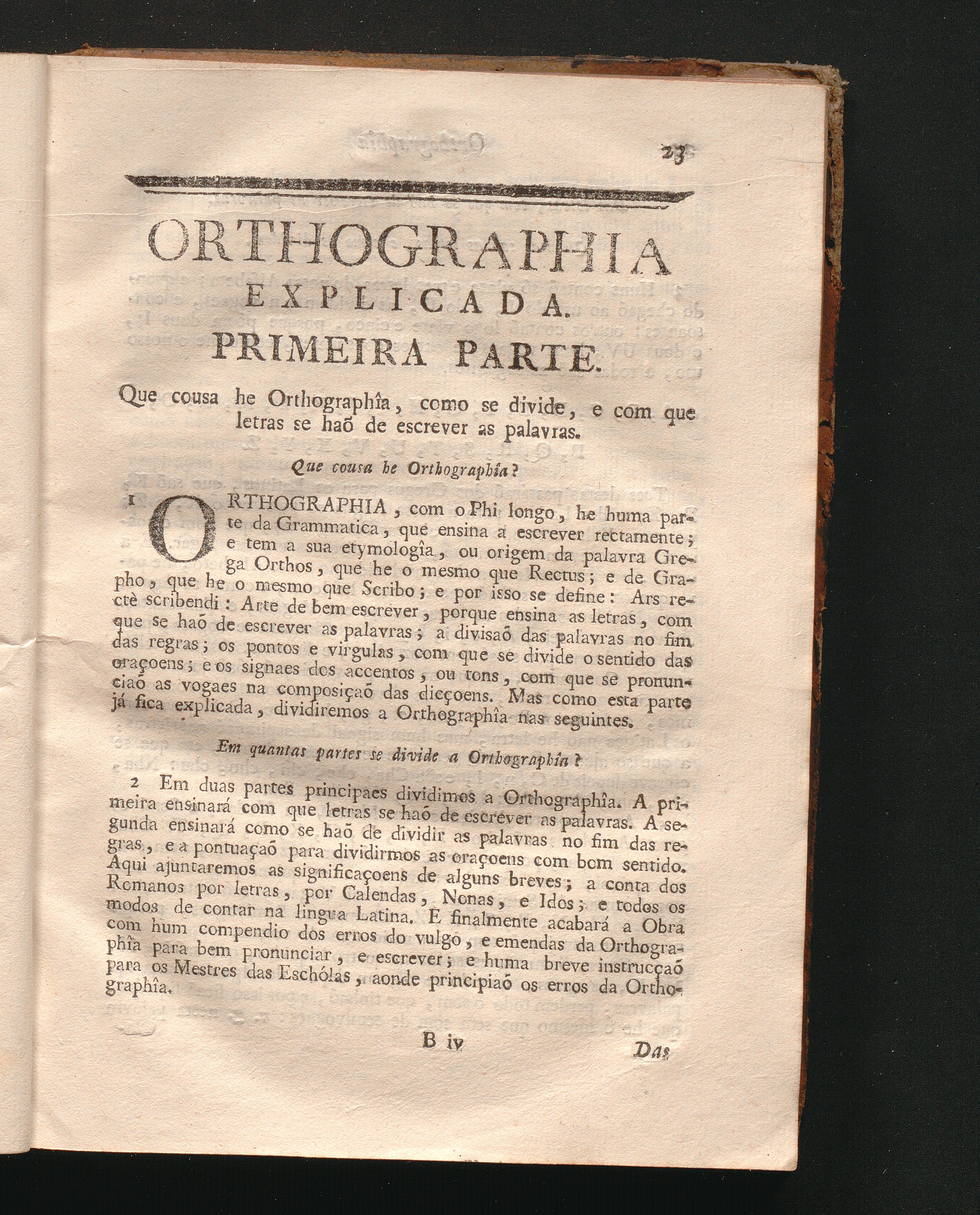 Orthographia, Ou Arte De Escrever, E Pronunciar Com Acerto A Lingua Portugueza : Divide-Se Em Tres Partes, A primeira, de cada huma das letras, e da sua pronunciacaõ. Das vogaes, e dithongos. Des accentos, ou tons da pronunciacaõ. A segunda de como se dividem as palavras. Da pontuacaõ, algumas abbreviaturas, conta dos Romanos, e Latinos, Calendas, Nonas, e Idos. A terceira dos erros do vulgo, e emendas da Orthographia, no escrever, e pronunciar toda a lingua Portugueza, verbos irregulares, palavras dubias, e as suas significações. Huma breve instrucçaõ para os Mestres das Escólas / Pelo Seu Mestre Joaõ De Moraes Madureira Feijo, Presbytero do Habito de S. Pedro, Bacharet em Theologia, e Prégador
