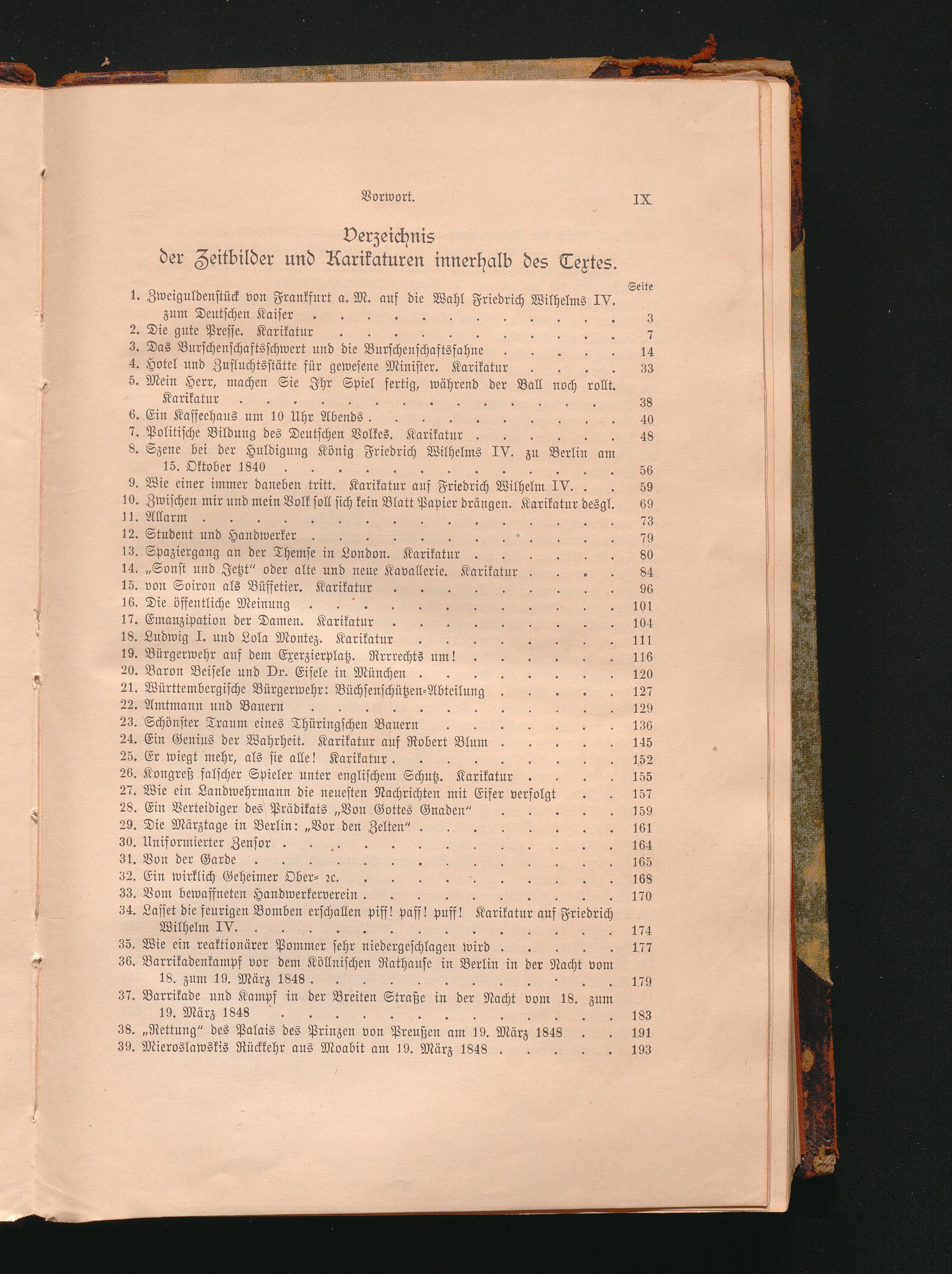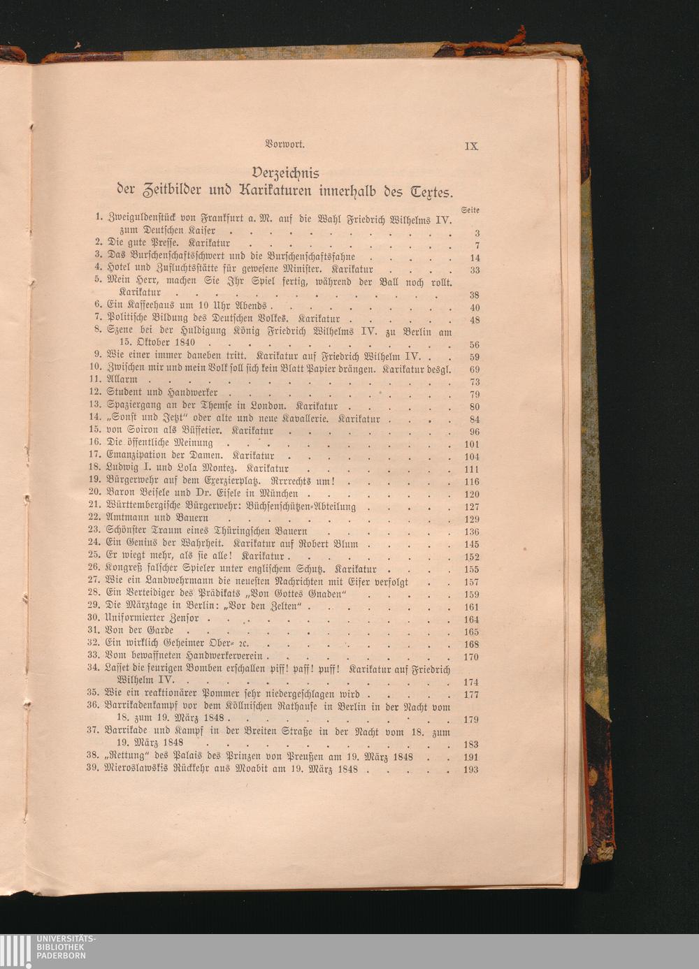Verzeichnis der Zeitbilder und Karikaturen innerhalb des Textes.
