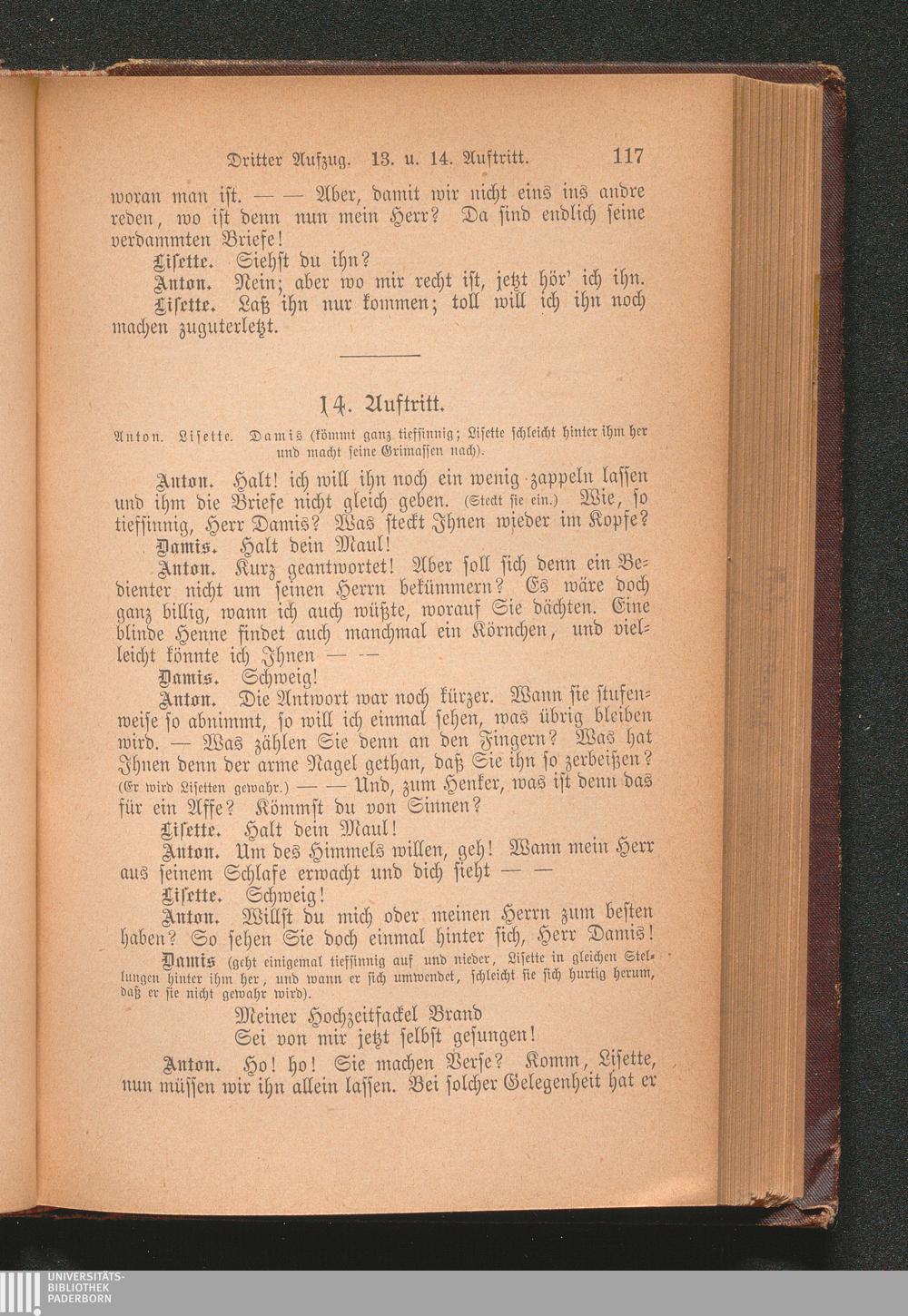 14. Auftritt. Anton. Lisette. Damis (kömmt ganz tiefsinnig; Lisette schleicht hinter[...]