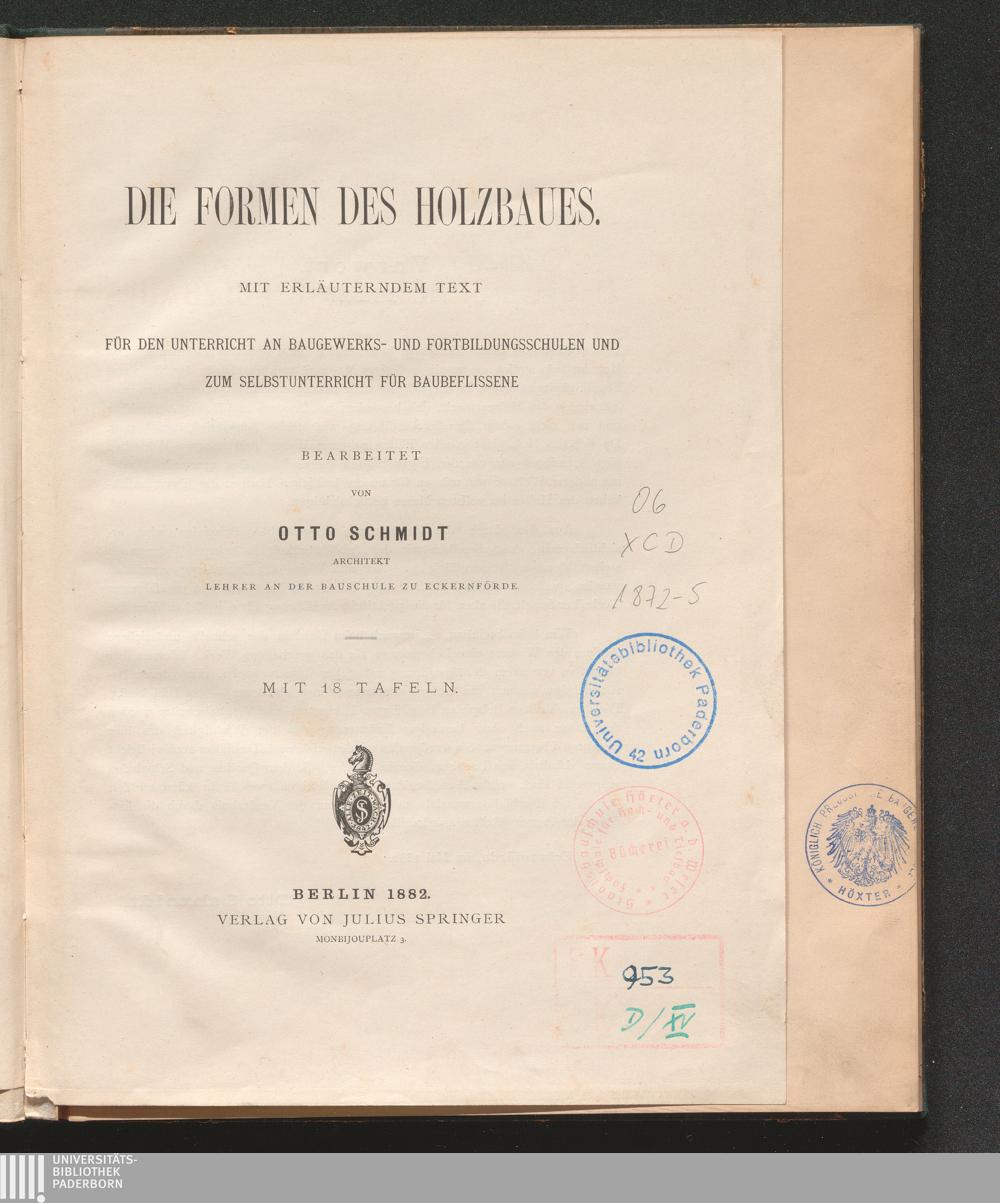 Die Formen des Holzbaues : mit erläuterndem Text für den Unterricht an Baugewerks- und Fortbildungsschulen und Selbststudium für Baubeflissene ; mit 18 Tafeln / bearb. von Otto Schmidt