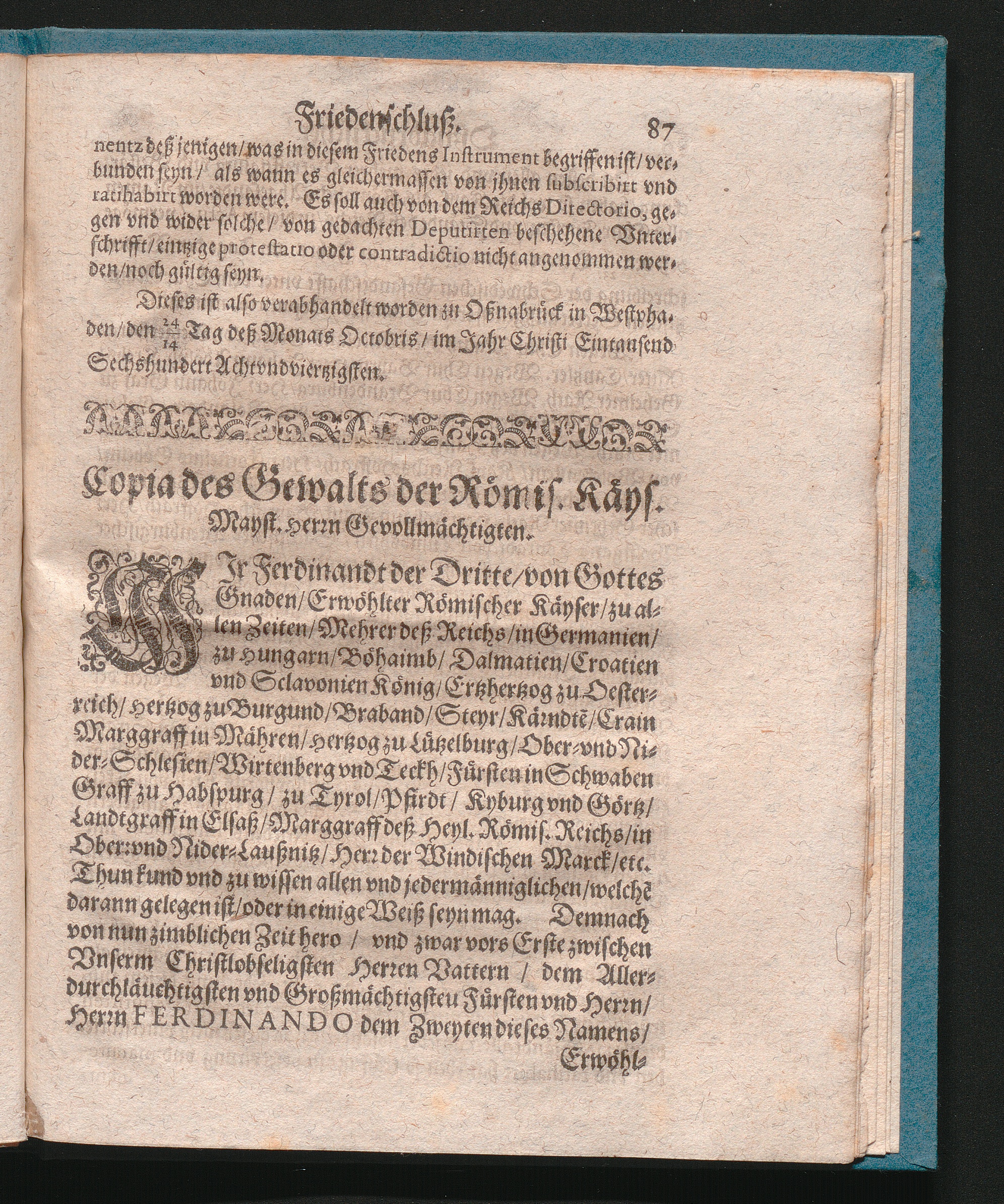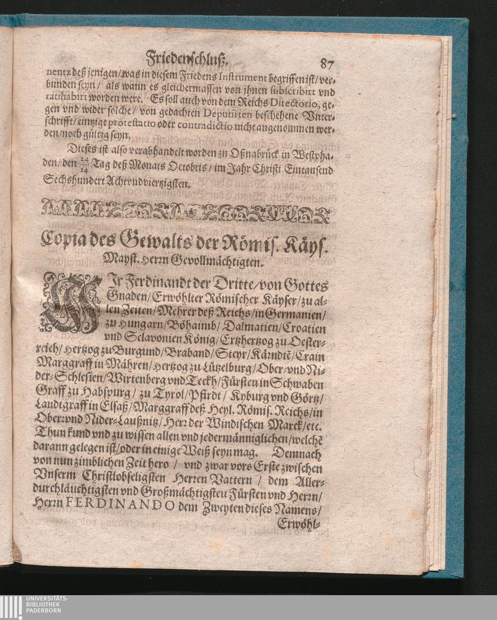 Friedens-Schluß/ Wie solcher Von der Römischen Käyserlichen/ Auch Königl. Schwedischen Mayst. Mayst. So dann Deß Heyl. Römischen Reichs Extraordinari-Deputirten vnd [und] anderer Chur: Fürsten vnd [und] Ständ Gevollmächtigten vnd [und] Hochansehenlichen Herren Abgesandten zu Oßnabrück den 27ten. Julij vnd [Julii und] 6ten Augusti/ Im Jahr 1648. auffgericht vnd [und] verglichen/ vnd [und] daselbsten 24/14. Octobris in offentlicher Versamblung vnderschrieben vnd [underschrieben und] bekräfftiget/ auch den 25/15. eiusdem solenniter publicirt worden/ &c. : Auß dem wahren Original, wie es bey dem Cur-Mäyntzis. Reichs-Directorio deponirt worden/ ins Teutsche versetzt