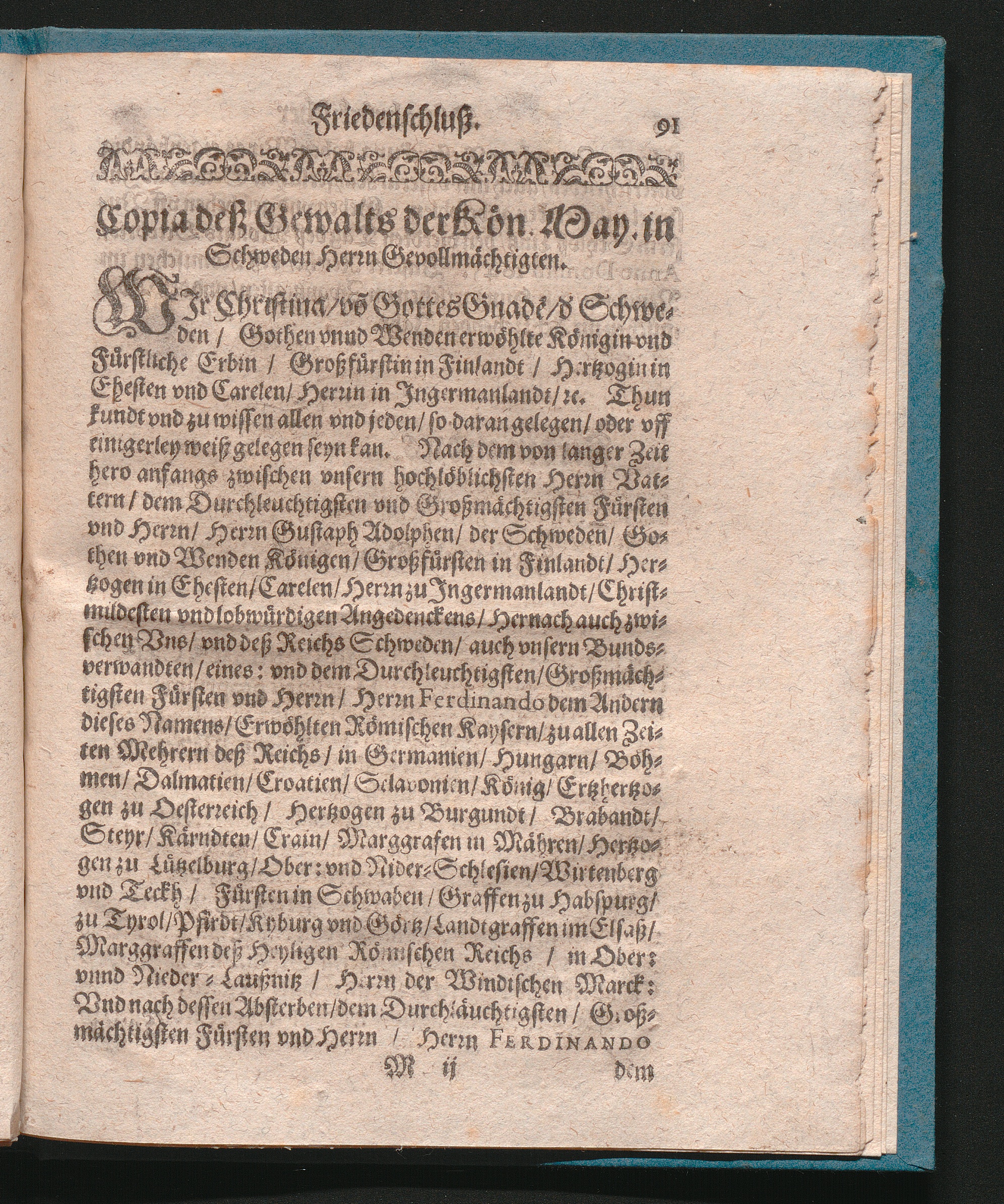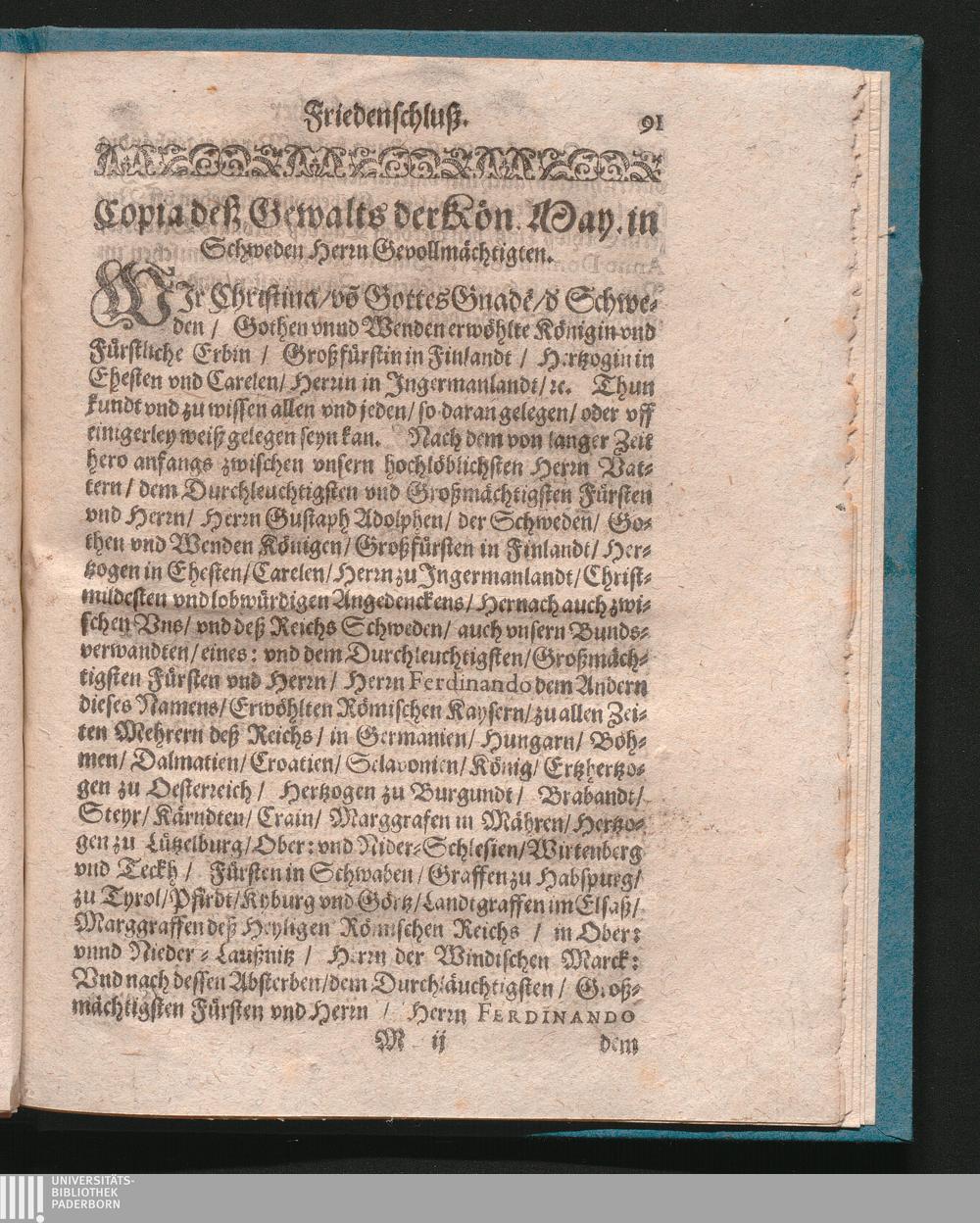Friedens-Schluß/ Wie solcher Von der Römischen Käyserlichen/ Auch Königl. Schwedischen Mayst. Mayst. So dann Deß Heyl. Römischen Reichs Extraordinari-Deputirten vnd [und] anderer Chur: Fürsten vnd [und] Ständ Gevollmächtigten vnd [und] Hochansehenlichen Herren Abgesandten zu Oßnabrück den 27ten. Julij vnd [Julii und] 6ten Augusti/ Im Jahr 1648. auffgericht vnd [und] verglichen/ vnd [und] daselbsten 24/14. Octobris in offentlicher Versamblung vnderschrieben vnd [underschrieben und] bekräfftiget/ auch den 25/15. eiusdem solenniter publicirt worden/ &c. : Auß dem wahren Original, wie es bey dem Cur-Mäyntzis. Reichs-Directorio deponirt worden/ ins Teutsche versetzt