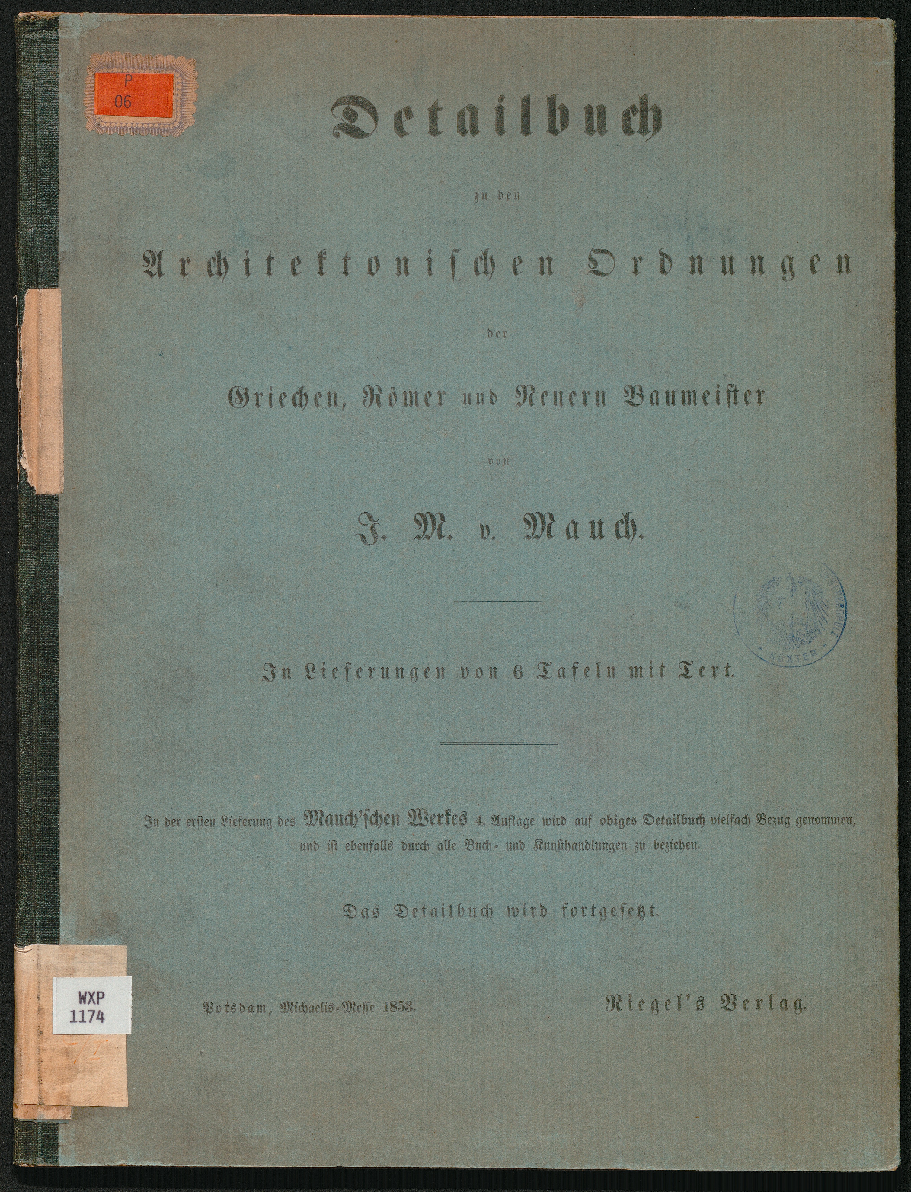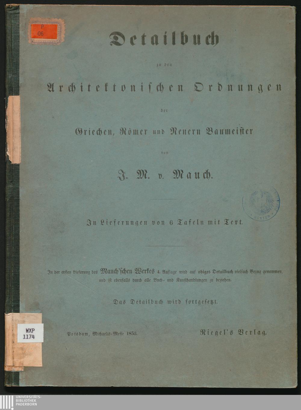 Detailbuch zu den architektonischen Ordnungen der Griechen, Römer und neuern Baumeister : in Lieferungen von 6 Tafeln mit Text ; [Detail-Buch zu allen drei Auflagen der architektonischen Ordnungen] / von J. M. v. Mauch