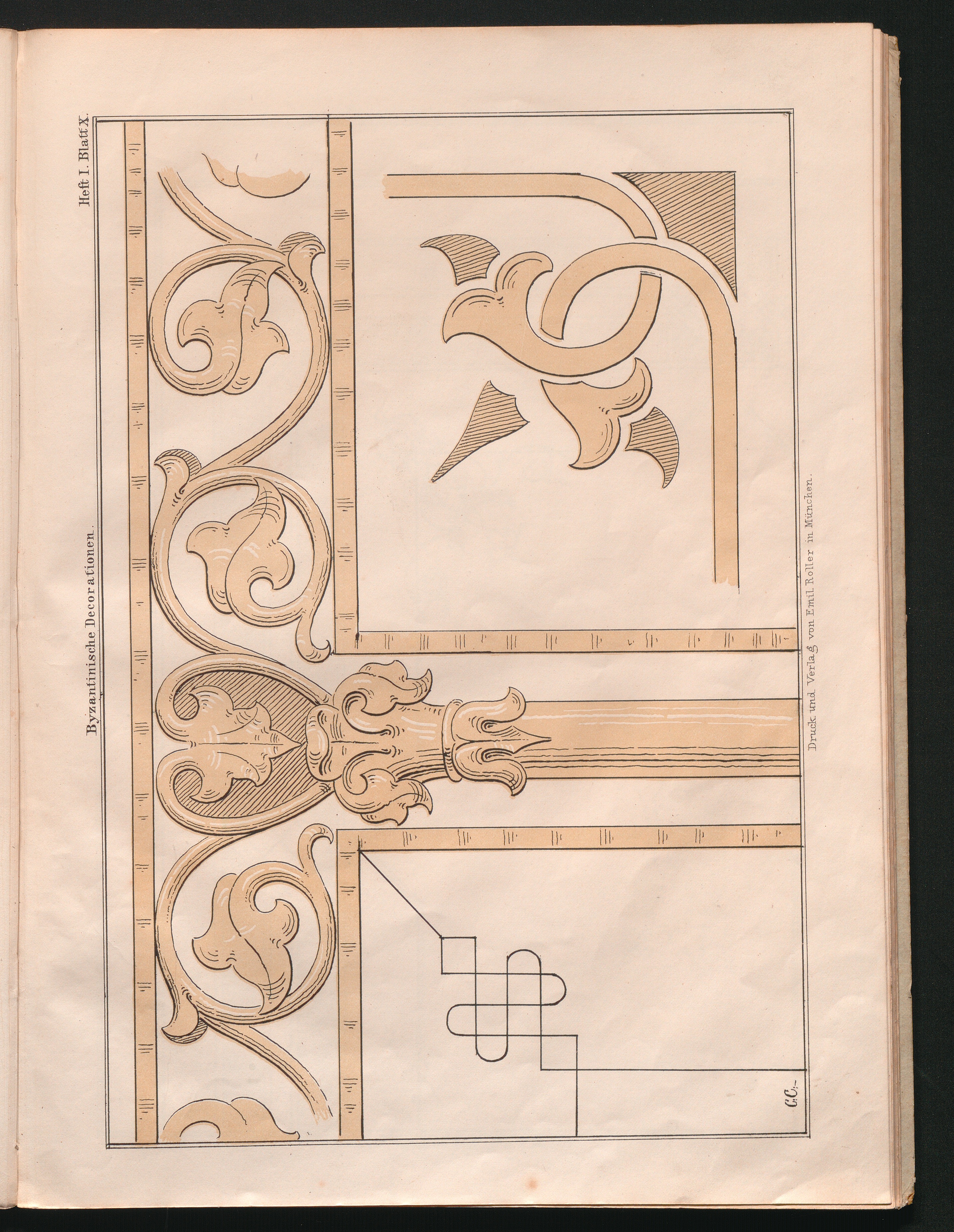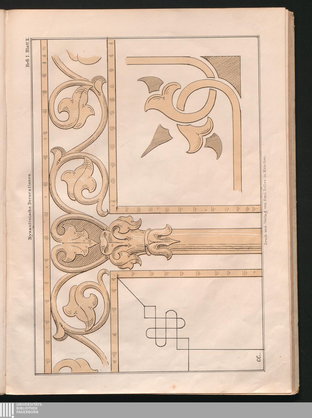 Byzantinische Dekorationen für Zimmermaler : Eine reiche Sammlung von vorbildlichen Muster-Entwürfen zur geschmackvollen inneren Verzierung von bürgerlichen Wohngebäuden der wohlhabenden Klasse im byzantinischen Style aus den besten Zeiten seiner Blüthe in Italien, Frankreich und Deutschland, mit beigegebenen Detailzeichnungen in größerem Maßstabe / Zusammengestellt von Carl Cramer, Dekorationsmaler