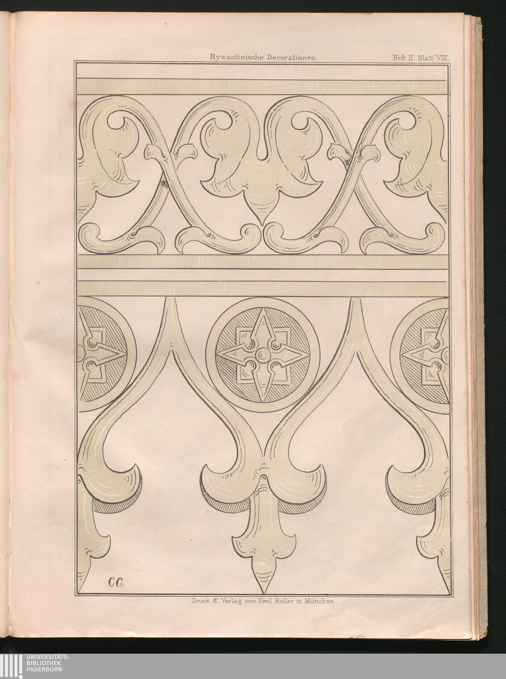 Byzantinische Dekorationen für Zimmermaler : Eine reiche Sammlung von vorbildlichen Muster-Entwürfen zur geschmackvollen inneren Verzierung von bürgerlichen Wohngebäuden der wohlhabenden Klasse im byzantinischen Style aus den besten Zeiten seiner Blüthe in Italien, Frankreich und Deutschland, mit beigegebenen Detailzeichnungen in größerem Maßstabe / Zusammengestellt von Carl Cramer, Dekorationsmaler