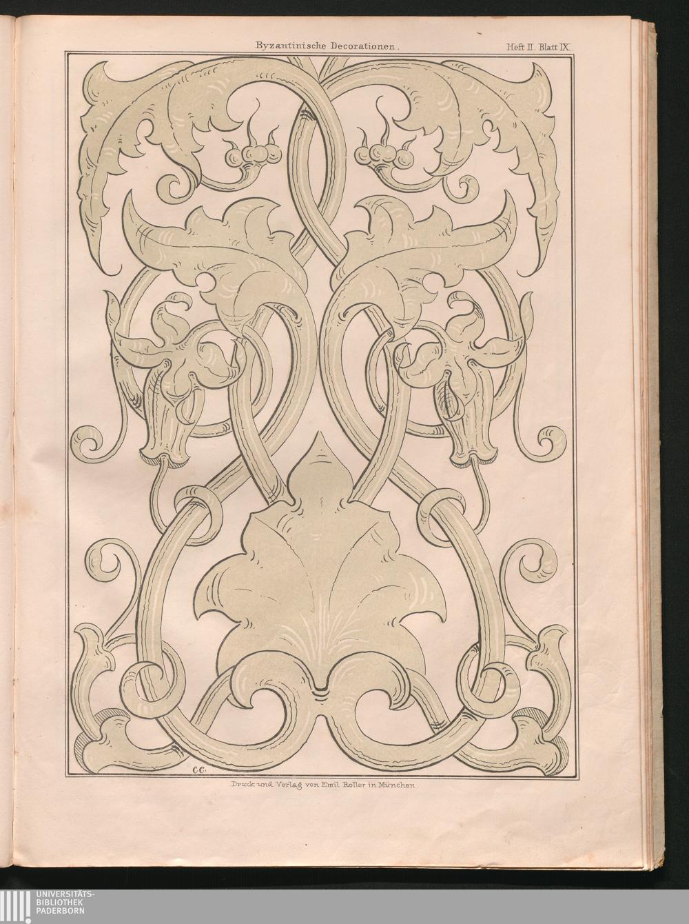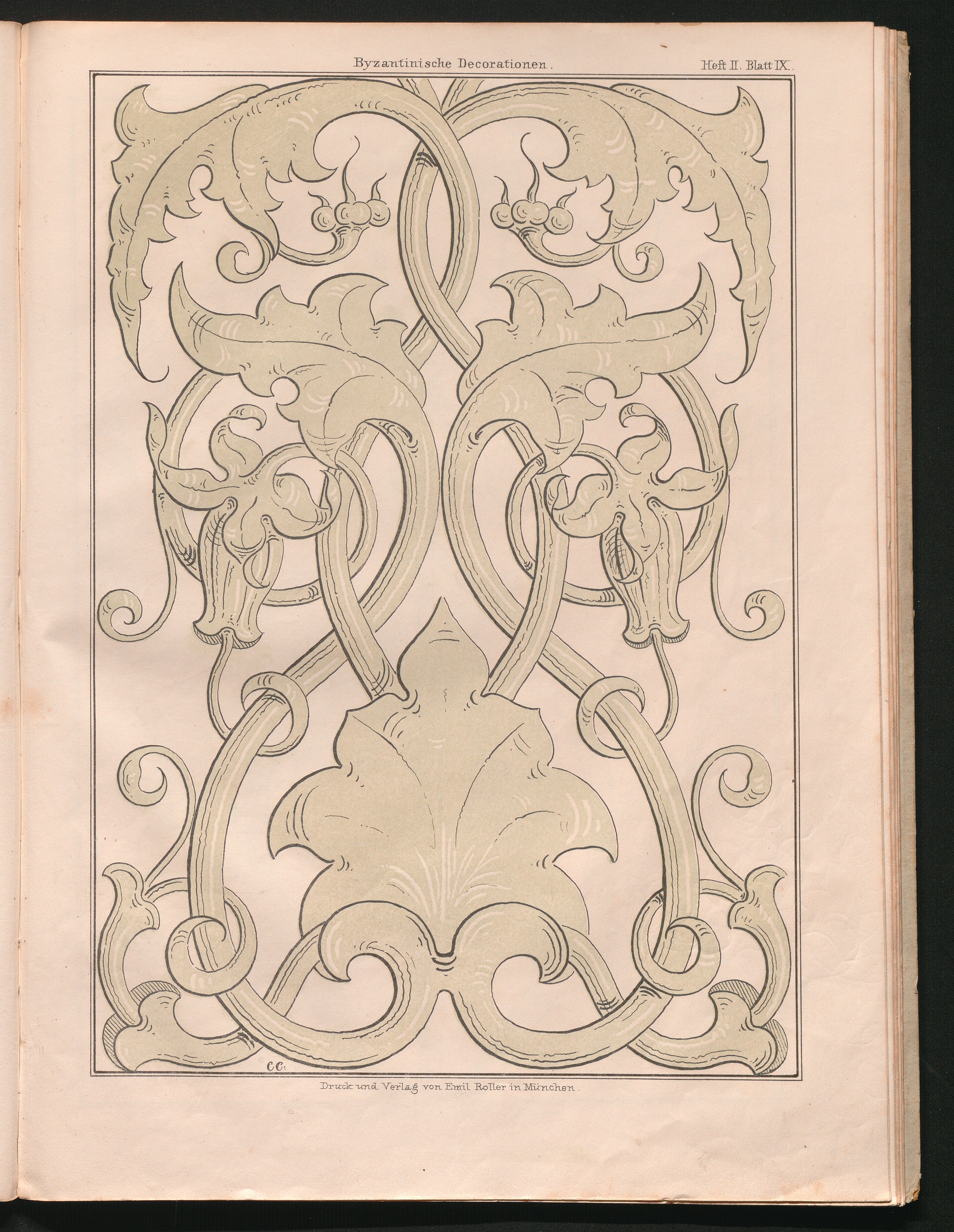 Byzantinische Dekorationen für Zimmermaler : Eine reiche Sammlung von vorbildlichen Muster-Entwürfen zur geschmackvollen inneren Verzierung von bürgerlichen Wohngebäuden der wohlhabenden Klasse im byzantinischen Style aus den besten Zeiten seiner Blüthe in Italien, Frankreich und Deutschland, mit beigegebenen Detailzeichnungen in größerem Maßstabe / Zusammengestellt von Carl Cramer, Dekorationsmaler