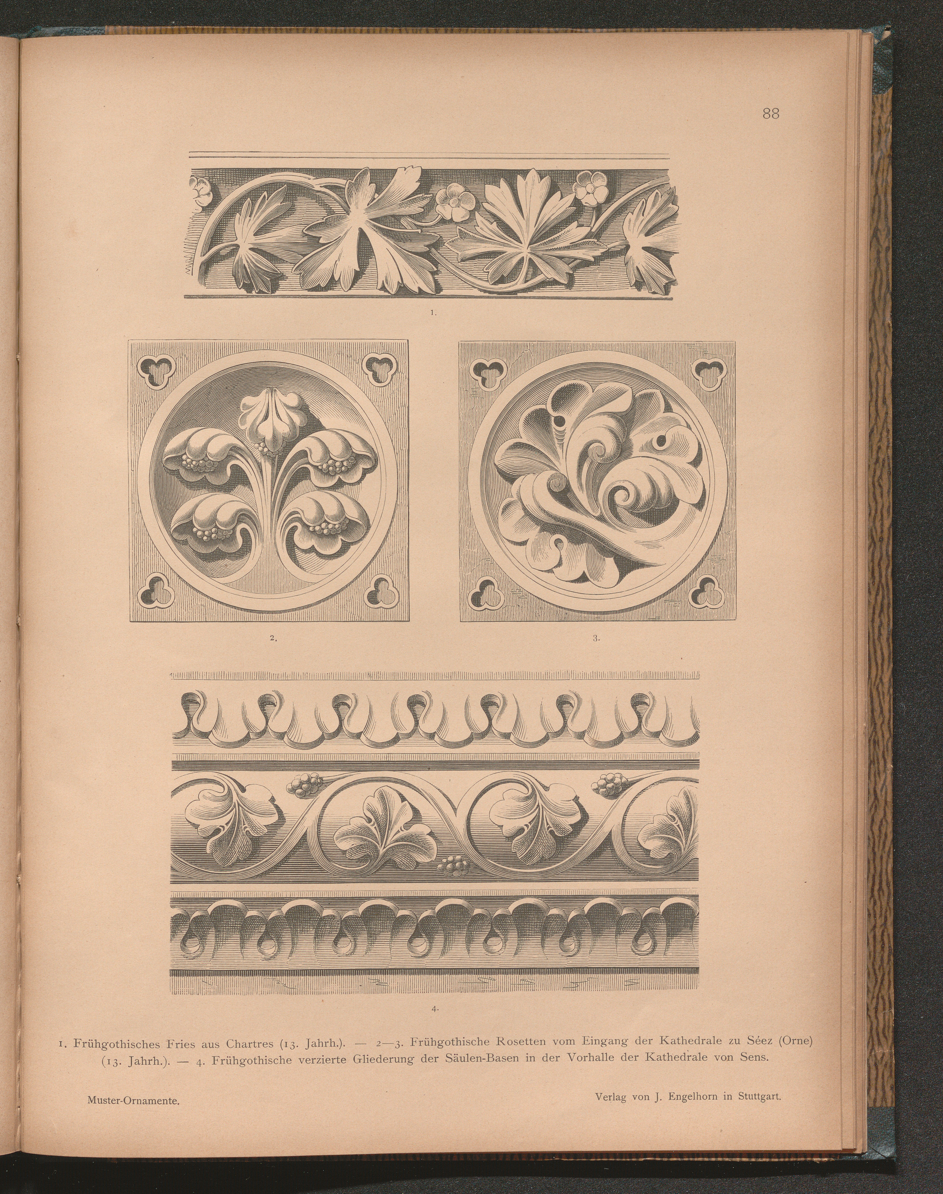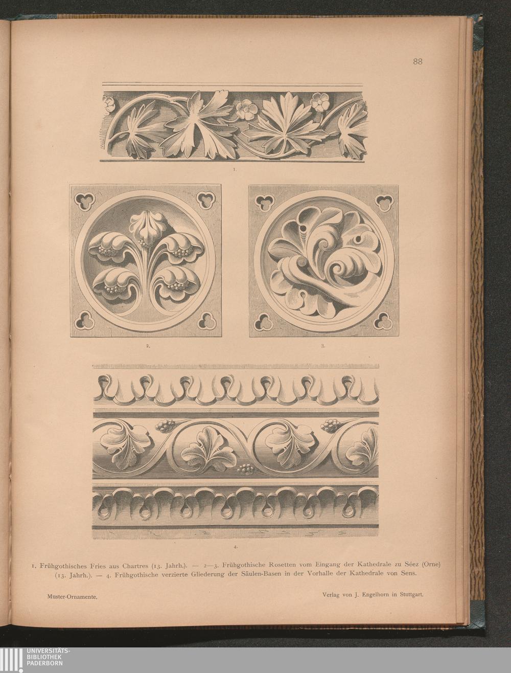 1. Frühgothisches Fries aus Chertres (13. Jahrh.). - 2-3. Frühgothische Rosetten[...]