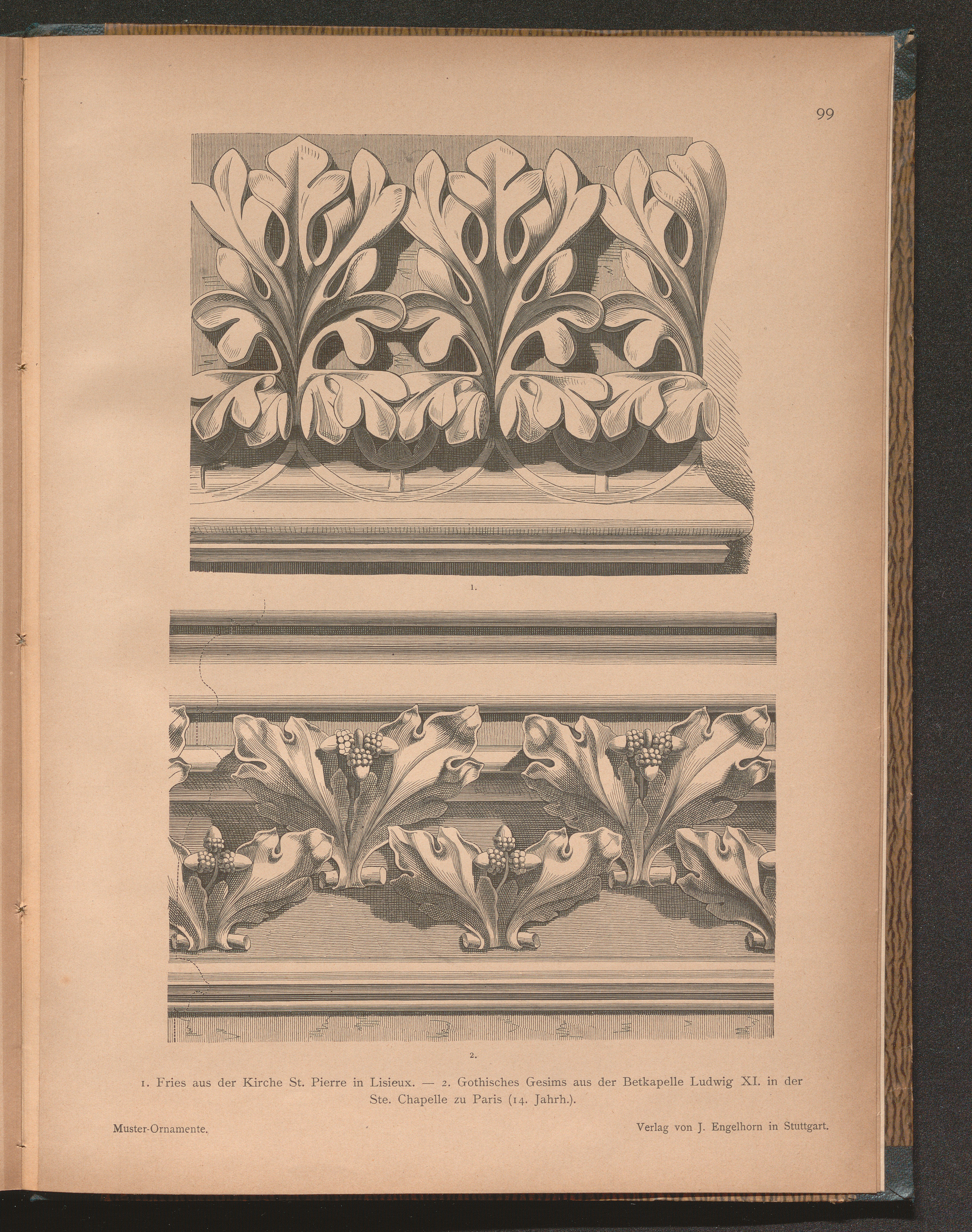 1. Fries aus der Kirche St. Pierre in Lisieux. - 2. Gothisches Gesims aus der Betkapelle[...]