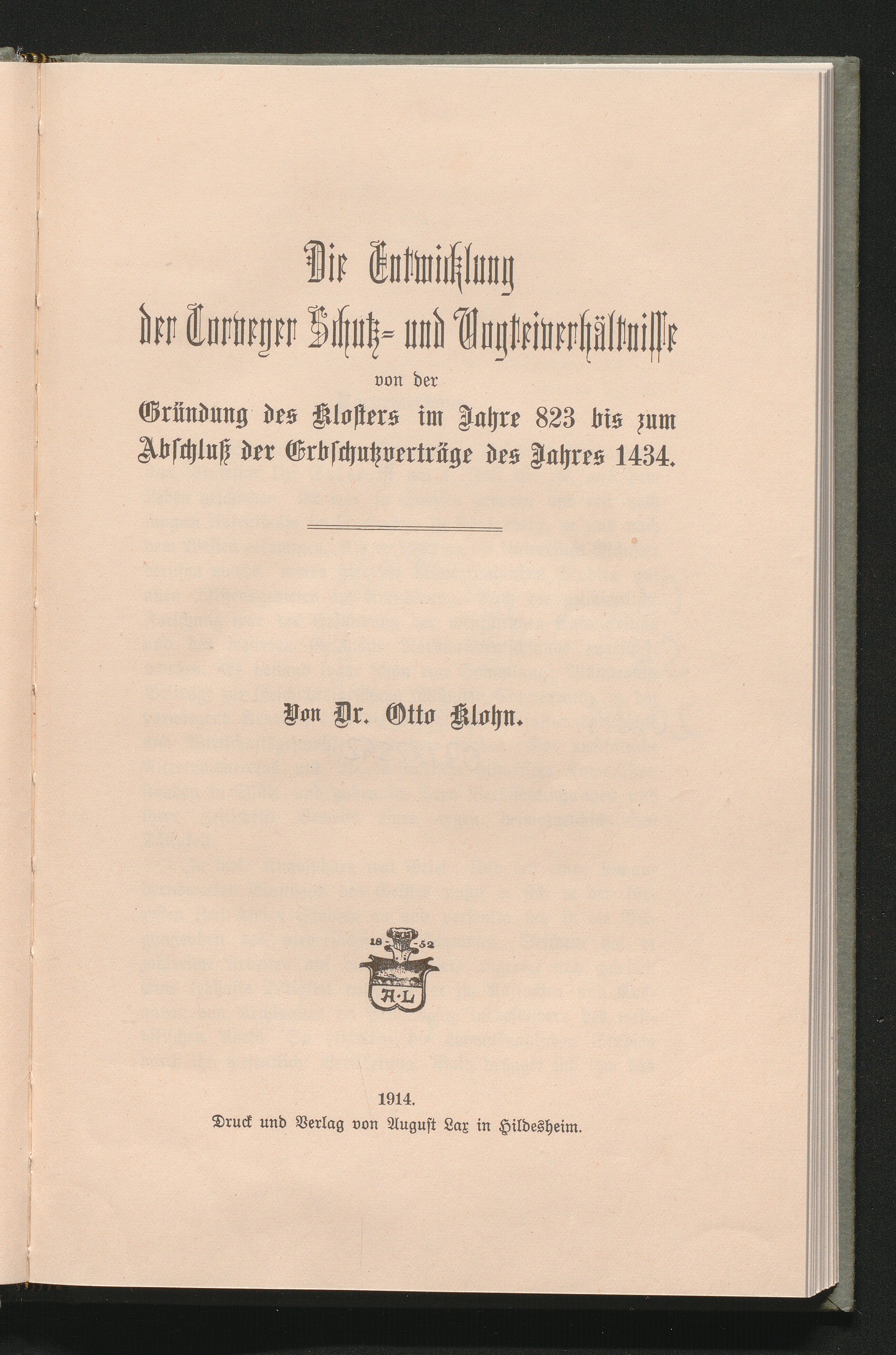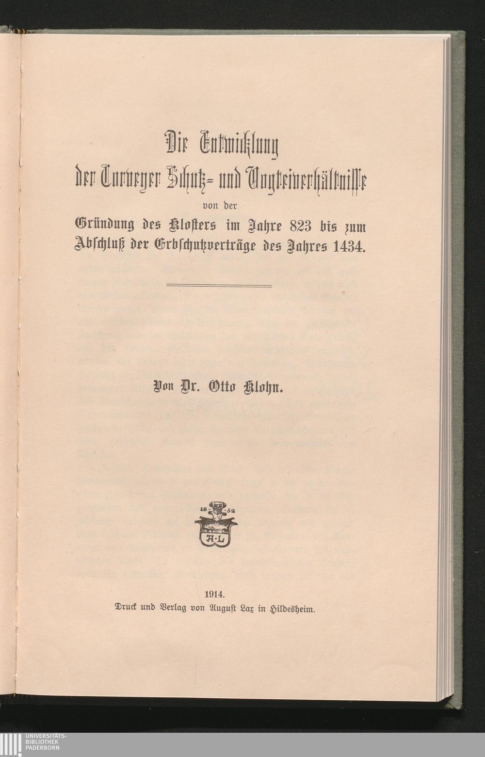 Die Entwicklung der Corveyer Schutz- und Vogteiverhältnisse von der Gründung des Klosters im Jahre 823 bis zum Abschluß der Erbschutzverträge des Jahres 1434 / von Otto Klohn