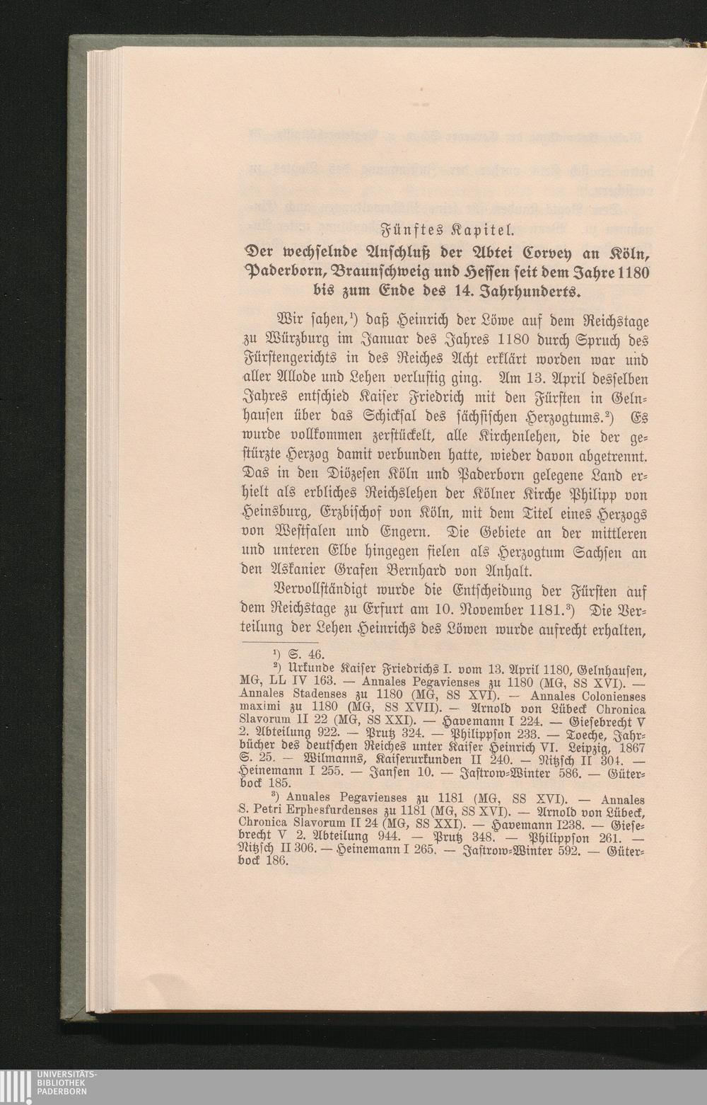 Fünftes Kapitel: Der wechselnde Anschluß der Abtei Corveys an Köln, Paderborn, Braunschweig und Hessen seit dem Jahre 1180 bis zum Ende des 14. Jahrhunderts.