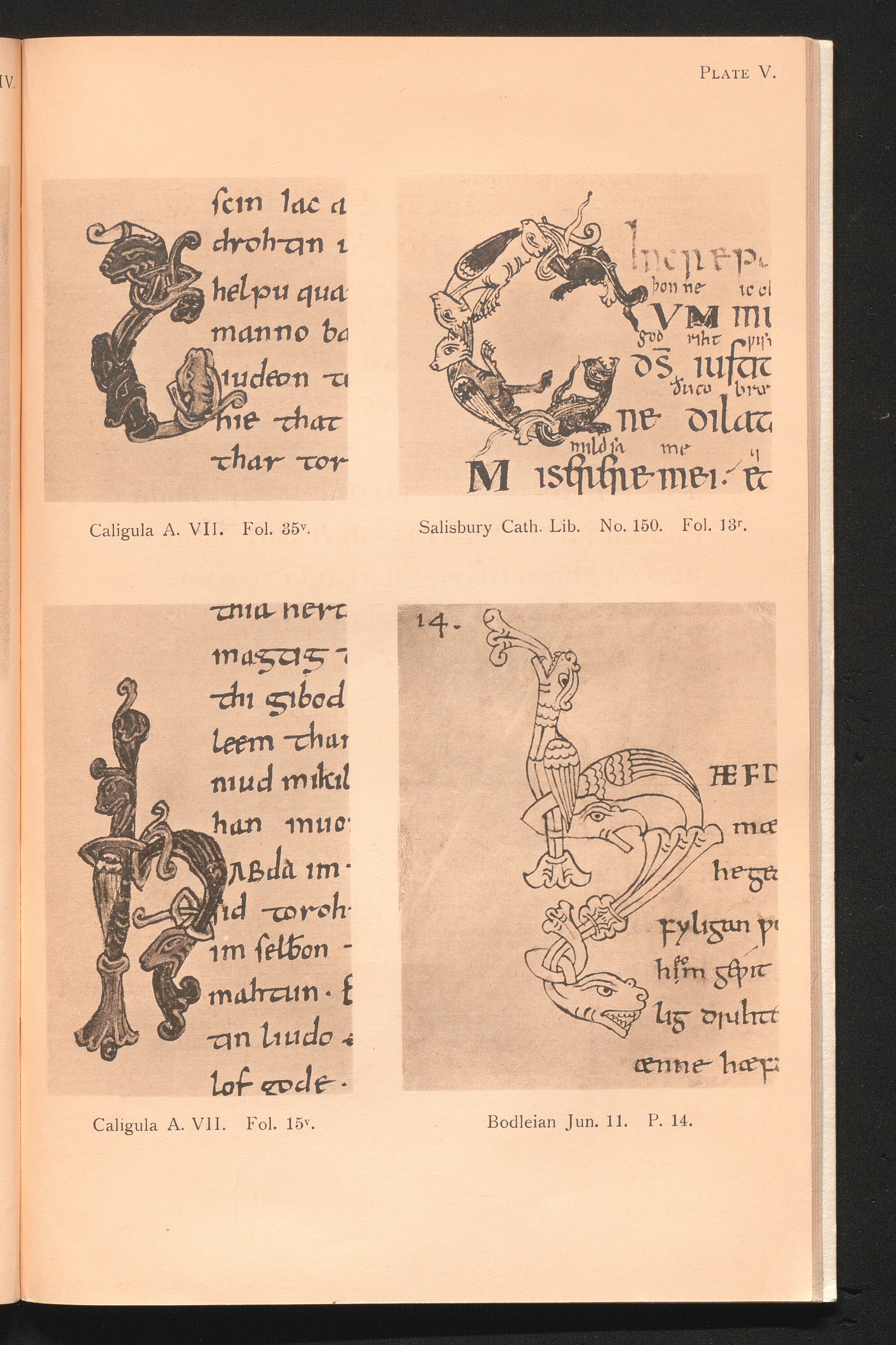 Plate V. Caligula A. VII. Fol. 35v. Salisbury Cath. Lib. No. 150. Fol. 13r. Caligula A. VII. Fol. 15v. Bodleien Jun. 11. P. 14.