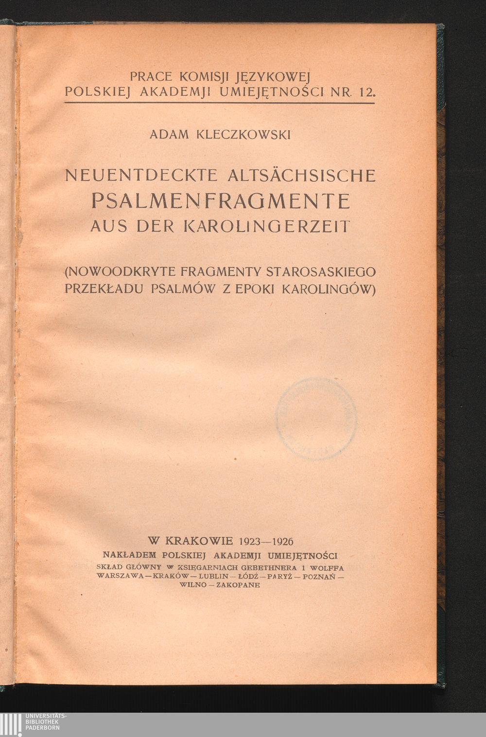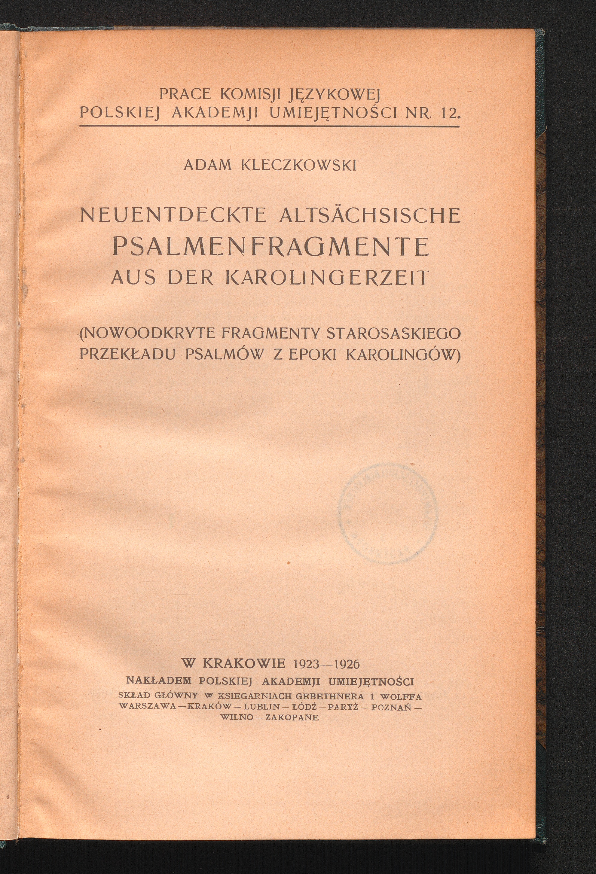 Neuentdeckte altsaechsische Psalmenfragmente aus der Karolingerzeit / Adam Kleczkowski