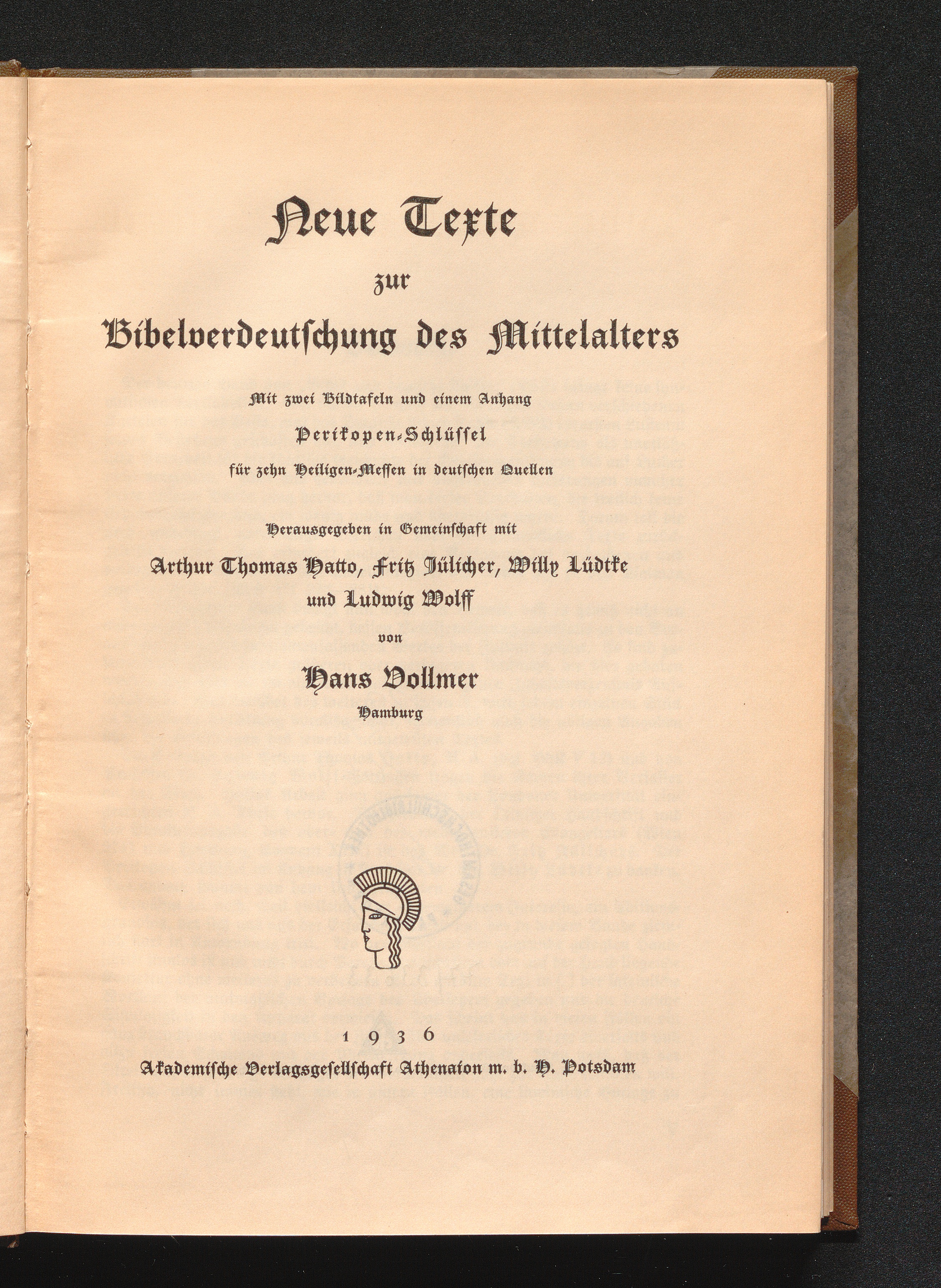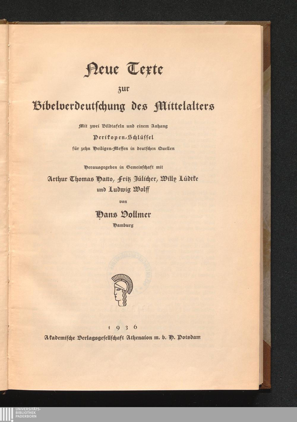 Neue Texte zur Bibelverdeutschung des Mittelalters : Mit zwei Bildtafeln und einem Anhang Perikopen-Schlüssel für zehn Heiligenmessen in deutschen Quellen / Herausgegeben in Gemeinschaft mit Arthur Thomas Hatto, Fritz Jülicher, Willy Lüdtke und Ludwig Wolff von Hans Vollmer