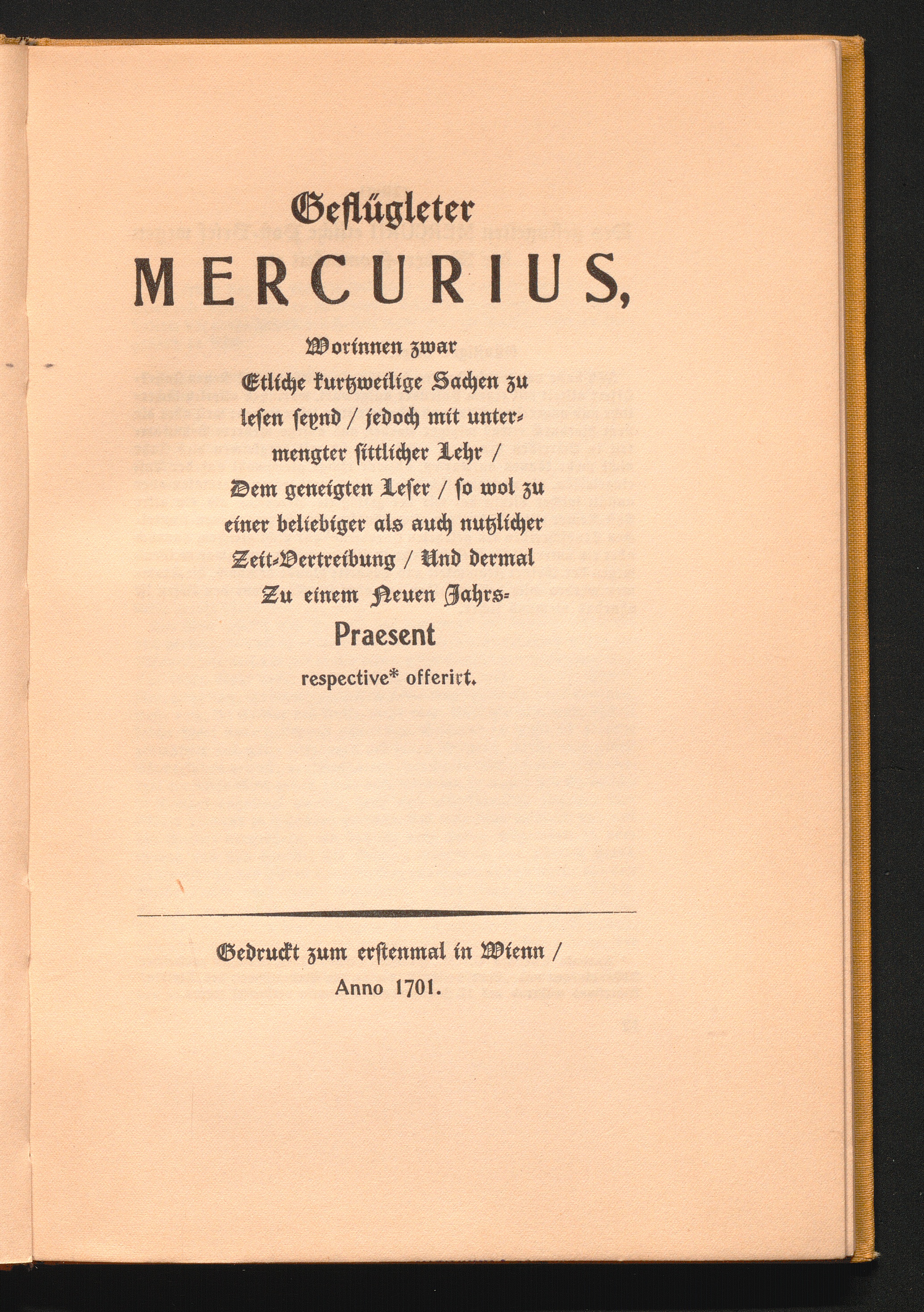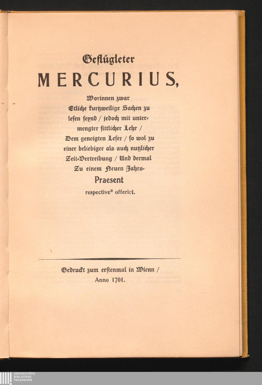 Geflügleter Mercurius, Worinnen zwar Etliche kurtzweilige Sachen zu lesen seynd/ jedoch mit untermengter sittlicher Lehr/ Dem geneigten Leser/ so wol zu einer beliebiger als auch nutzlicher Zeit-Vertreibung/ Und dermal Zu einer Neuen Jahrs-Praesent respective offerirt.