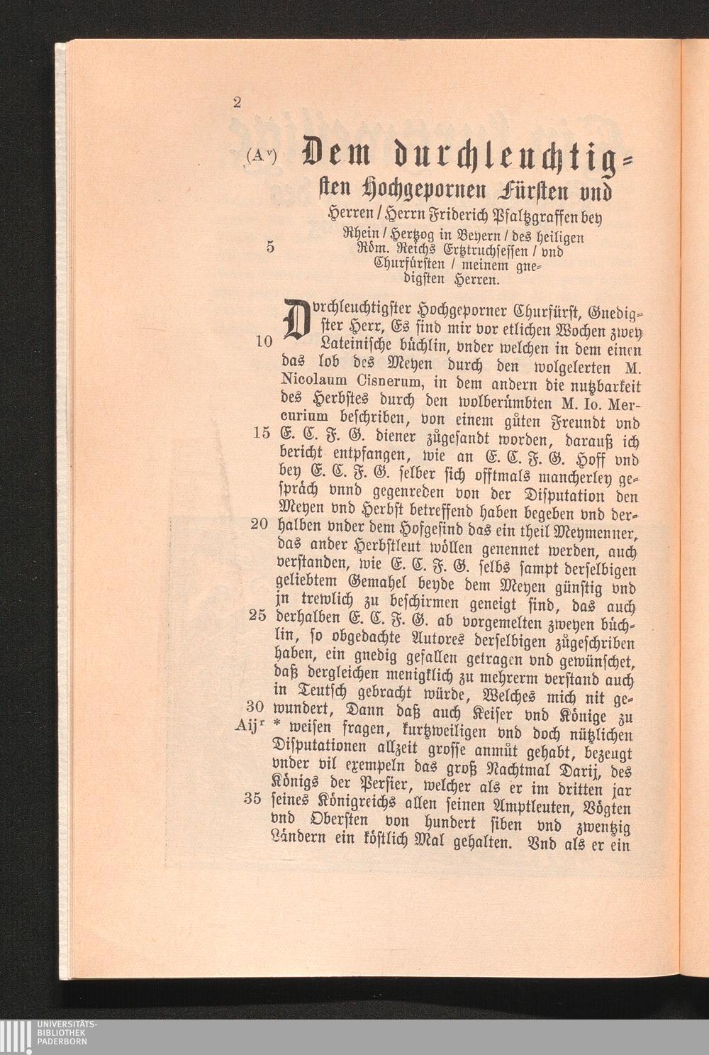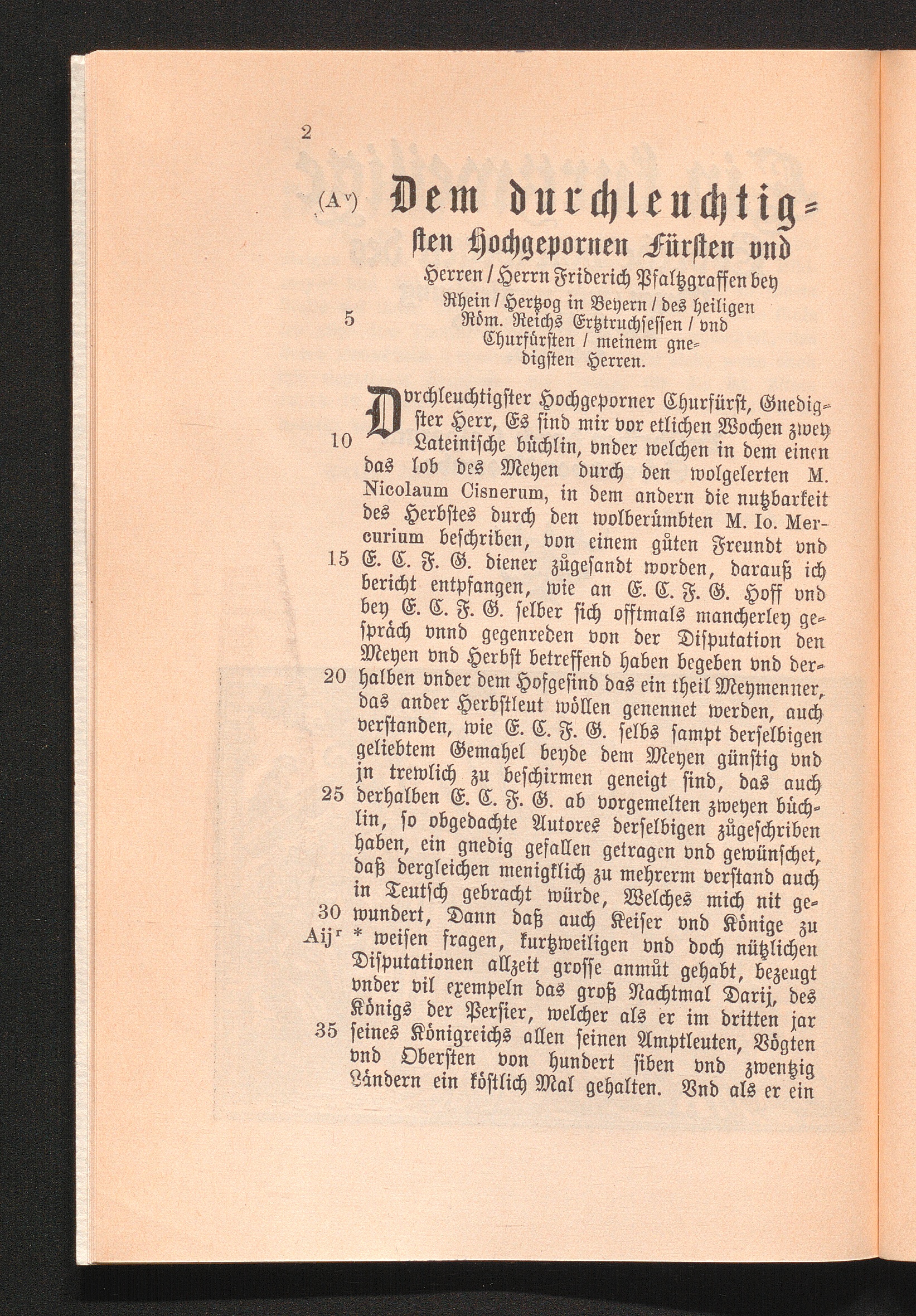Dem durchleuchtigsten Hochgepornen Fürsten vnd Herren / Herrn Friderich Pfaltzgraffen bey Rhein / Herzog in Beyern / des heiligen Röm. Reichs Ertztruchsessen / vnd Churfürsten / meinem gnedigsten Herren.