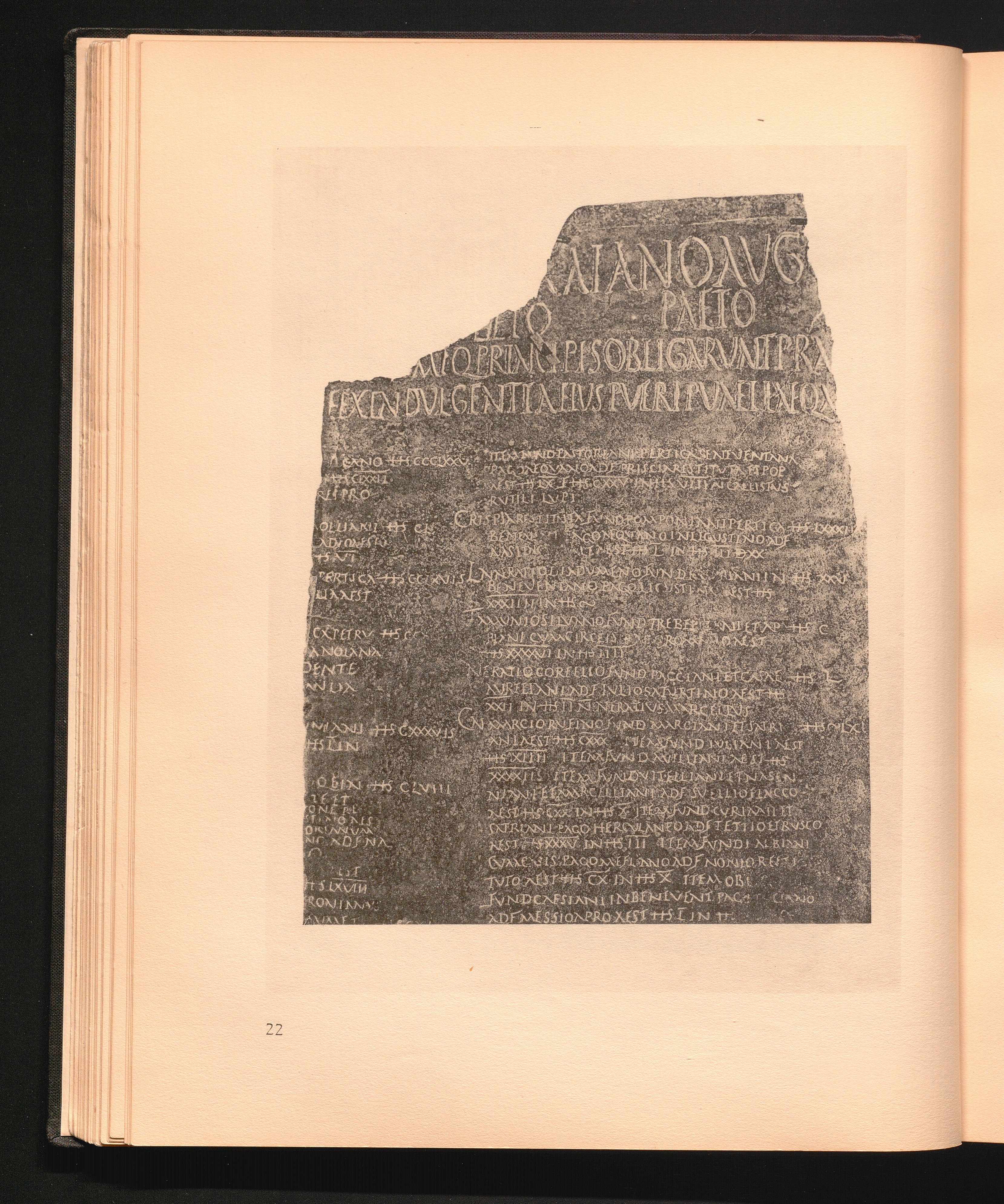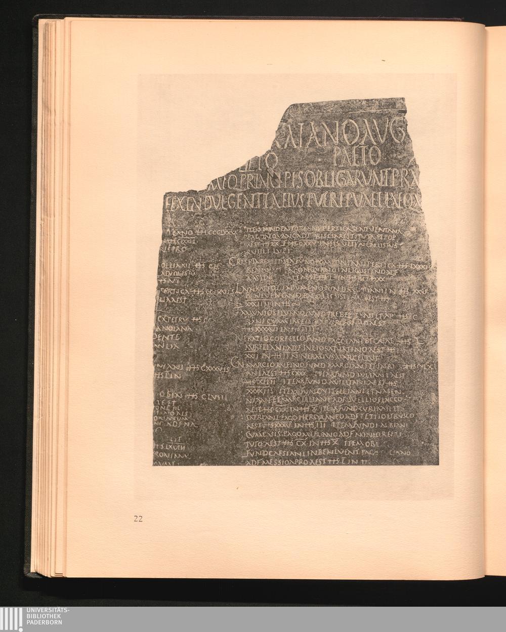 22 Tabula alimentaria Ligurum Baebianorum vom Jahre 101. Gravierte Kupferplatte.[...]