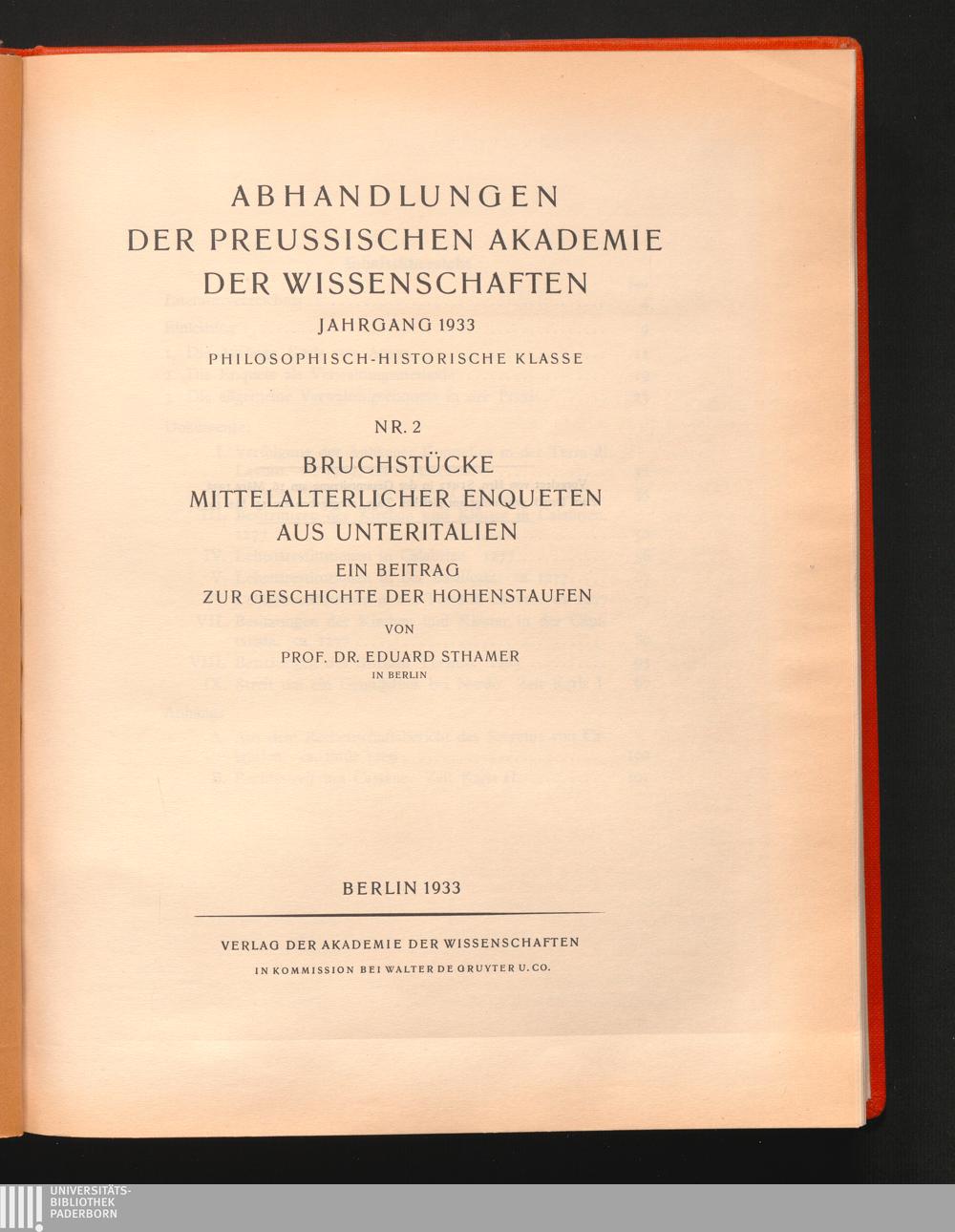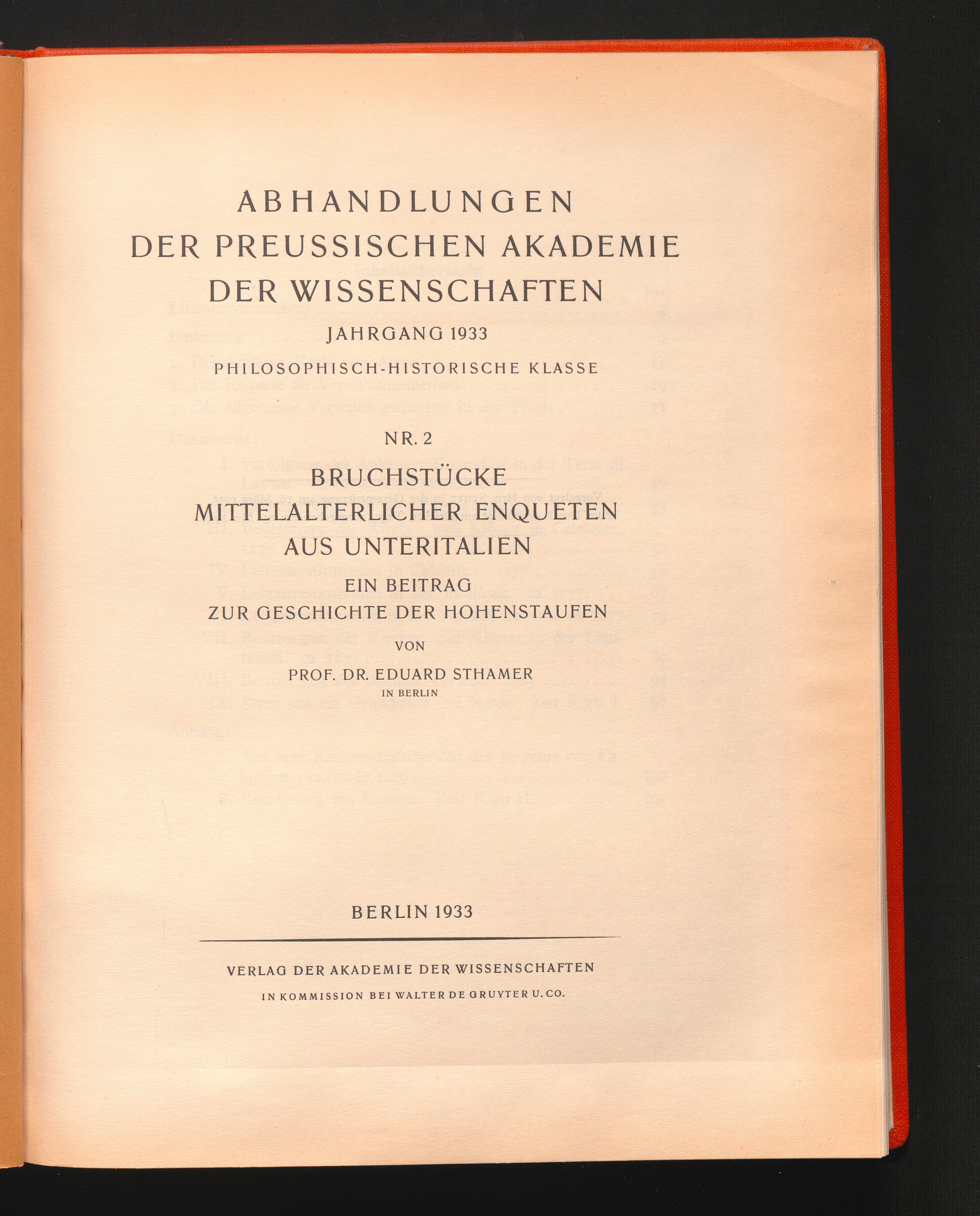 Bruchstücke mittelalterlicher Enqueten aus Unteritalien : ein Beitrag zur Geschichte der Hohenstaufen / von Eduard Sthamer