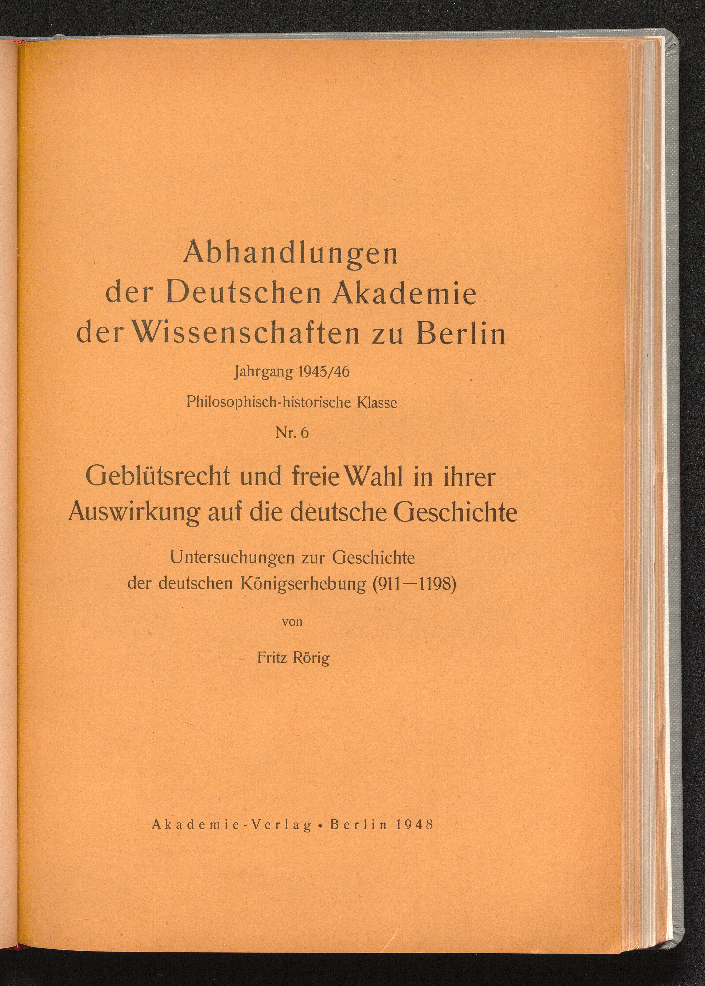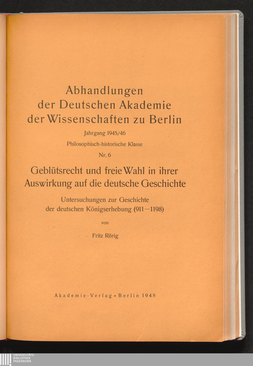 Geblütsrecht und freie Wahl in ihrer Auswirkung auf die deutsche Geschichte : Untersuchungen zur Geschichte der deutschen Königserhebung (911 - 1198) / von Fritz Rörig