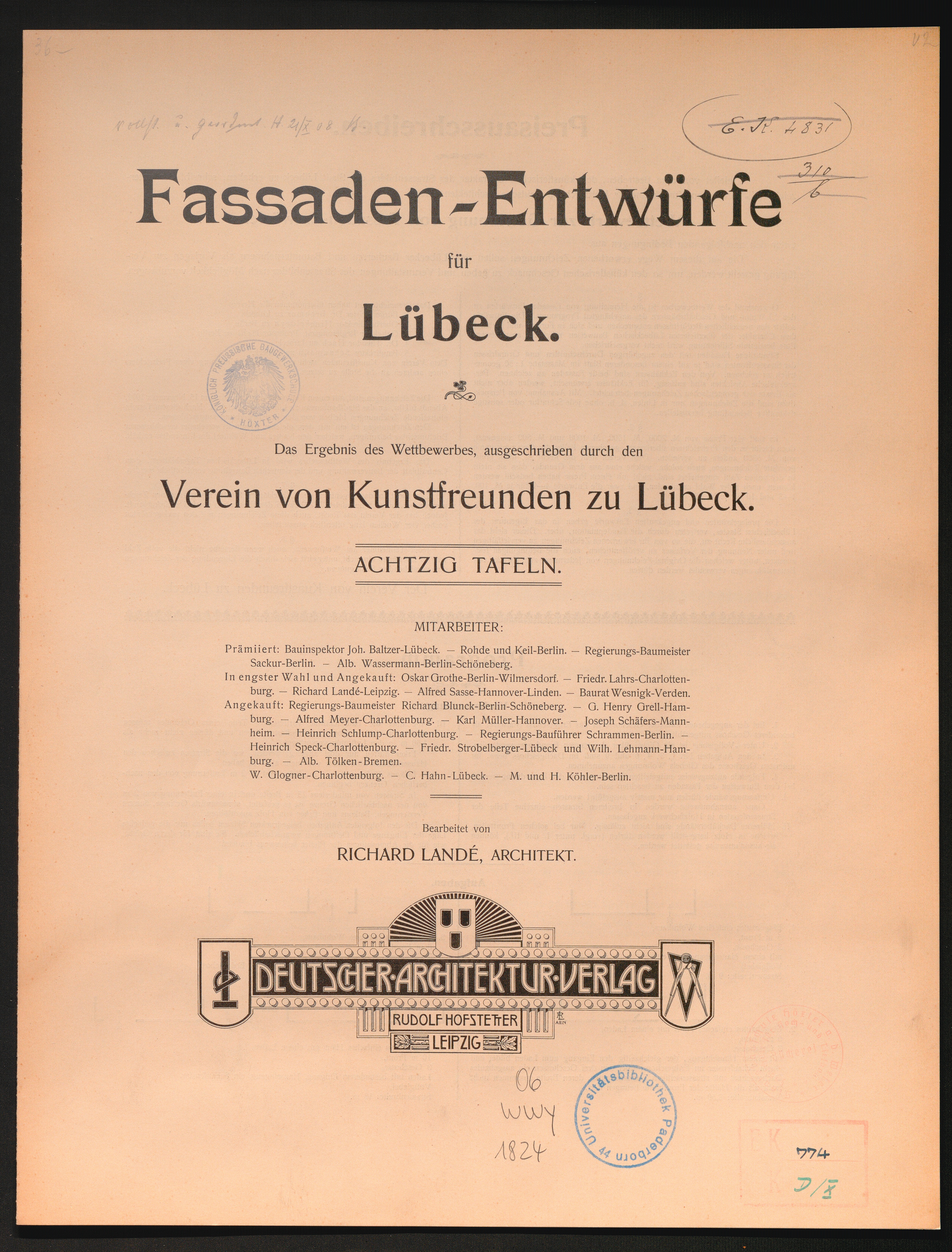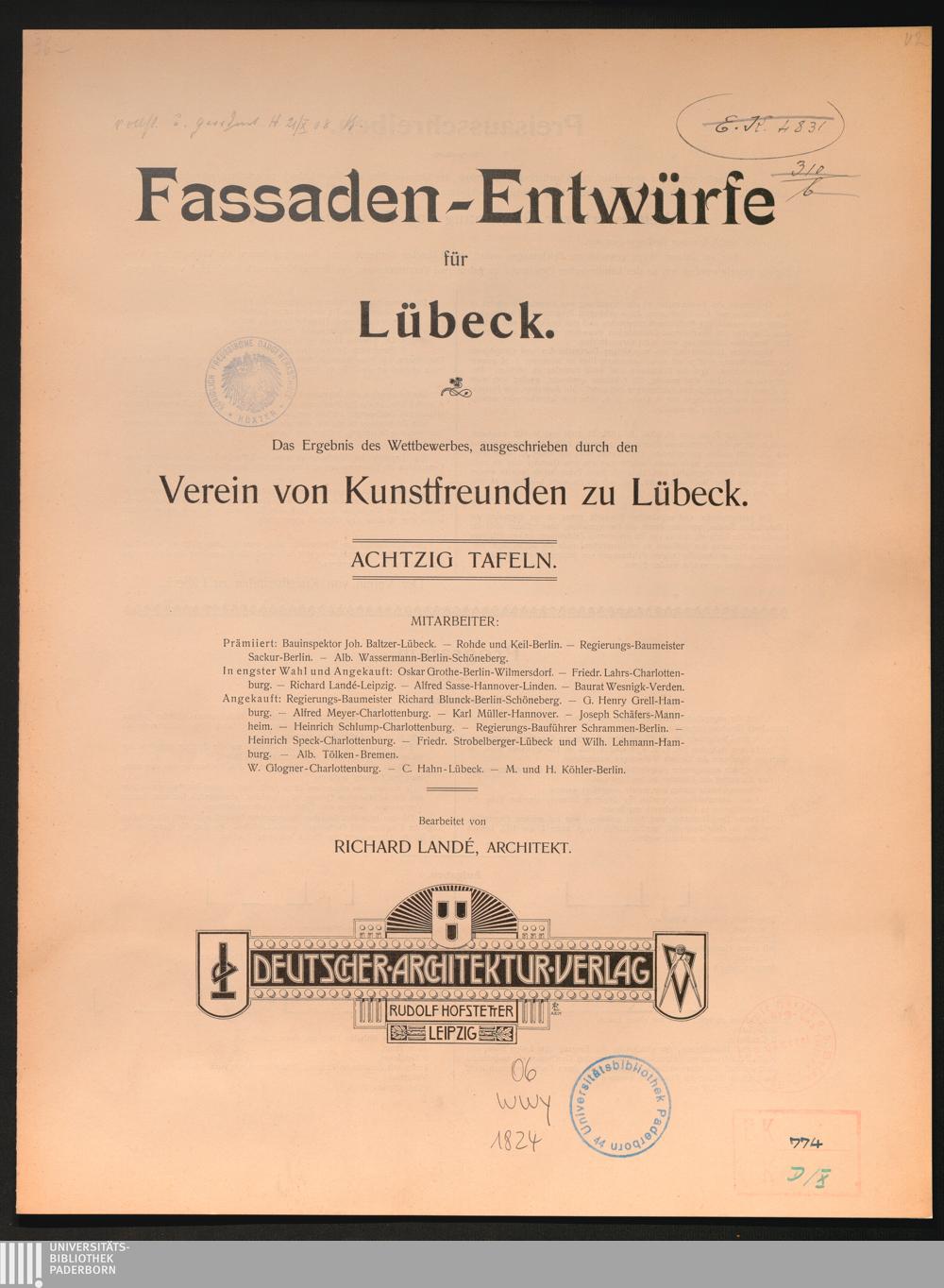 Fassaden-Entwürfe für Lübeck : das Ergebnis des Wettbewerbes, ausgeschrieben durch den Verein von Kunstfreunden zu Lübeck / bearb. von Richard Landé