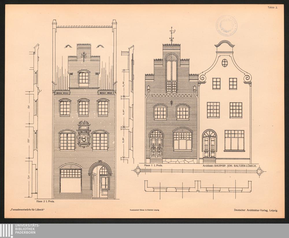 Tafel 2. Haus 2 1. Preis. Haus 1 1. Preis. Architekt: Bauinsp. Joh. Baltzer - Lü[...]