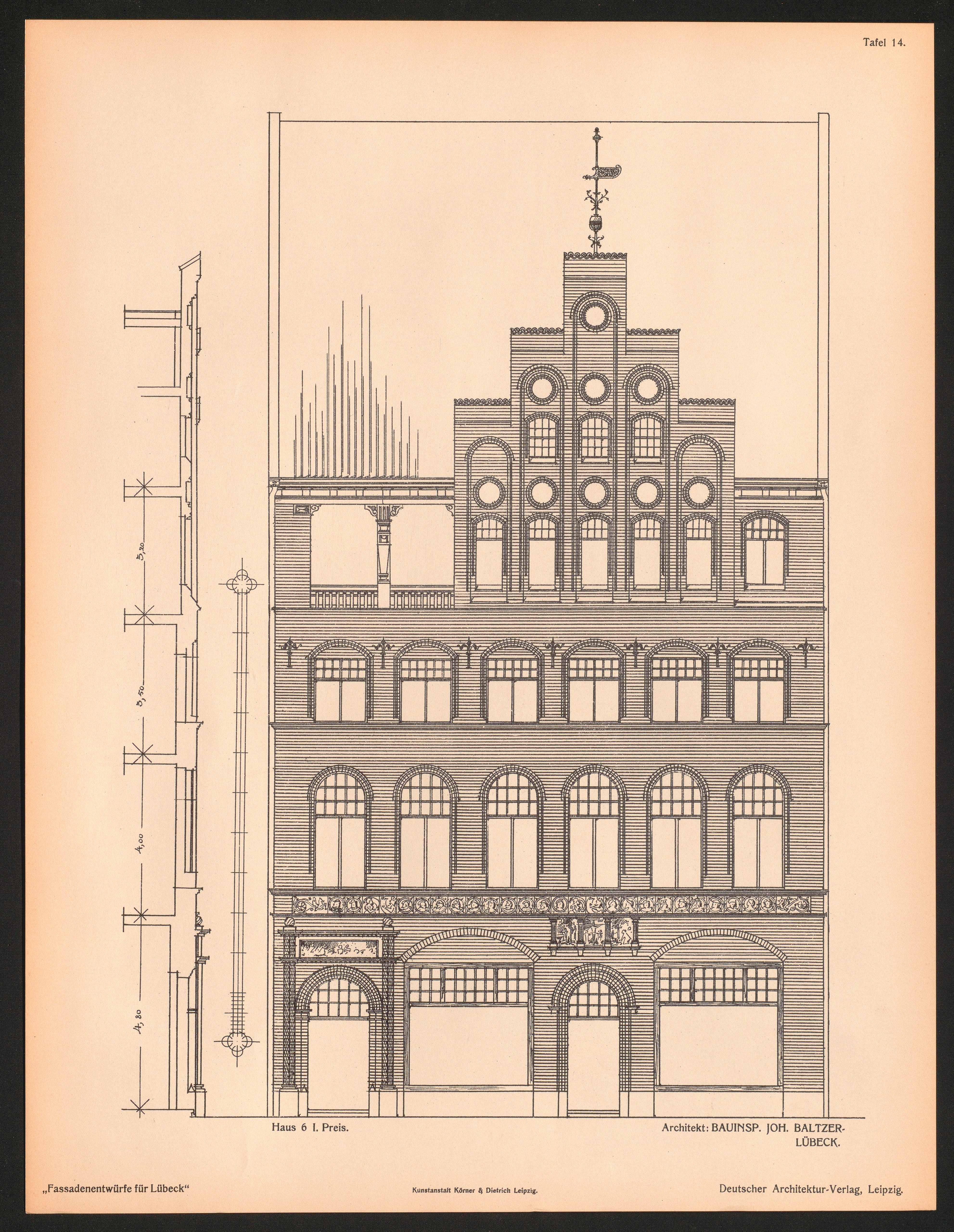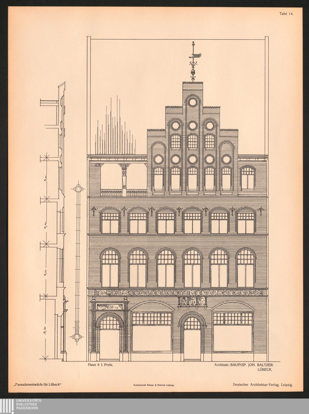 Tafel 14. Haus 6 I. Preis. Architekt: Bauinsp. Joh. Baltzer - Lübeck.