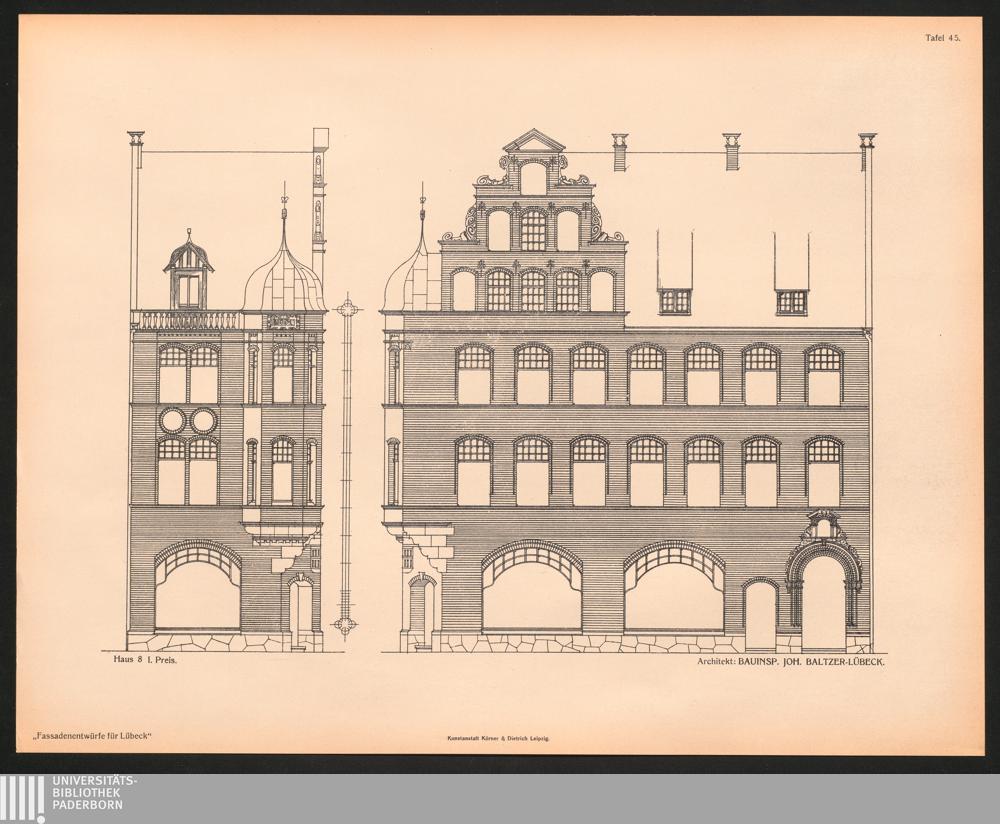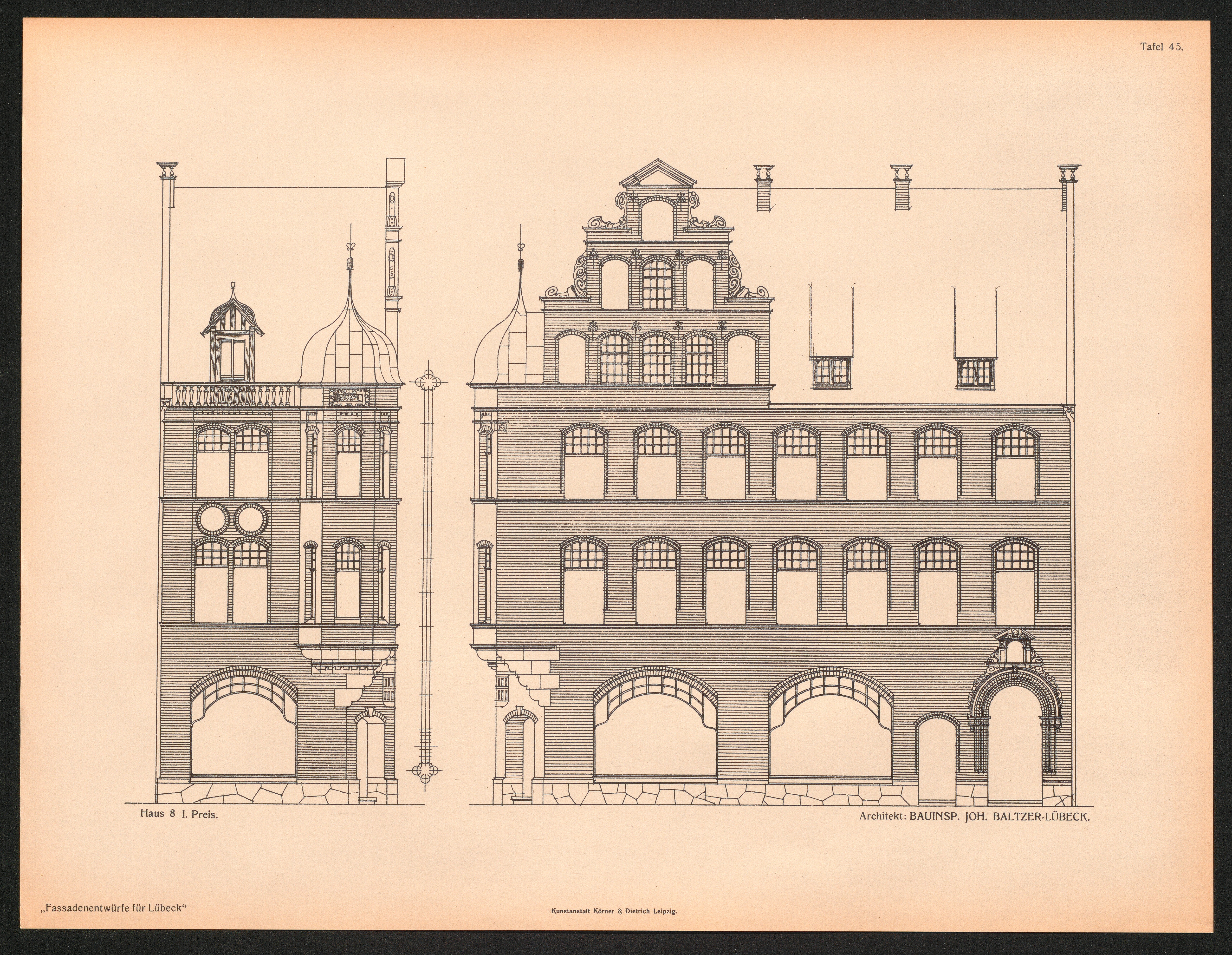 Tafel 45. Haus 8. I. Preis. Architekt: Bauinsp. Joh. Baltzer - Lübeck.