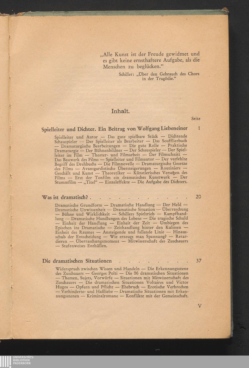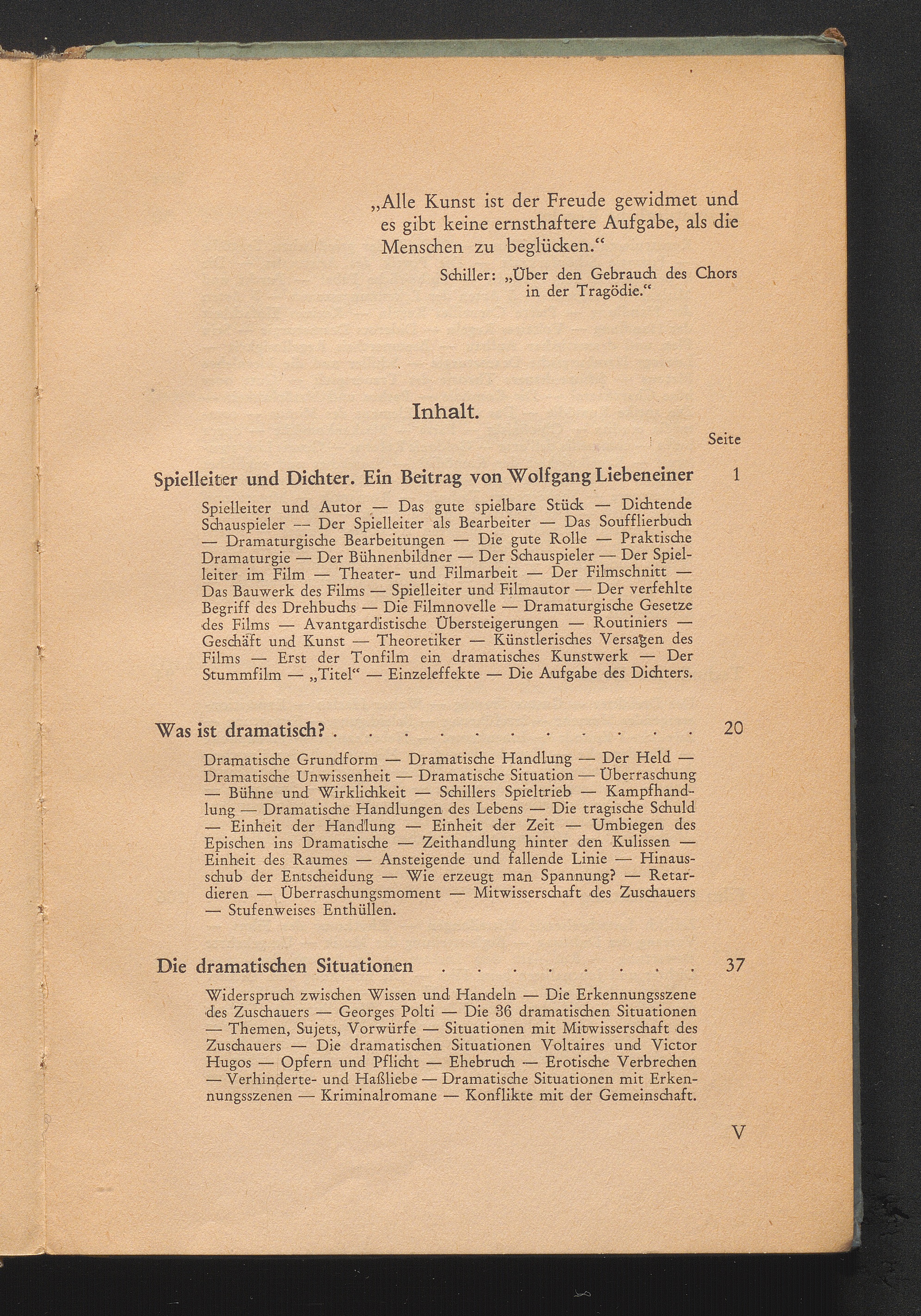 Spielleiter und Dichter. Ein Beitrag von Wolfgang Liebeneiner. Spielleiter und Autor - Das gute spielbare Stück - Dichtende Schauspieler - Der Spielleiter als Bearbeiter - Das Soufflierbuch - Dramaturgische Bearbeitungen - Die gute Rolle - Praktische Dramaturgie - Der Bühnenbildner - Der Schauspieler - Der Spielleiter im Film - Theater- und Filmarbeit - Der Filmschnitt - Das Bauwerk des Films - Spielleiter und Filmautor - Der verfehlte Begriff des Drehbuchs - Die Filmnovelle - Dramaturgische Gesetze ...