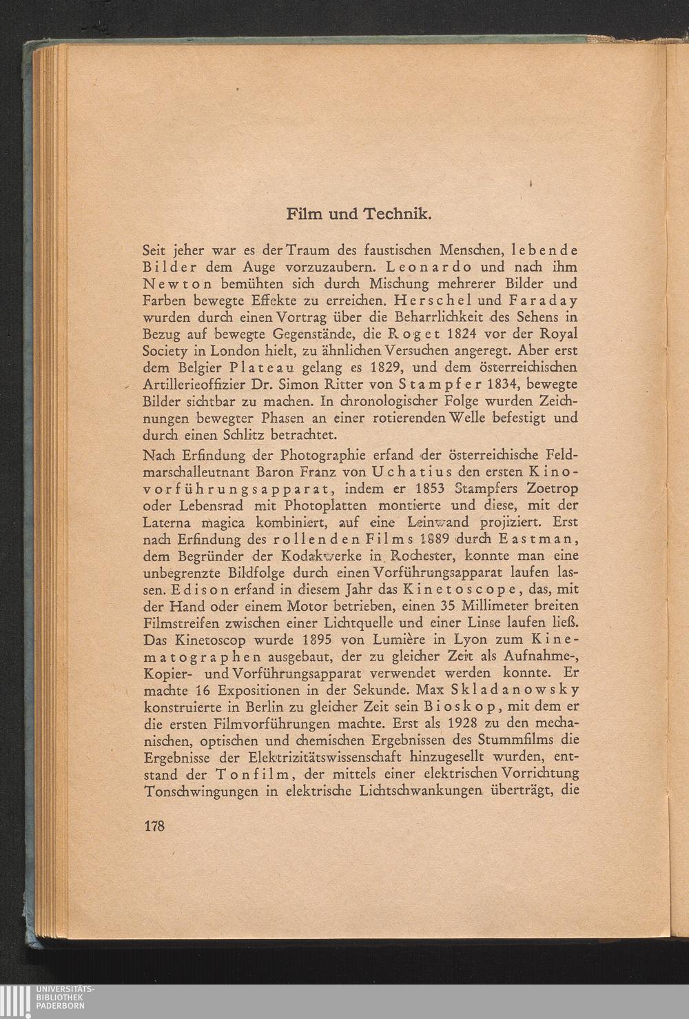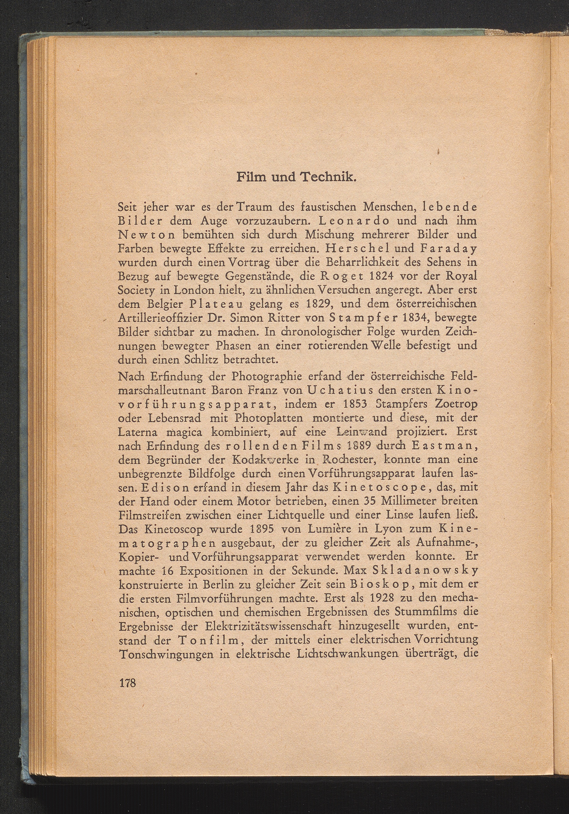 Film und Technik. Vom Kinetoscop zum Tonfilm - Leonardo, Newton, Plateau, Stampfer, Uchatius, Eastman, Edison, Skladanowsky - Bewegung und Rhythmus - Lebende Bilder - Farbfilm - Plastischer Film - Kunst und Technik - Natürliche Wirkung des Films - Dokumentarischer Film - Technische Möglichkeiten des Films - Synchronisation - Der filmische Raum - Die filmische Zeit - Künstlerischer Wert eines Films.