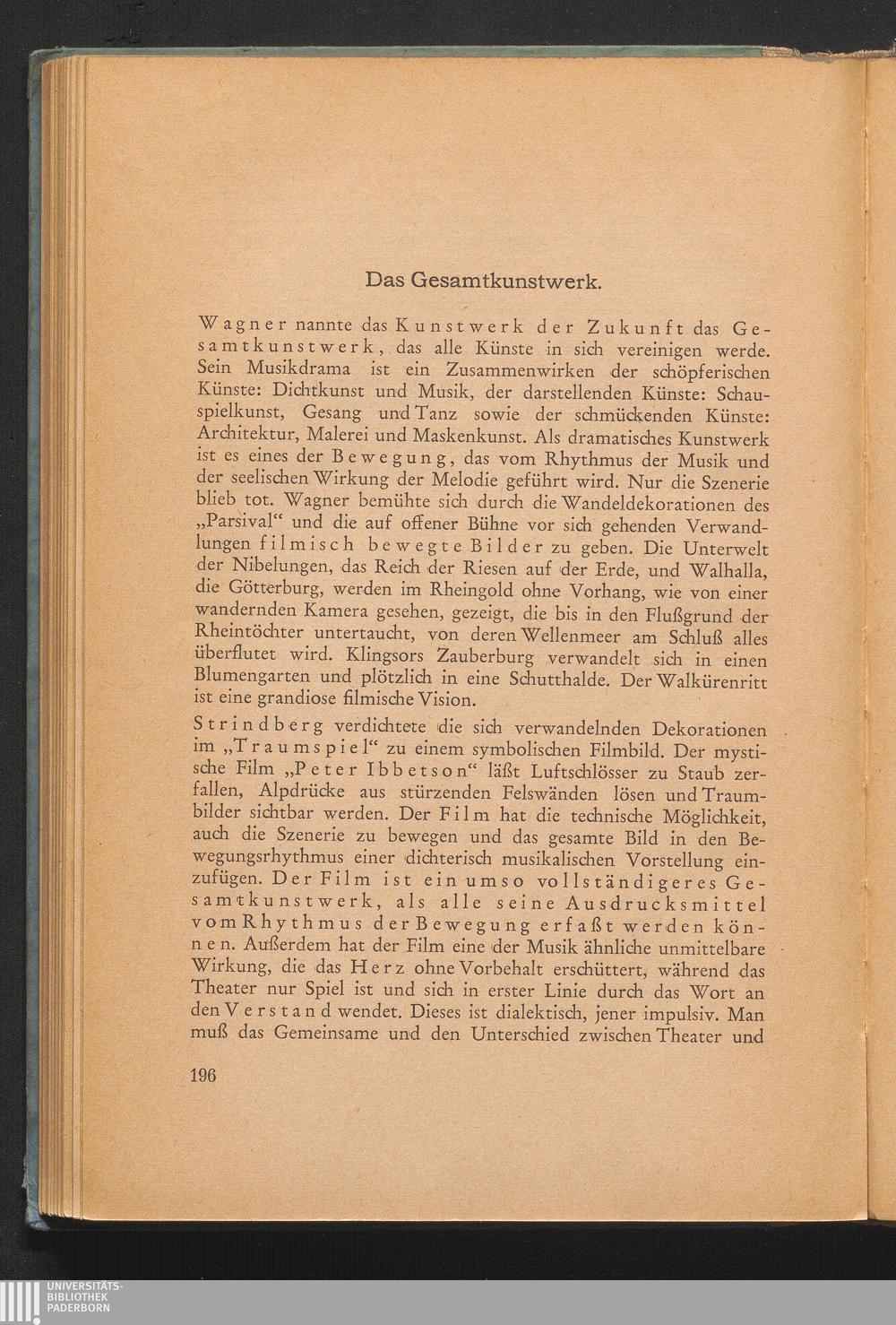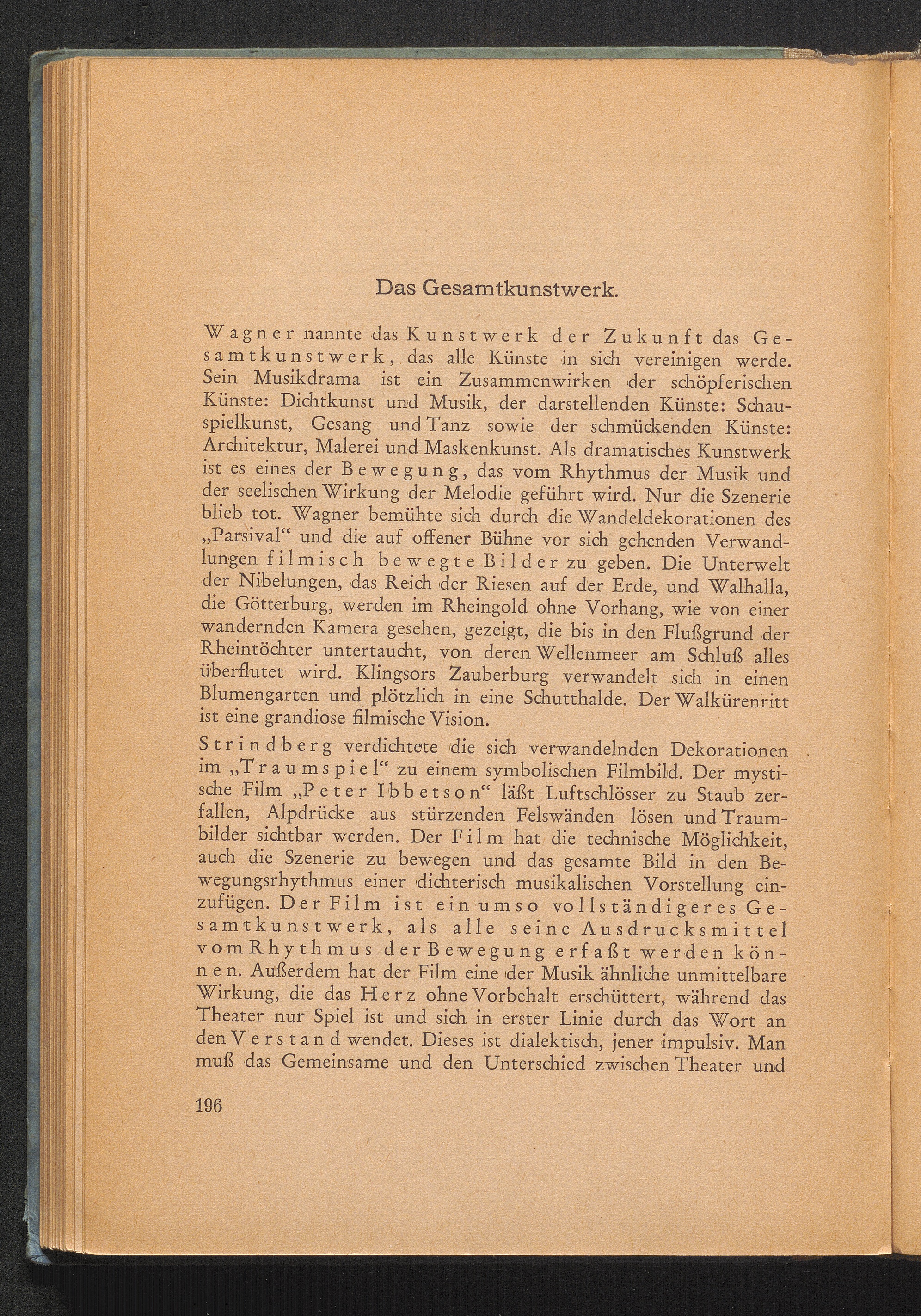 Das Gesamtkunstwerk. Wagners Kunstwerk der Zukunft - Rhythmus und Bewegung bei Musikdrama und Film - Theater und Film - Theater und Filmschauspieler - Subjektive und objektive Wirkung - Die Nuance - Das Requisit - Wirklichkeit und Illusion - Musik als Stimmungsmalerei - Das Gesamtkunstwerk - Oper und Erotik - Das Erbe des Musikdramas - Volkskunst des Alltags - Bildersprache - Urbilder der Handlungen - Allgewalt der Musik - Musik und Wille - Nietzsches „Geburt der Tragödie aus dem Geiste der Musik - ...