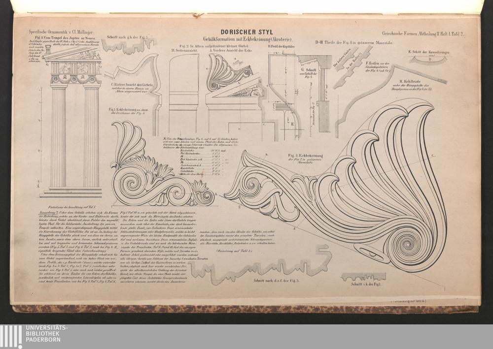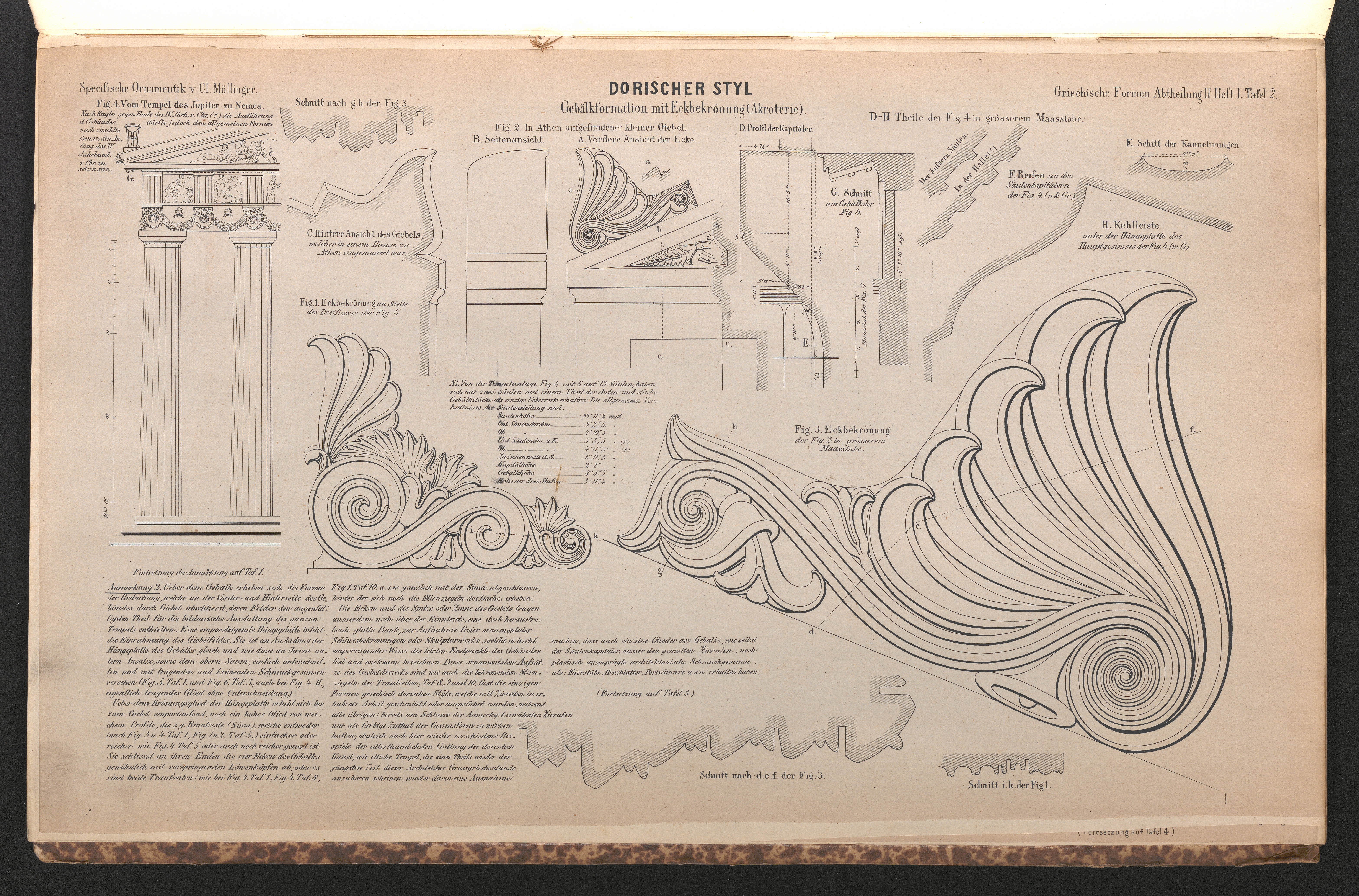 Tafel IV. Fig. 1. Säulenstellung mit Gebälkecke und Giebelansatz des Parthenon in Athen. Fig. 2. Eckbekrönung (eigentliche Eckziegel) in Athen gefunden und mit Schnittrissen in grösserem Masstabe gezeichnet, wahrscheinlich zu den Propyläen gehörig.