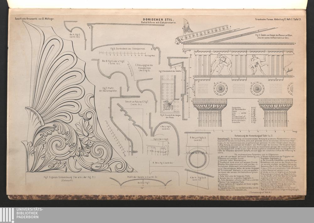 Tafel III. Theile des Gebälkes vom Theseustempel zu Athen: Fig. 1. Ergänzte Eckbekrönung der Giebel in grösserem Masstabe. Fig. 2. Gebälkecke mit Berücksichtigung der gemalten zierratlichen Formen. Fig. 3. Durchschnitt des Gebälks. Fig. 4. Grundriss der Mutulen. Fig. 5. A.B.C. Detail der Triglyphen in w. Gr. Fig. 5. D.E.F. Detail der Nagelköpfe der Mutulen und Triglyphen in w. Gr.Fig. 6. Durchschnitt des Giebelgesimses. Fig. 6. A.B.C. Profile der Krönungsglieder des Kranzgesimses und unter der (...)