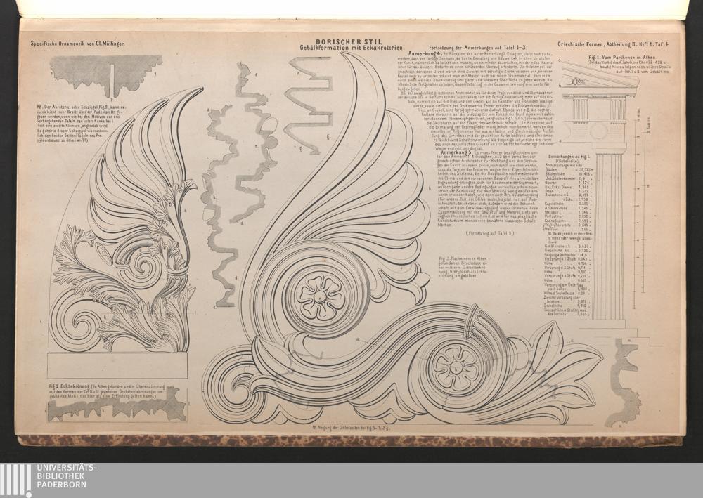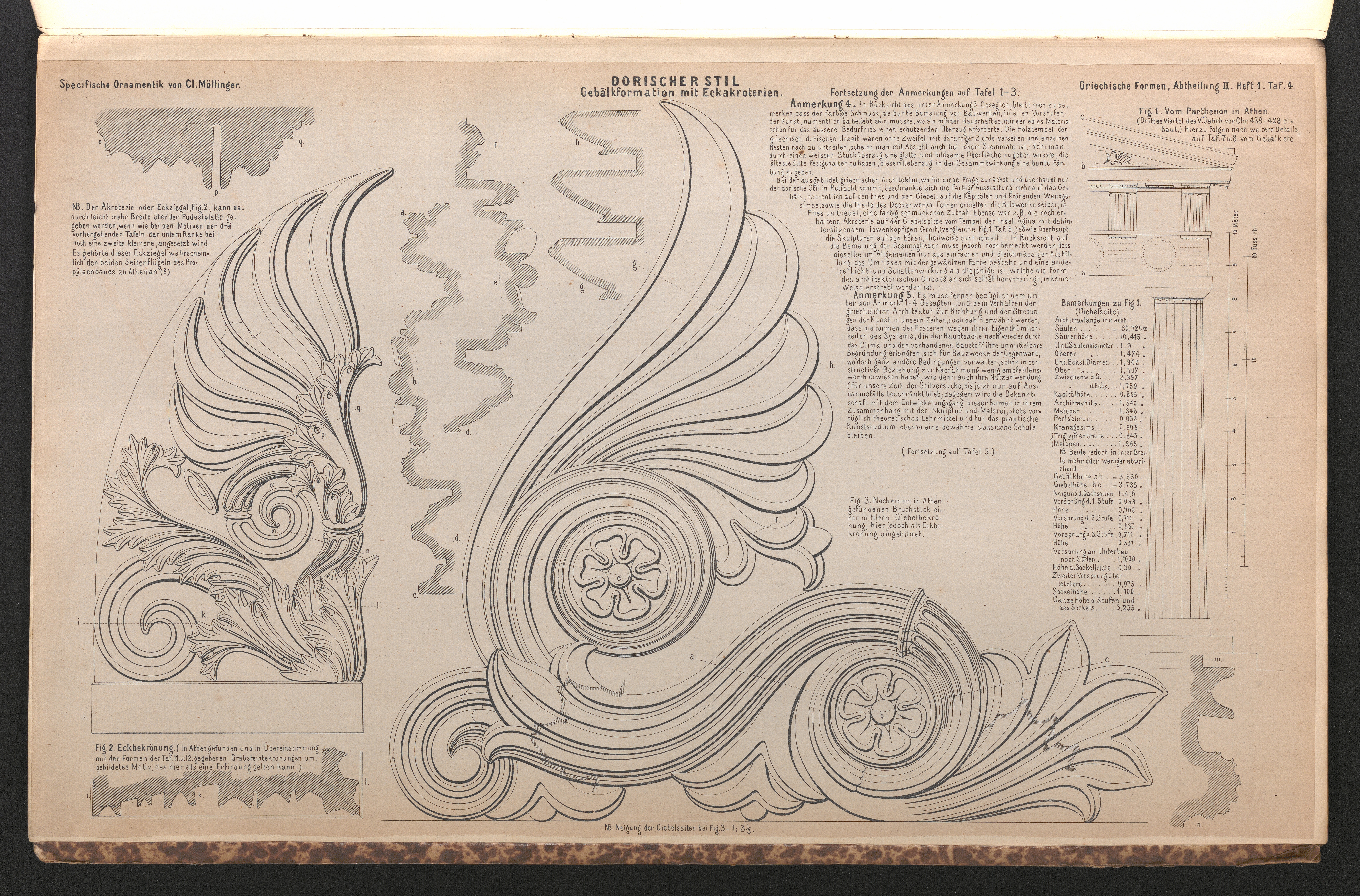 Tafel IV. Fig. 1. Säulenstellung mit Gebälkecke und Giebelansatz des Parthenon in Athen. Fig. 2. Eckbekrönung (eigentliche Eckziegel) in Athen gefunden und mit Schnittrissen in grösserem Masstabe gezeichnet, wahrscheinlich zu den Propyläen gehörig.