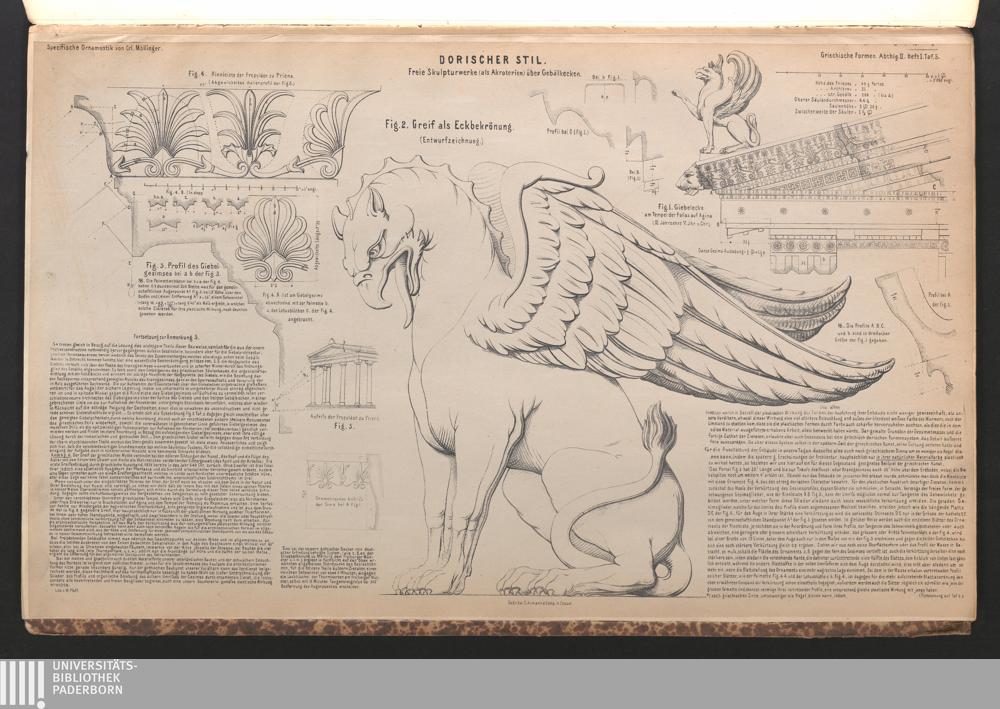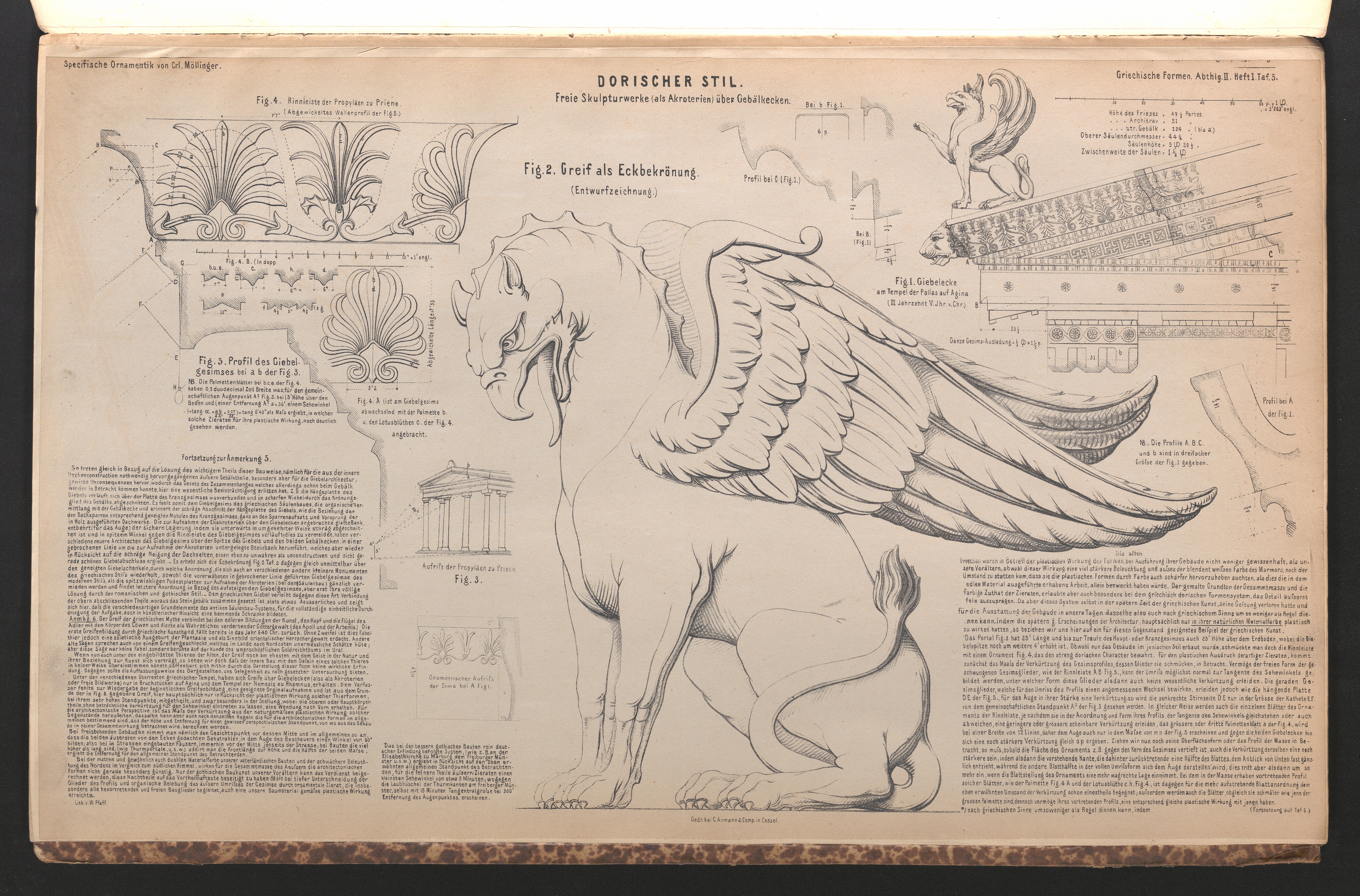 Tafel V. Fig. 1. Giebelecke vom Tempel der Pallas aud Aegina, nebst Durchschnitt des Giebelgesimses. Fig. 1. A.B.C. Profile der Sima, der Traufe der hängenden Platte und des Krönungsgliedes der h. P.; Detail der Triglyphen in gr. Masstabe. Fig. 2. Greif als Eckbekrönung in grossem Masstabe. Fig. 2. Greif als Eckbekrönung in grossem Masstabe. Fig. 3. Skelett der ionischen Durchgangshalle oder der Propyläen zu Priene. Fig. 4. Abgewickeltes Wellenprofil der Rinnleiste an den Propyläen, in Bezug auf die (...)